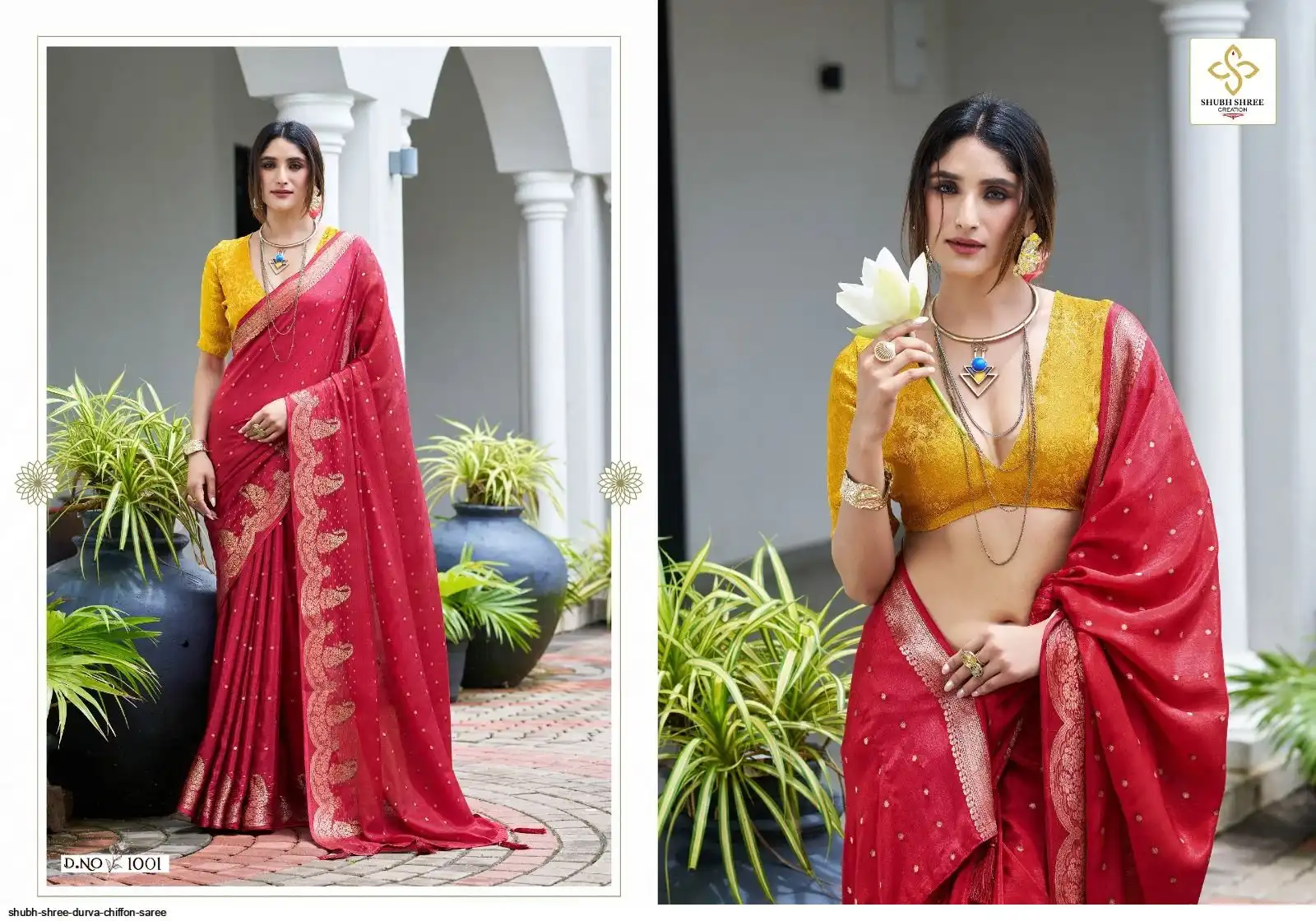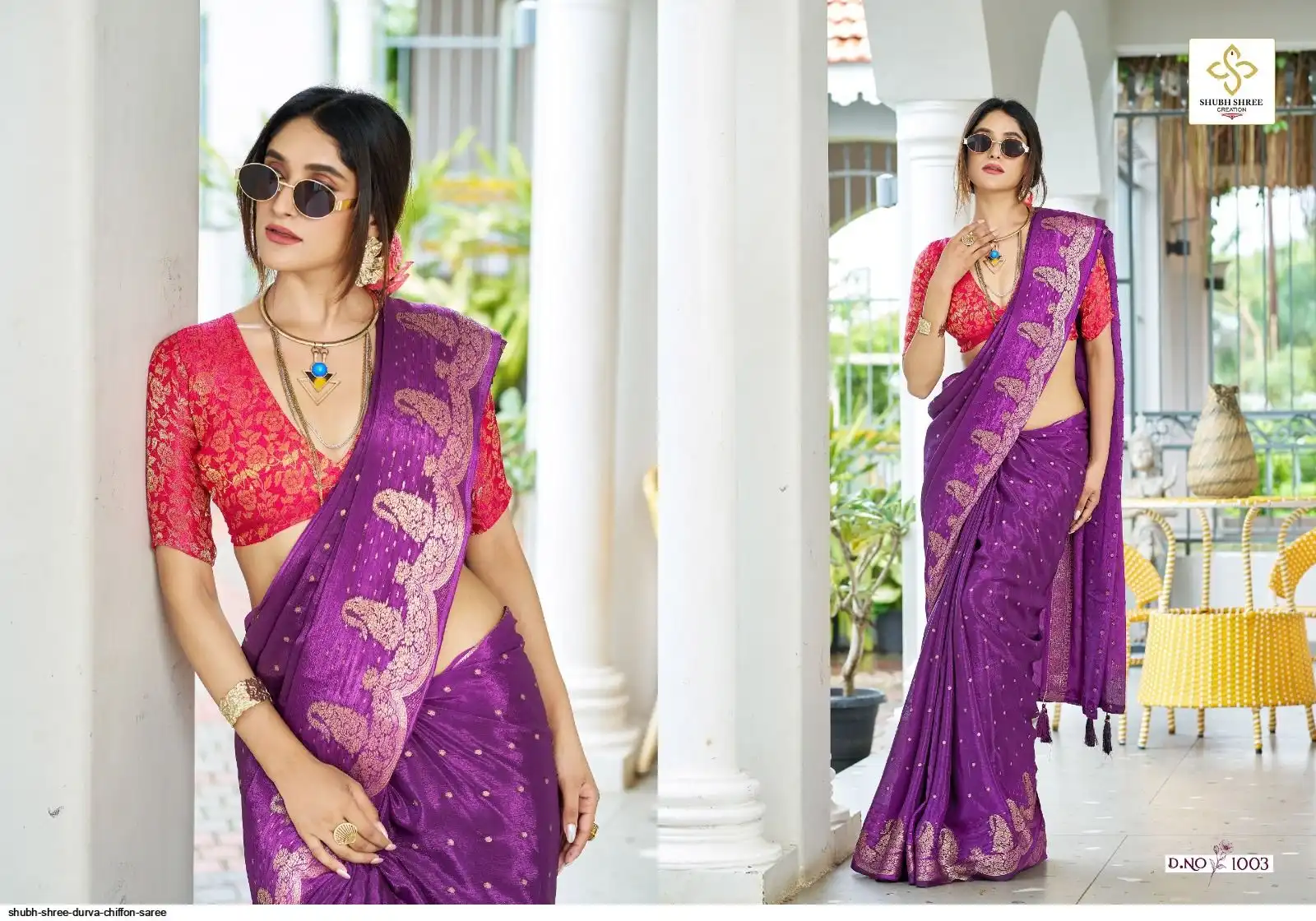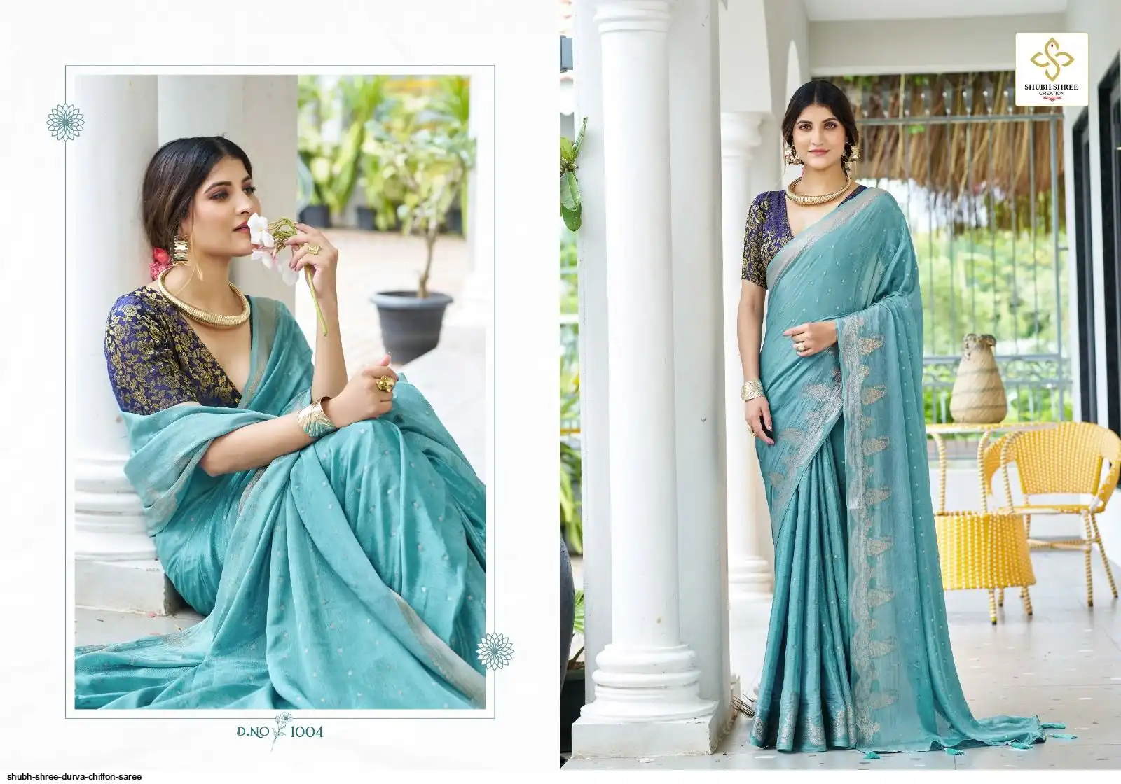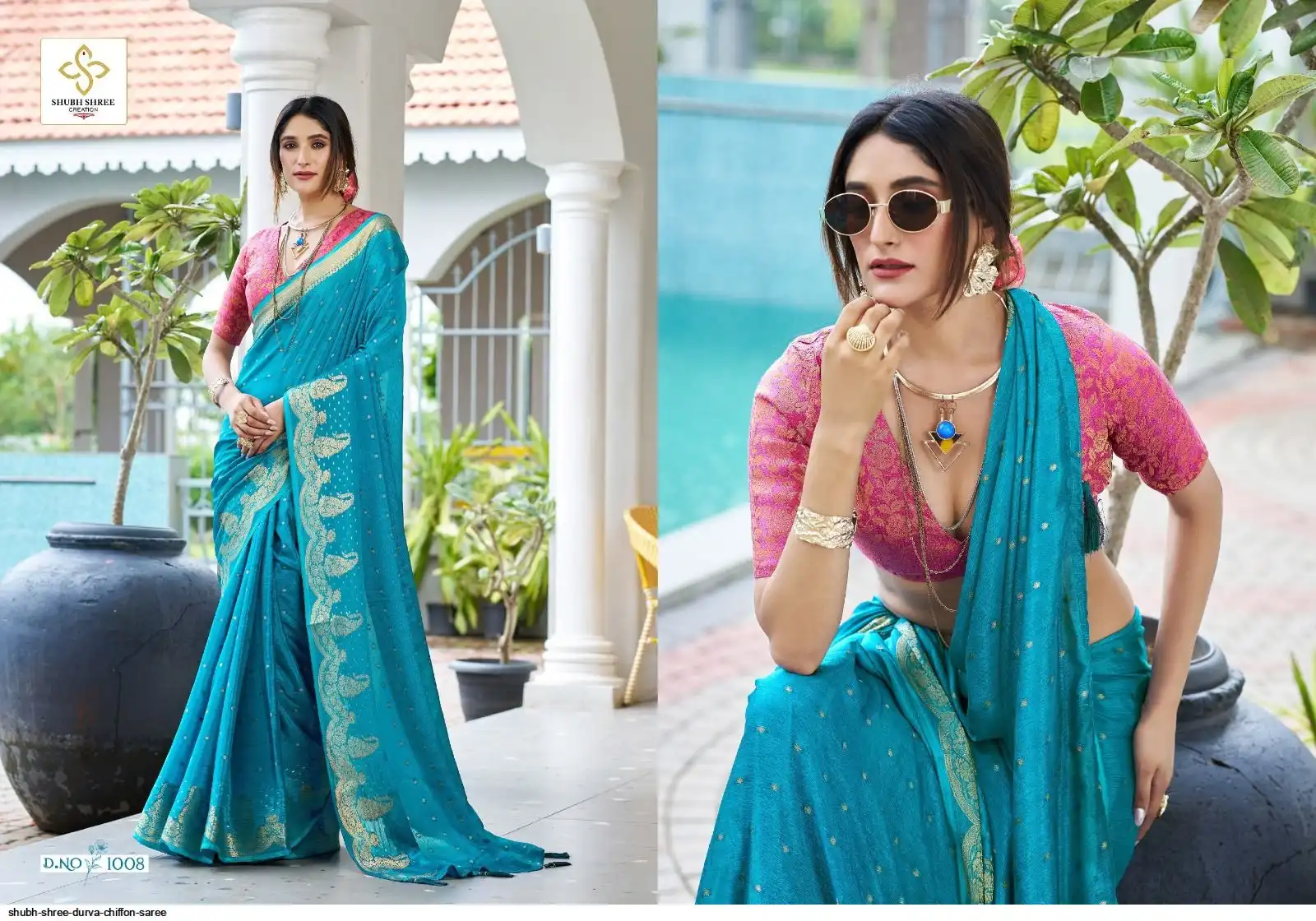 FABRIC - ALFINO CHIFFON JACQUARD BORDER , BUTTY WITH NYLON DYABLE JACQUARD BLOUSE , WITH SPRING TUSSELLS , EXCLUSIVE DYING FRESH BRIGHT COLOUR RANGE
