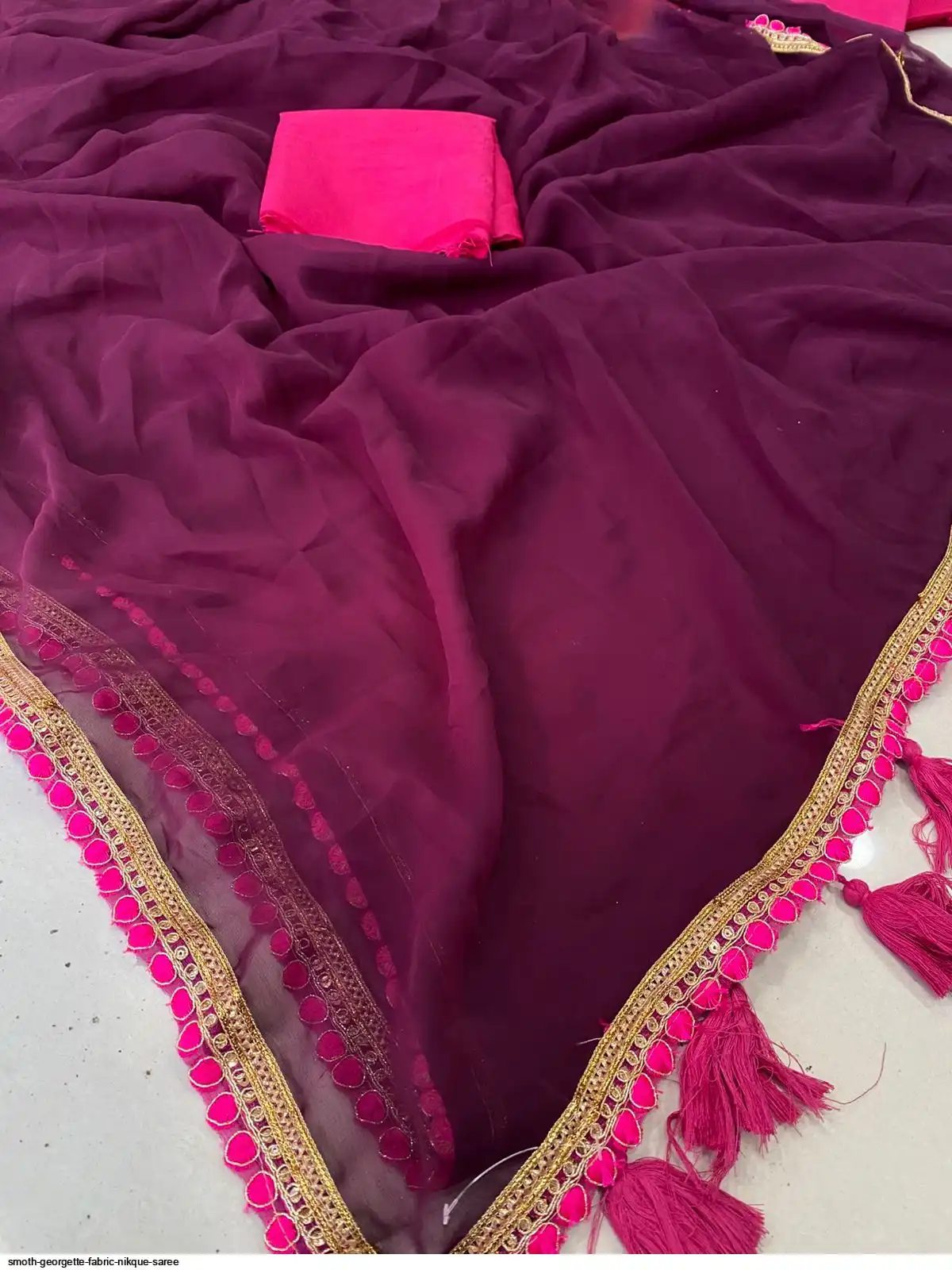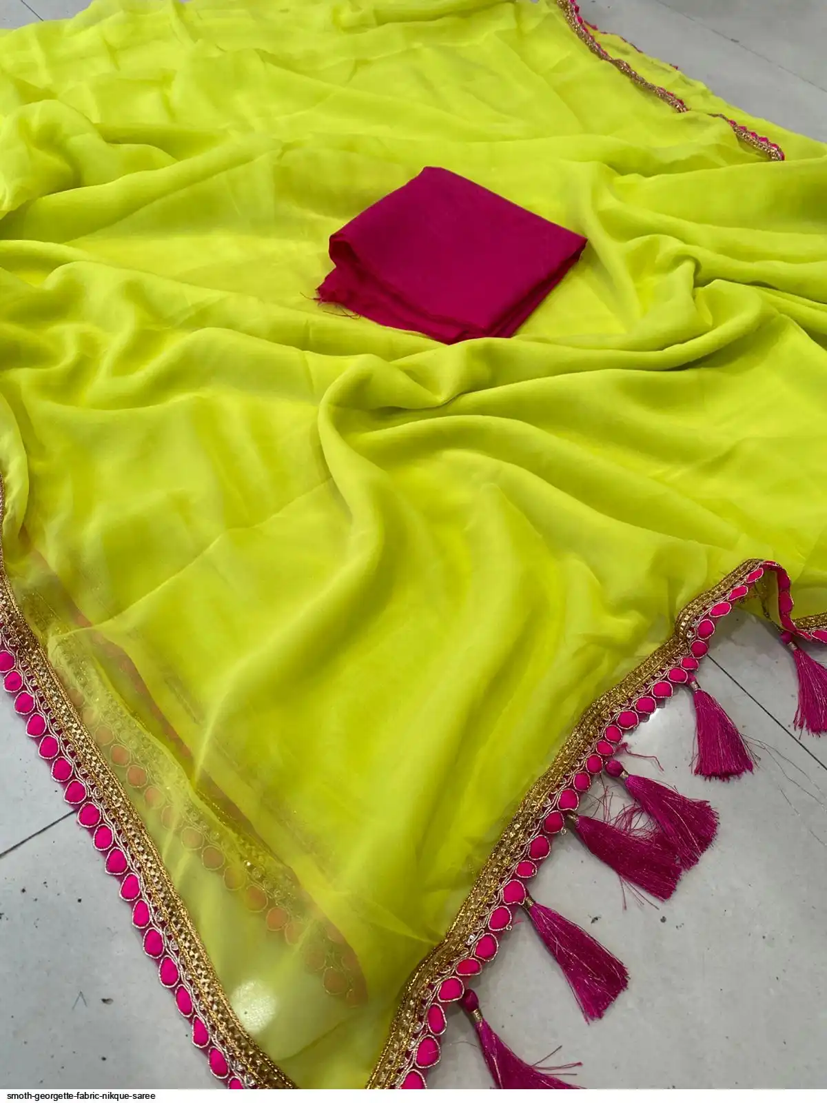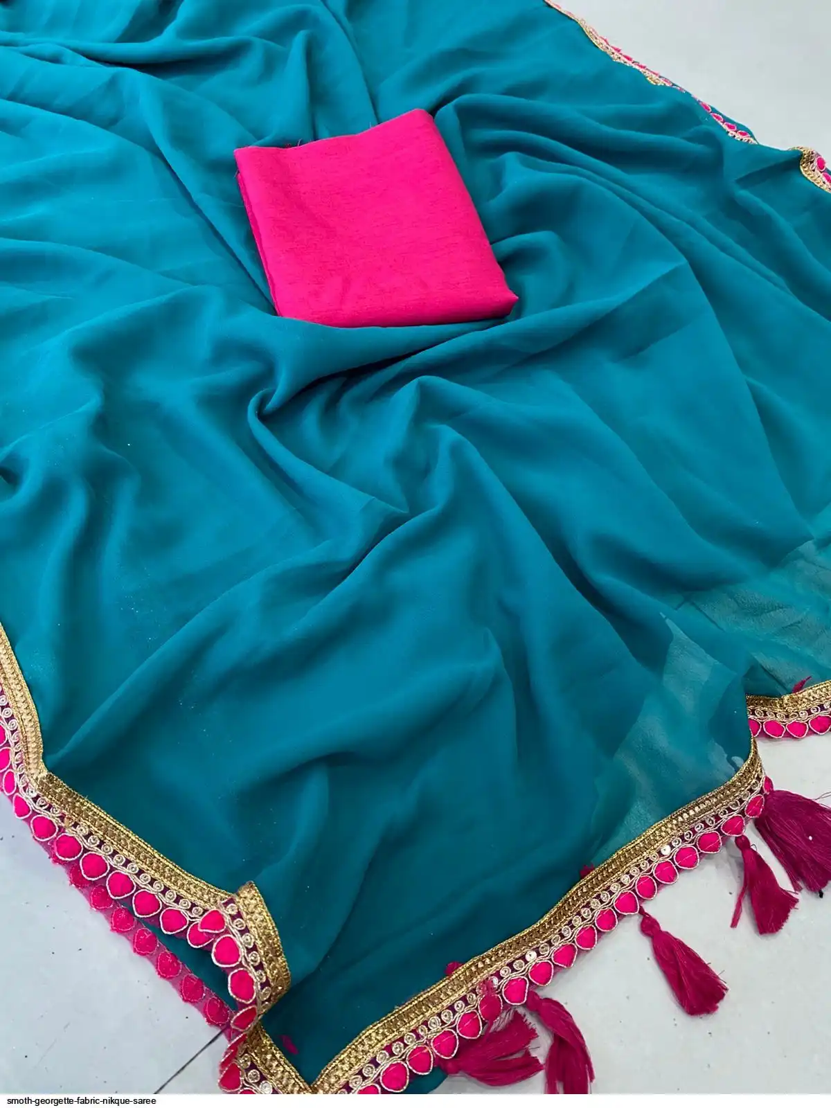 Smoth Georgette fabric with beautiful embroidery lace border with beautiful latkan….