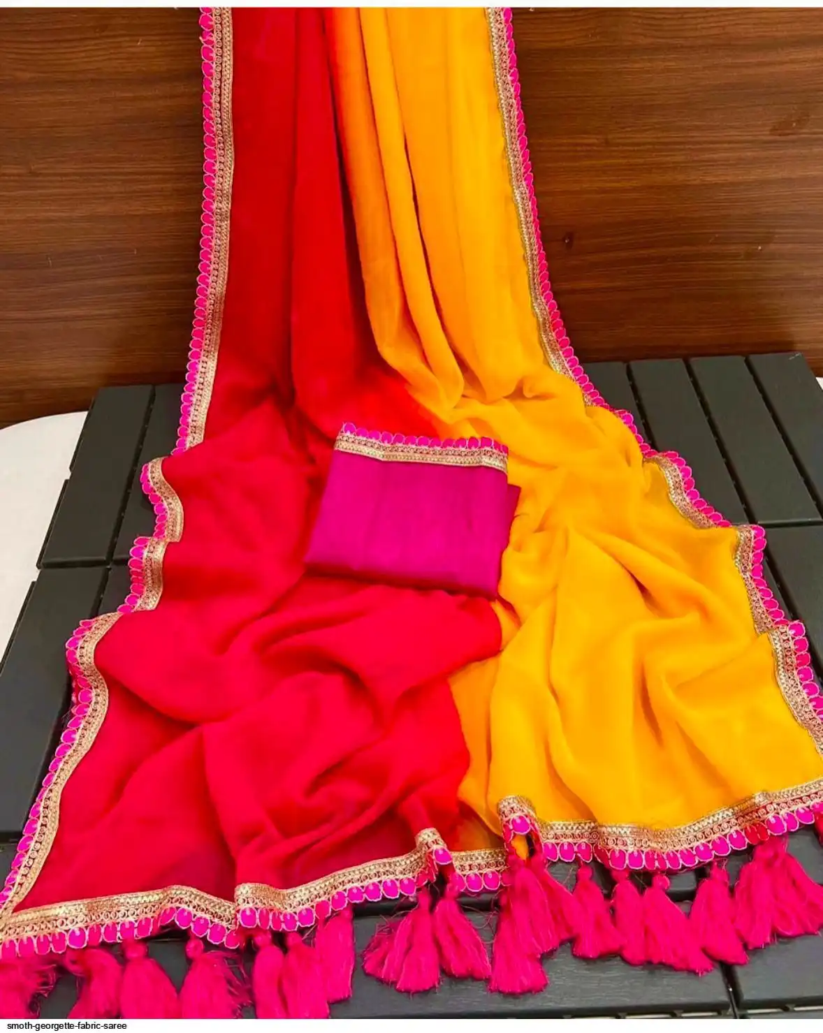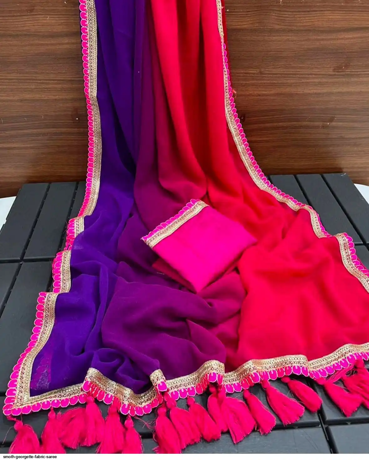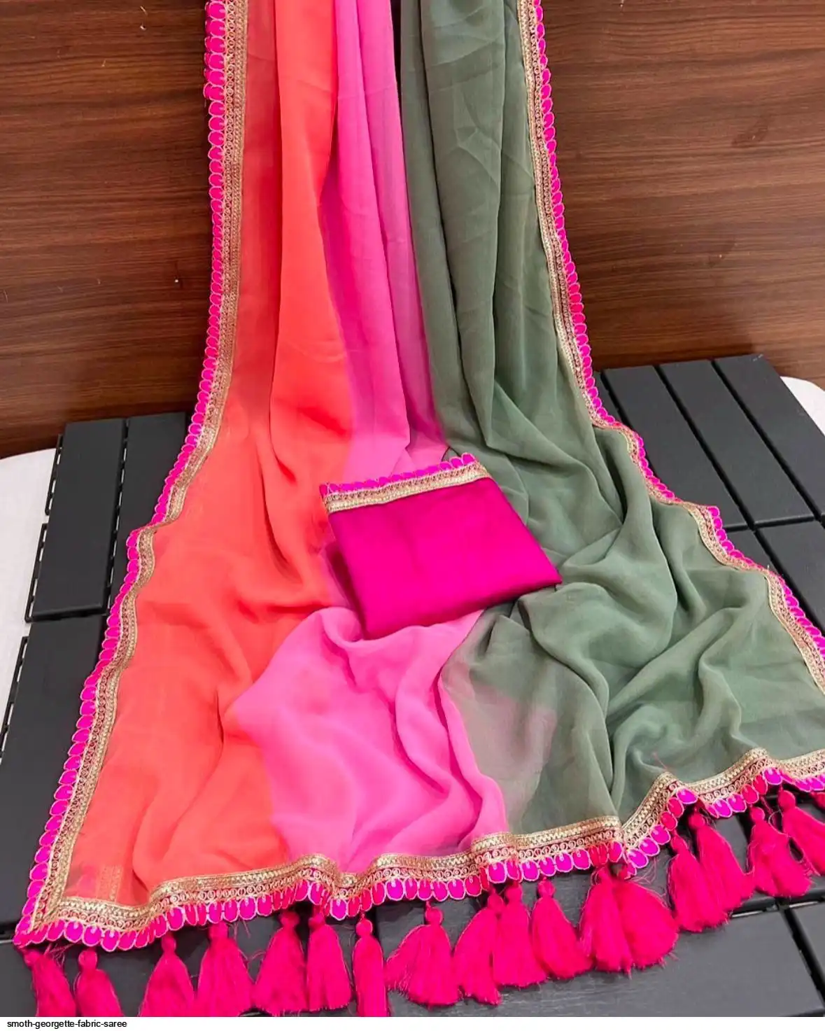 Smoth Georgette fabric with beautiful embroidery lace border with beautiful latkan….