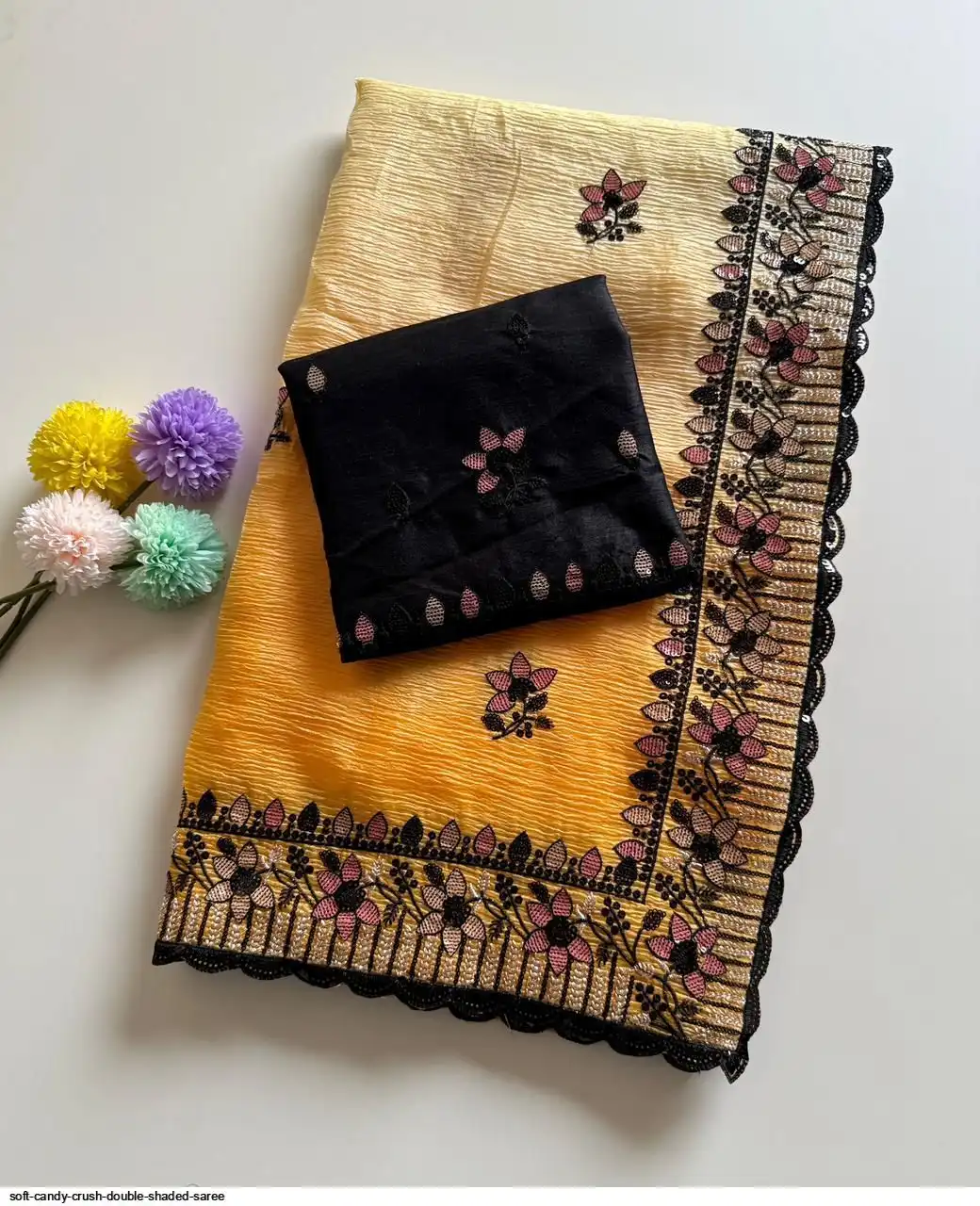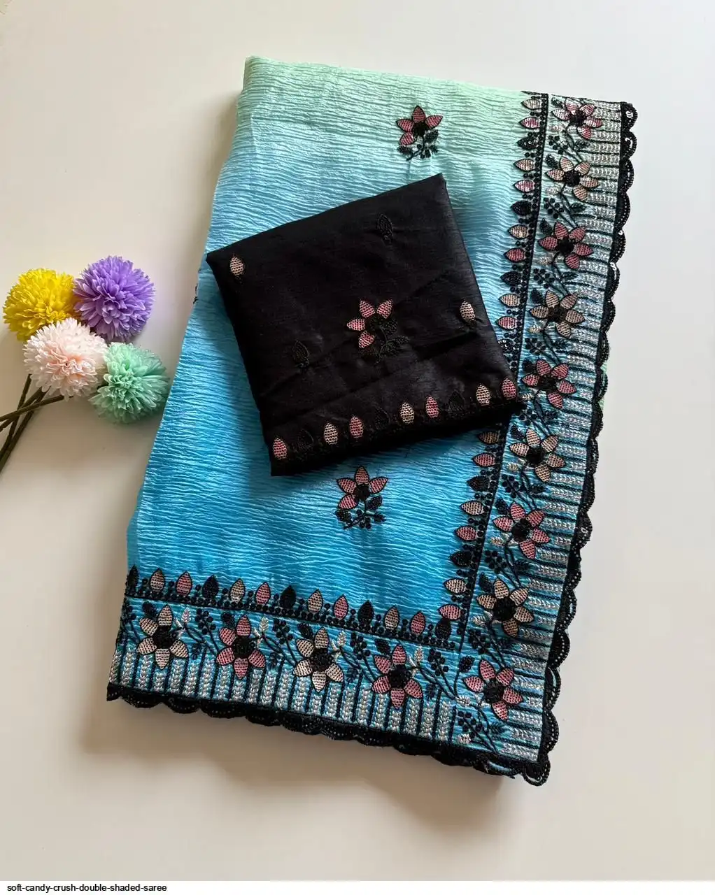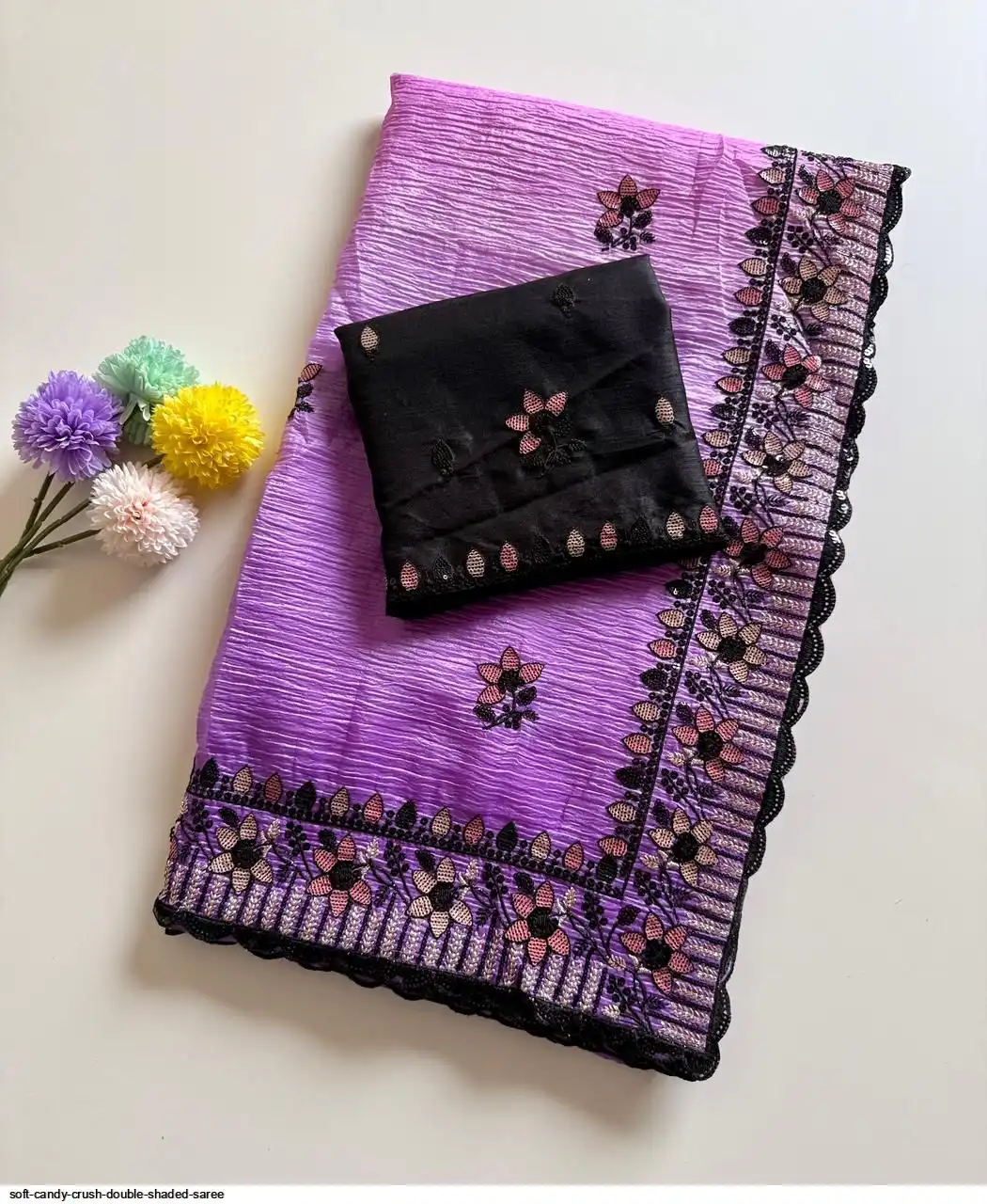 Fabric - Soft Candy Crush Double Shaded Peding Fabric With Black Multi Sequence Embroidery Work And Contrast Embroidery Work Blouse
