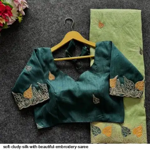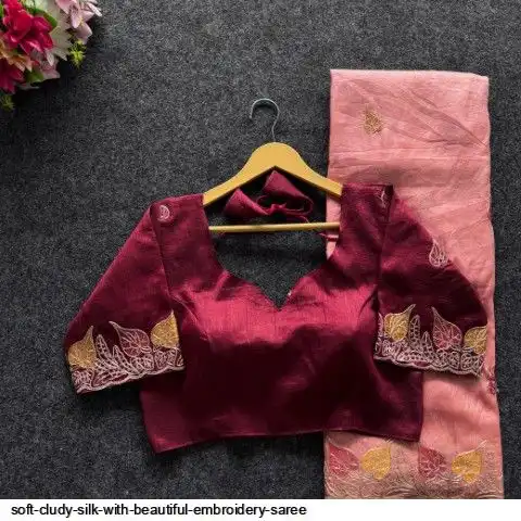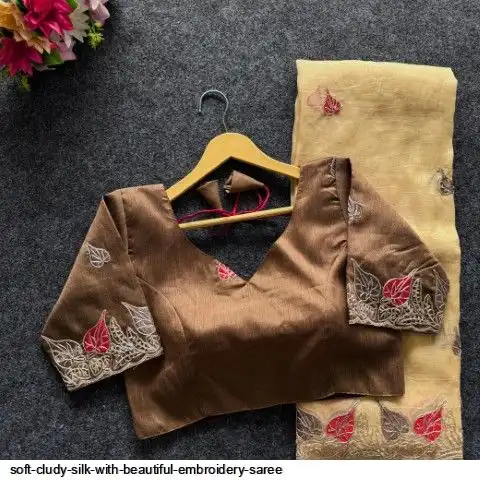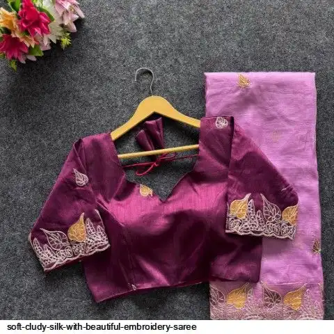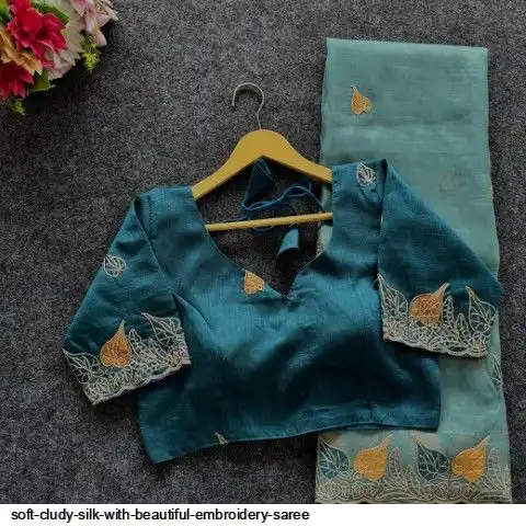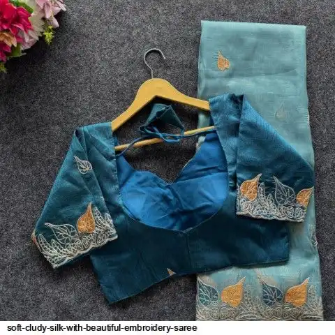 Soft cludy silk saree with beautiful embroidery and thread work all over and unstitch silk blouse with work