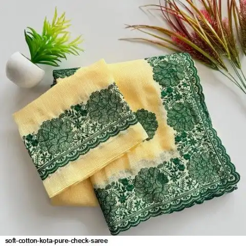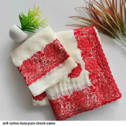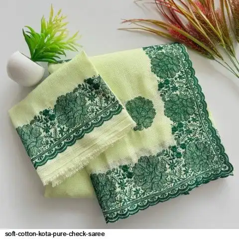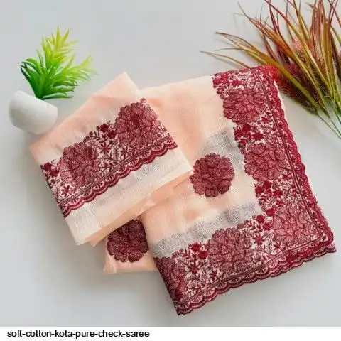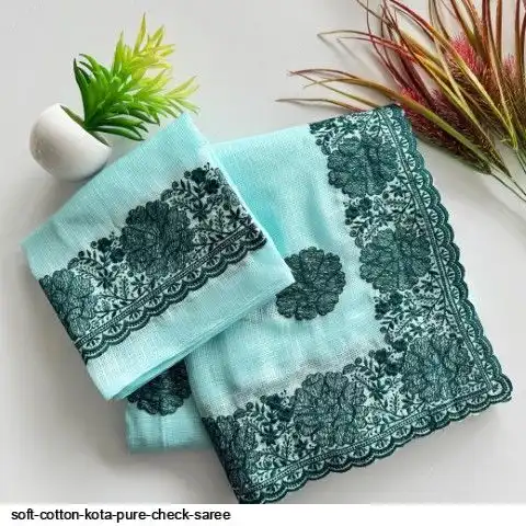 Soft cotton kota check saree with beautiful lucknowi embroidery work all over saree and running blouse with work