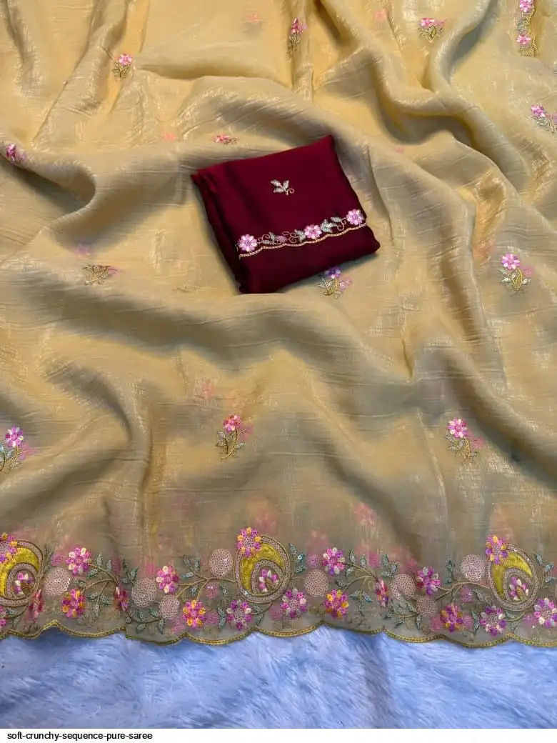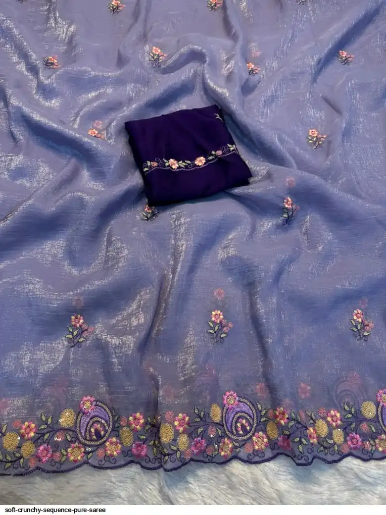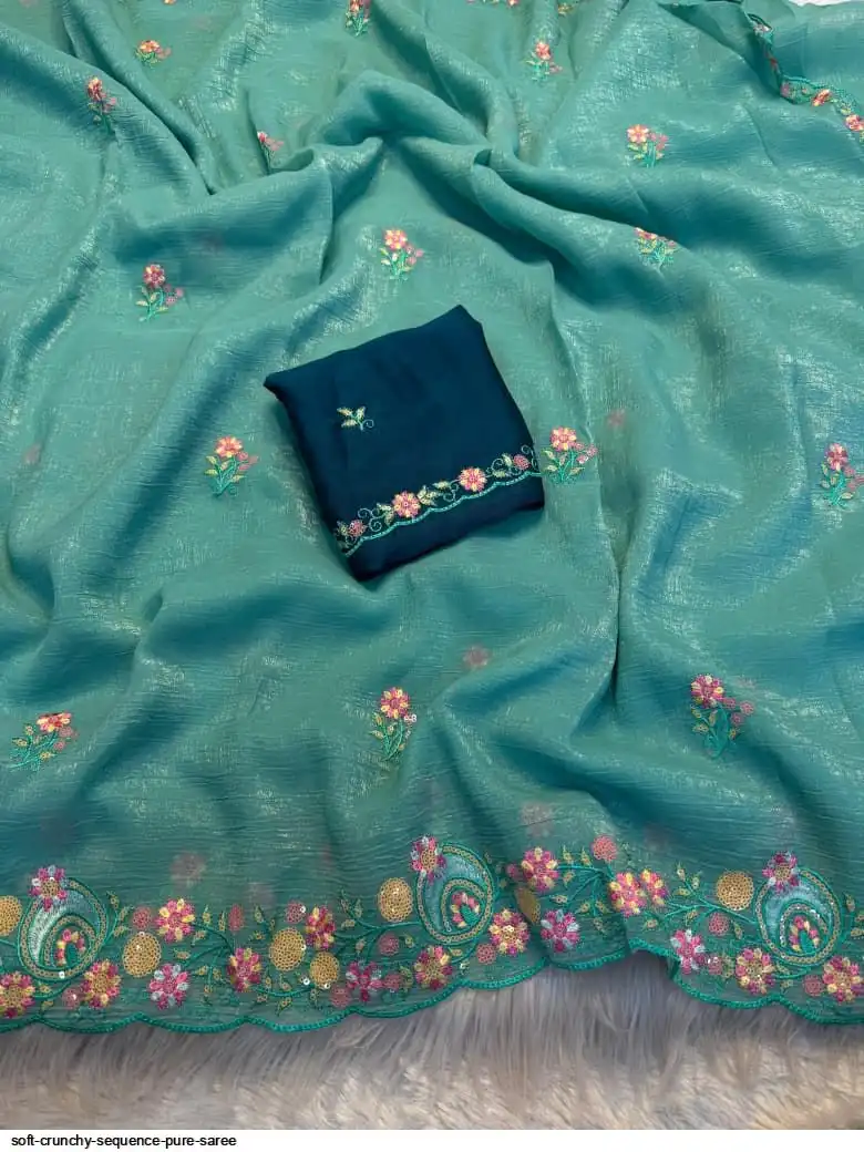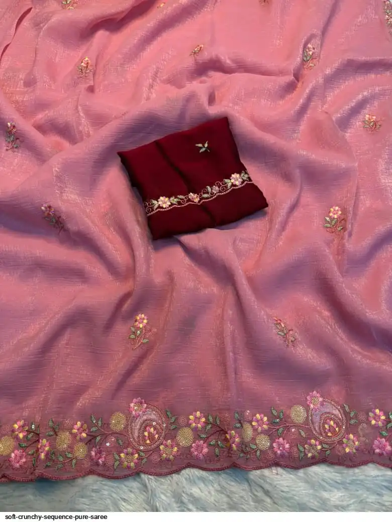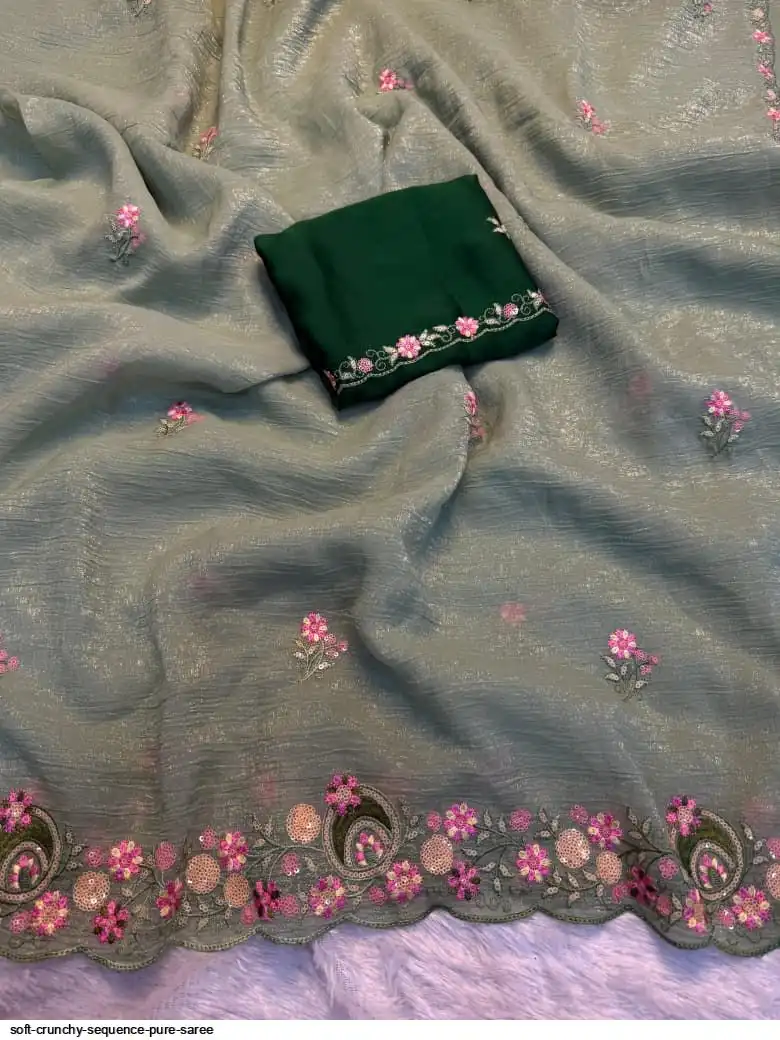 Pure soft crunchy sequence Emrodairy Full Worked Saree With contrast embroidery work Blouse