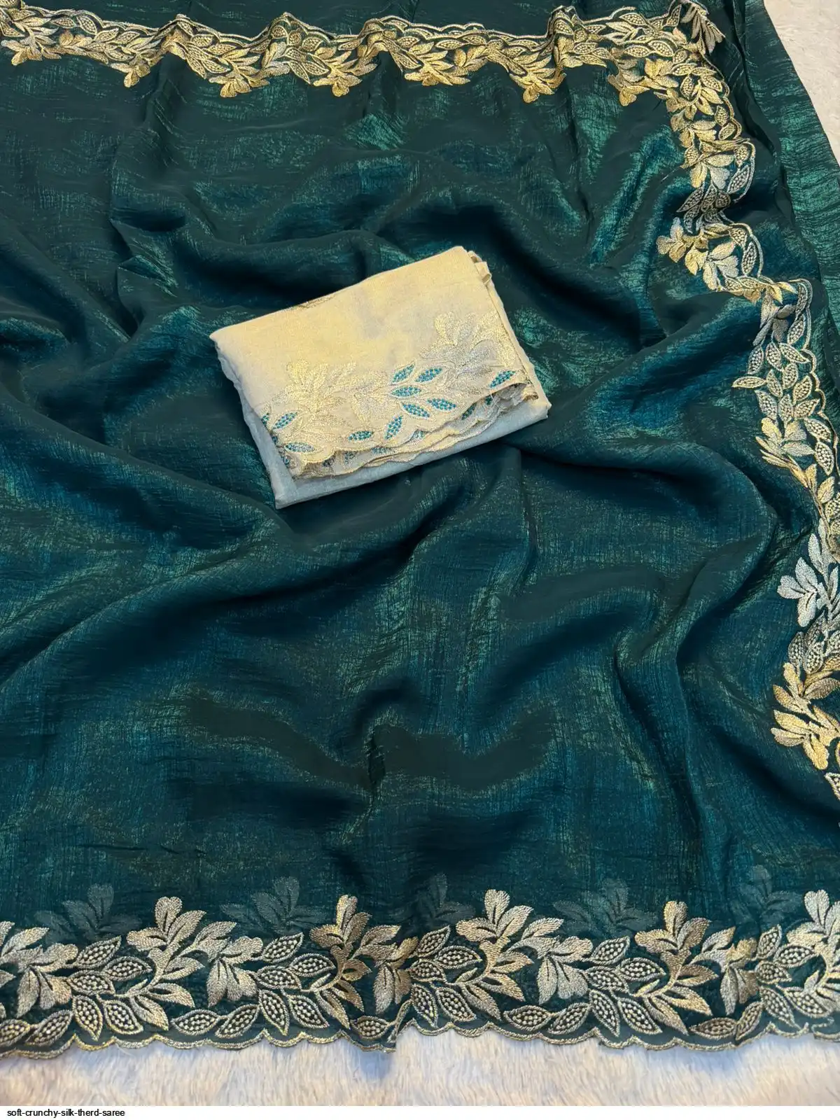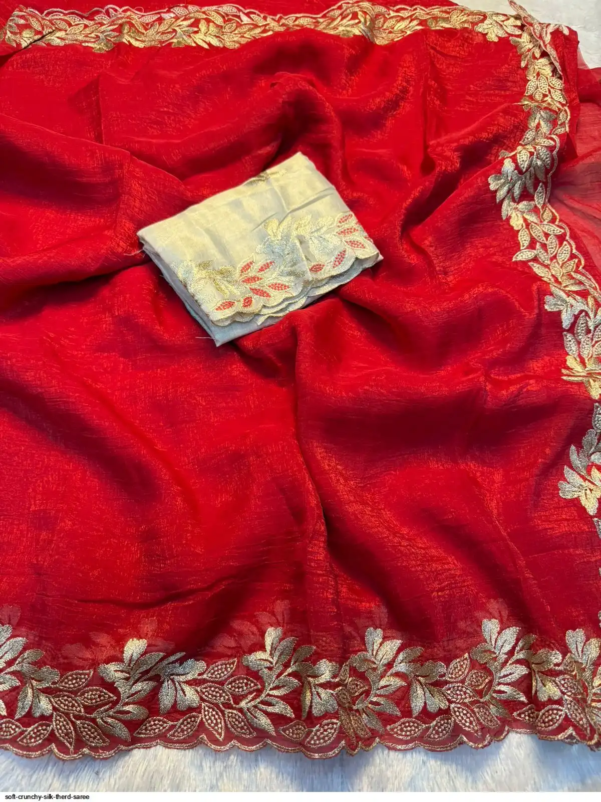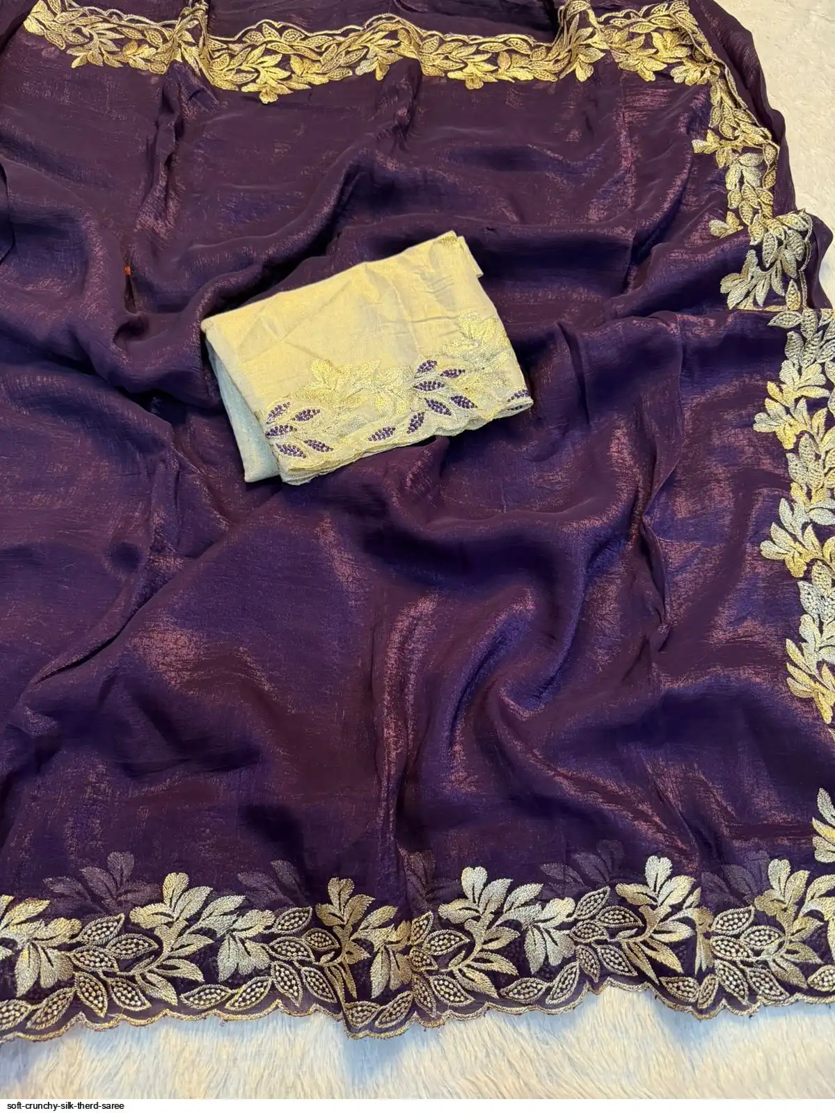 Soft crunchy silk saree with embroidery therd matching work with contrast embroidery work blouse