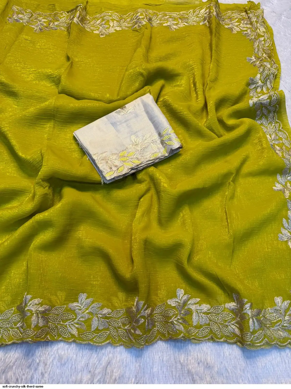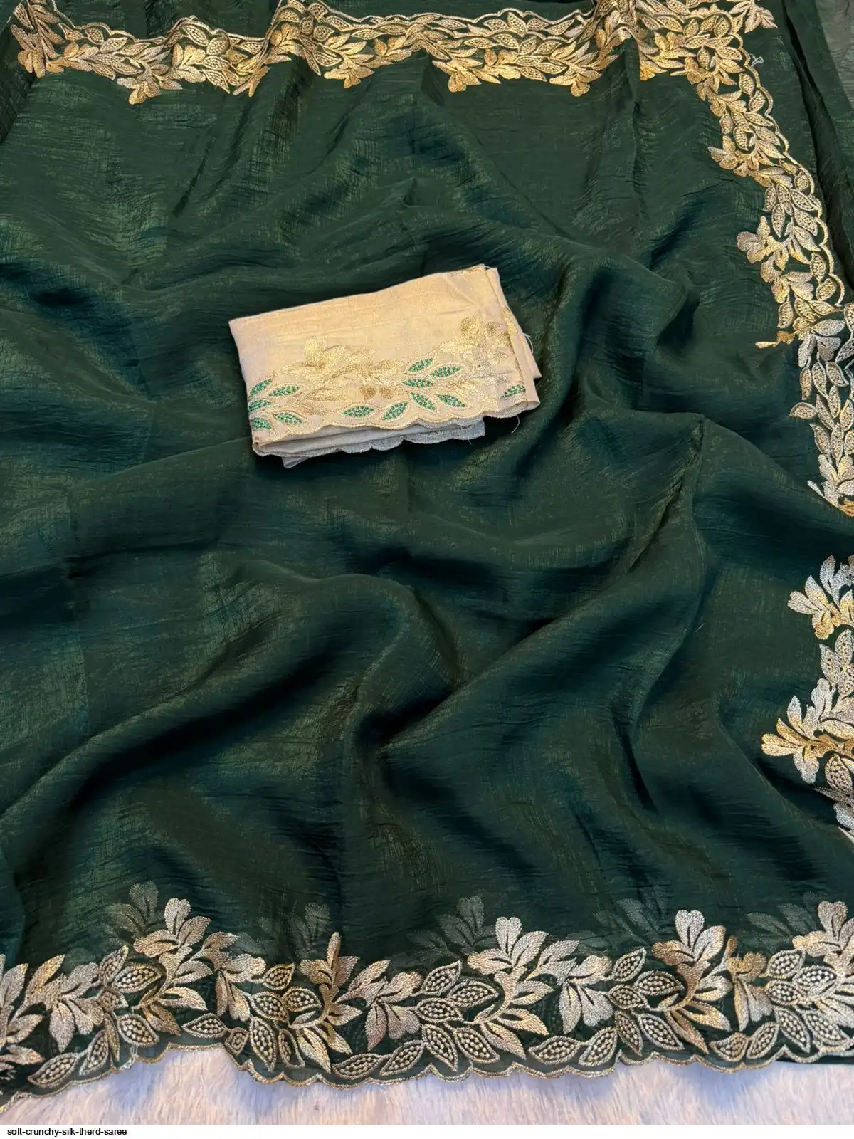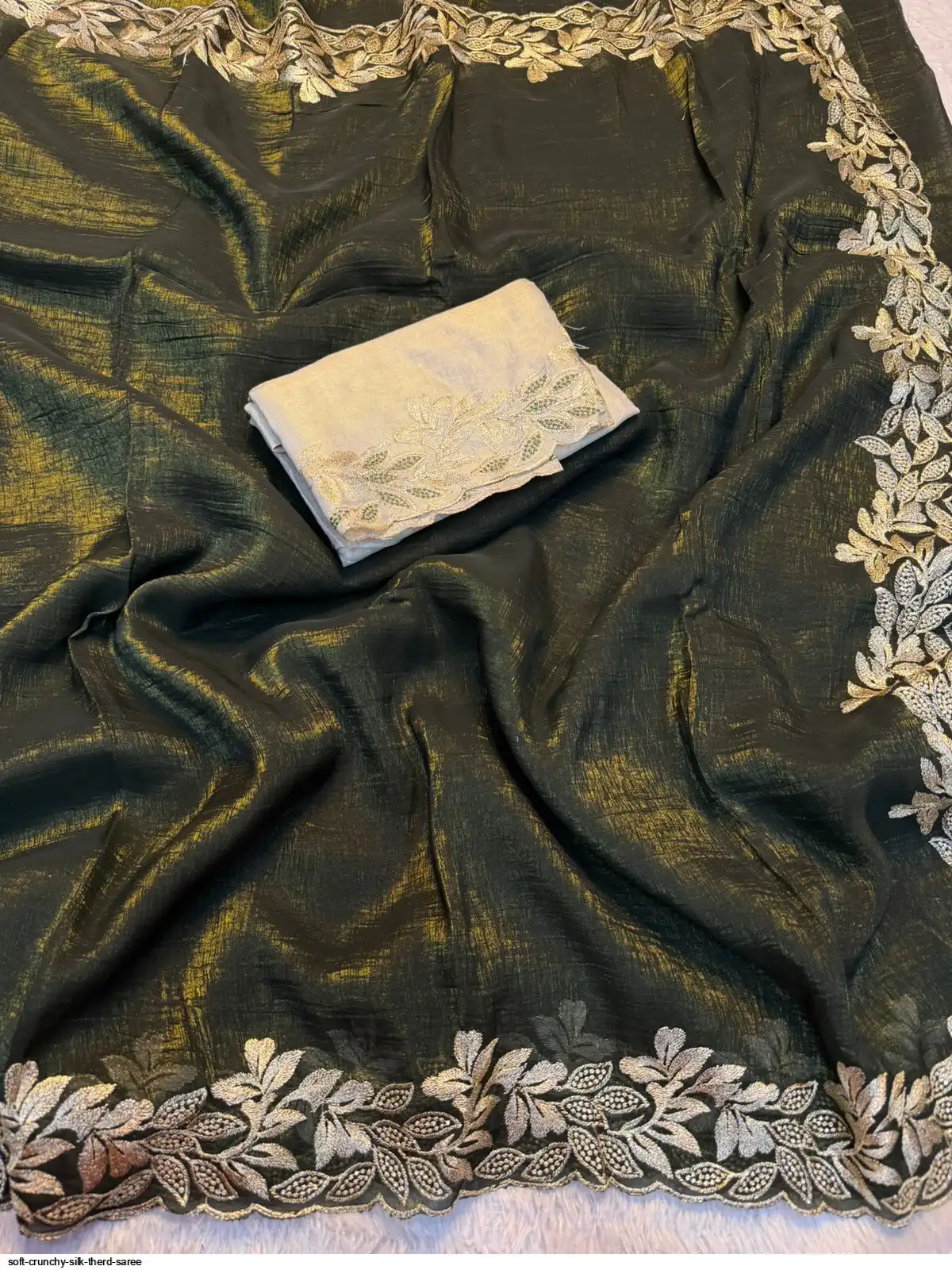Soft crunchy silk saree with embroidery therd matching work with contrast embroidery work blouse