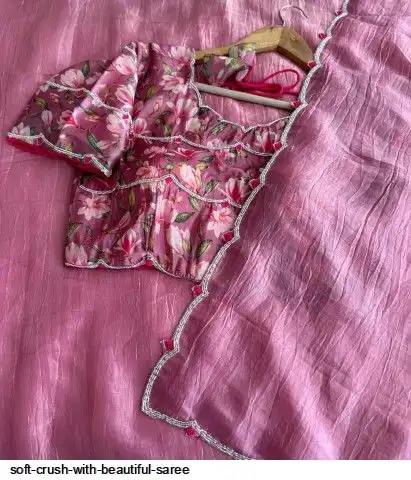Soft crush saree with beautiful handwork all over and printed silk blouse with handwork