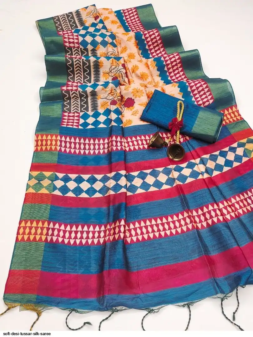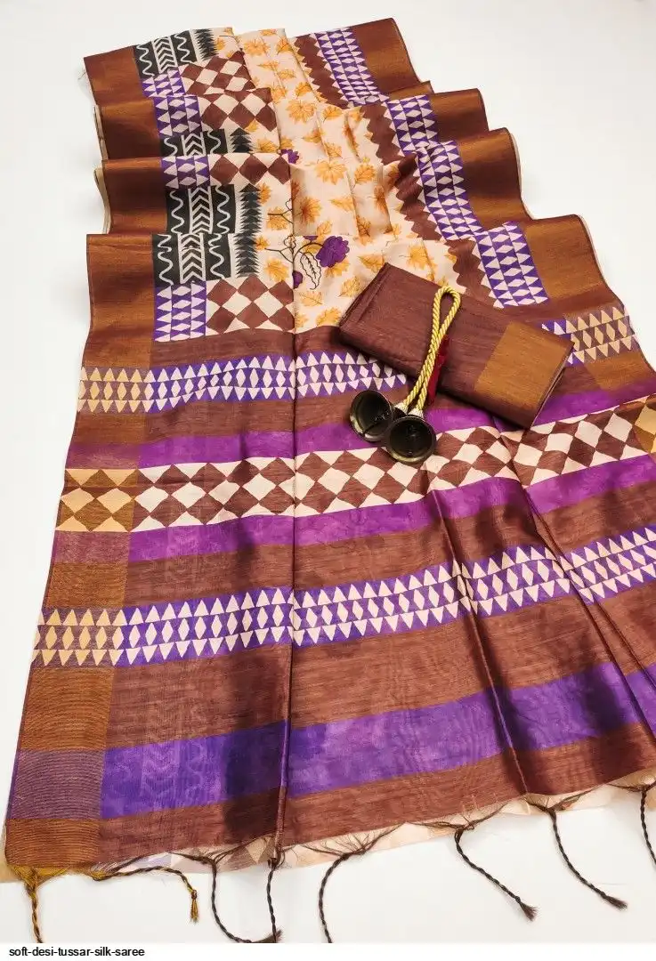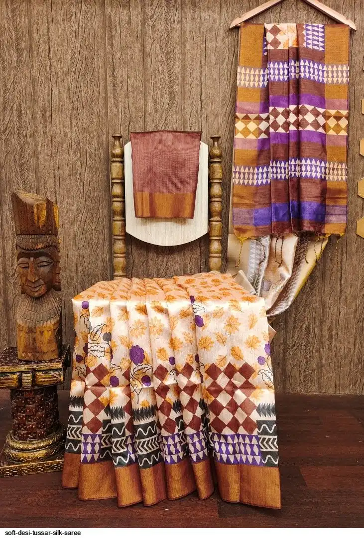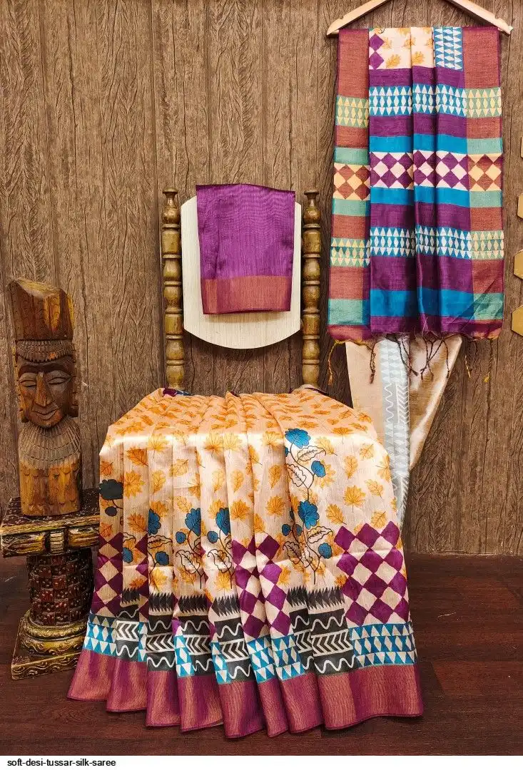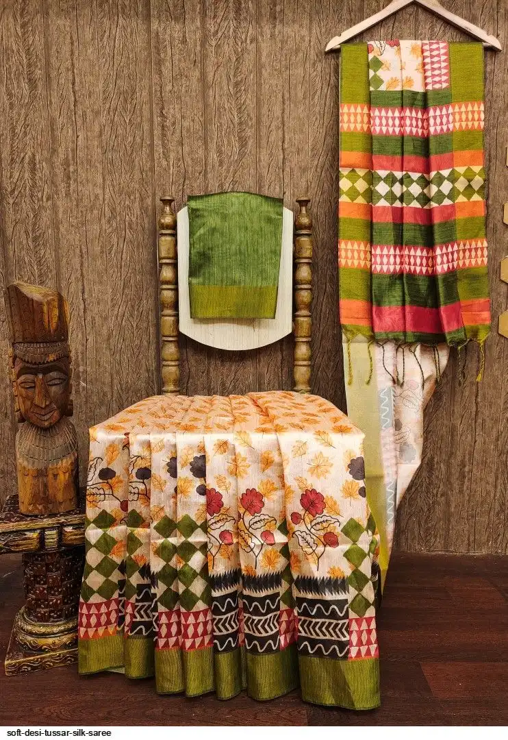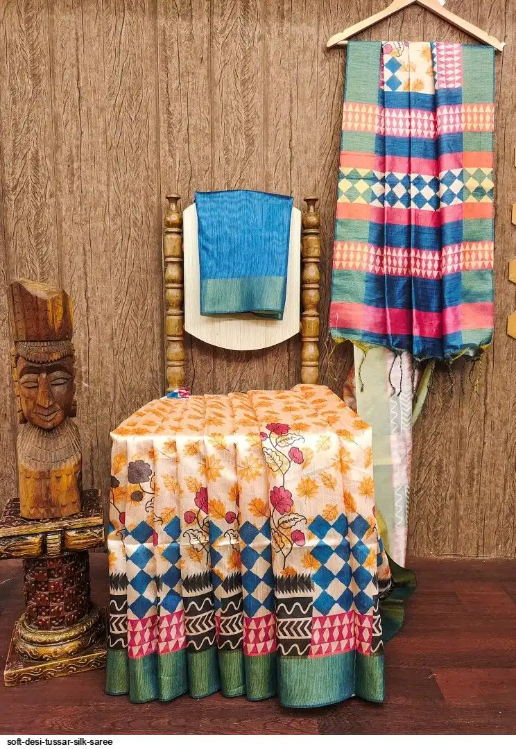PREMIUM SOFT DESI TUSSAR SILK SAREE WITH CLASSY FLORAL PAN PRINTED BODY AND CONTRAST ZARI WOVEN BORDER , PALLU AND CONTRAST BLOUSE PIECE
