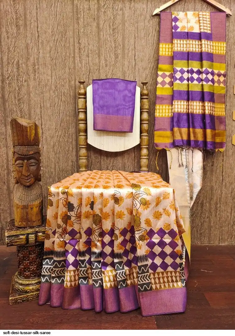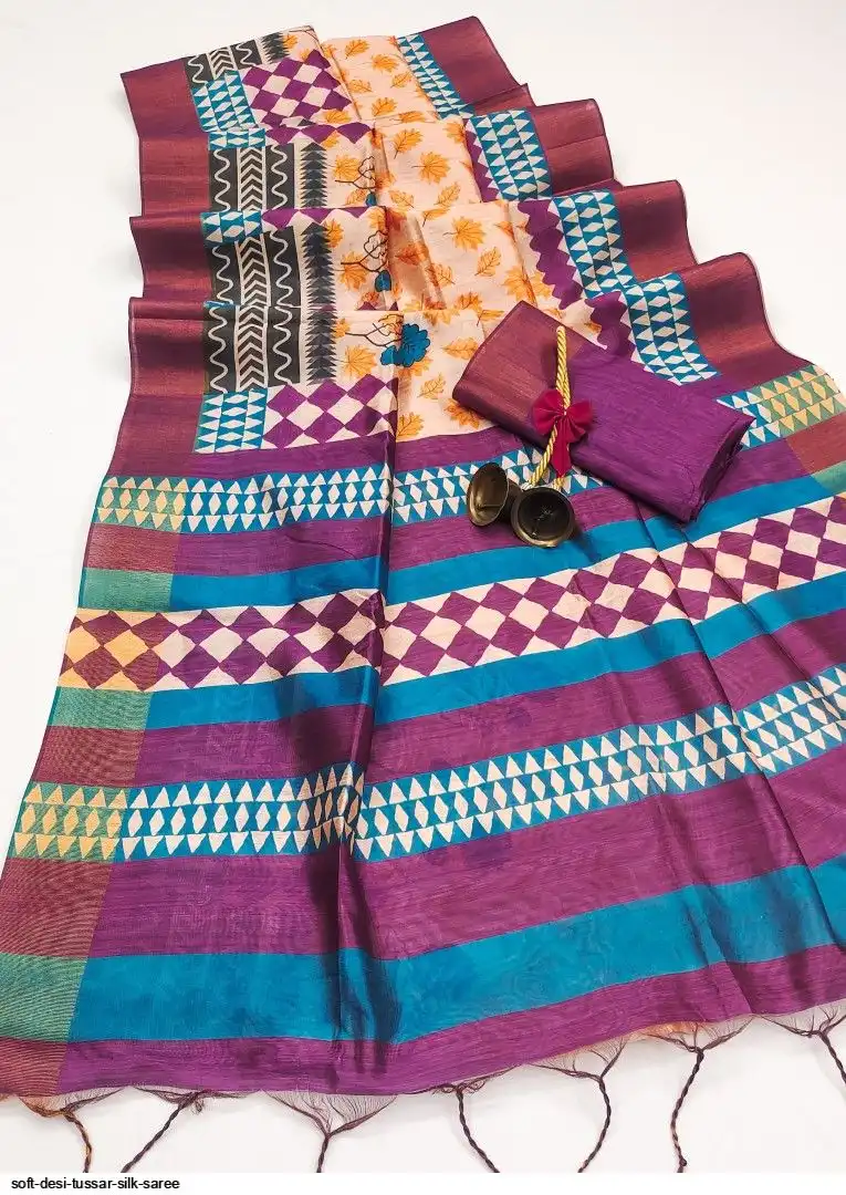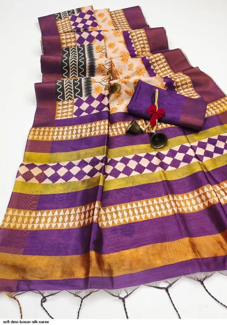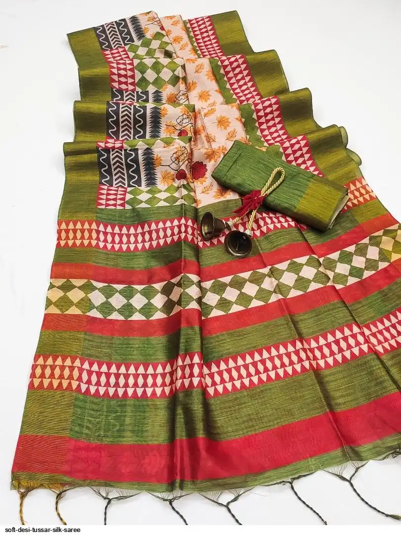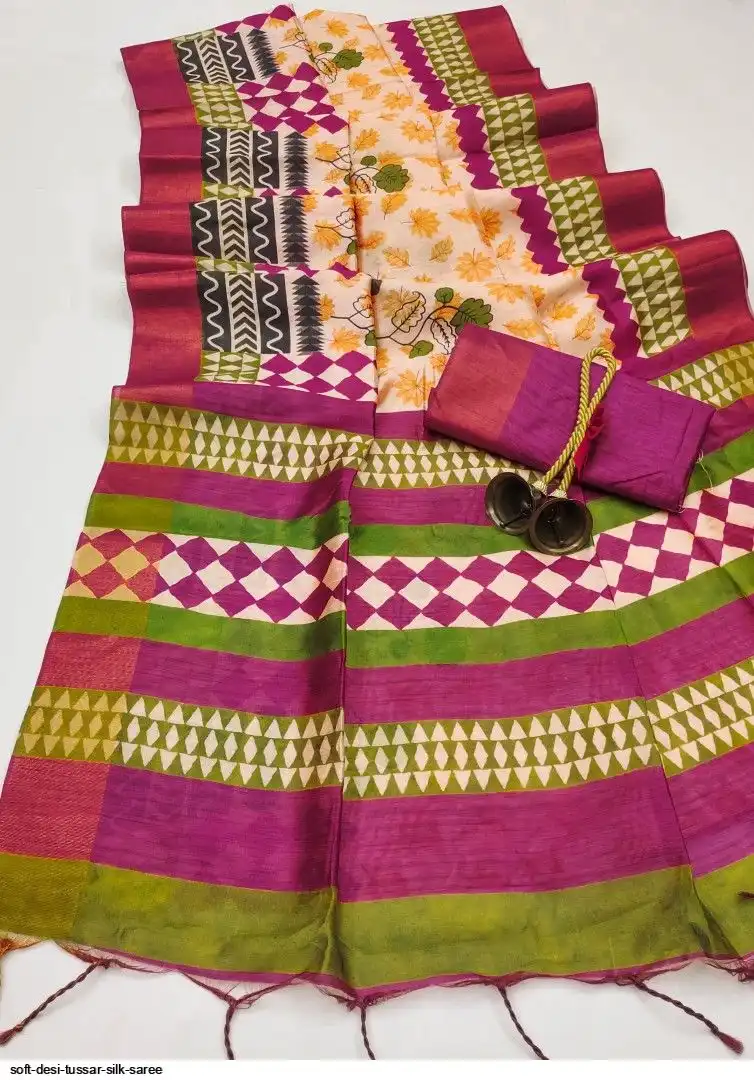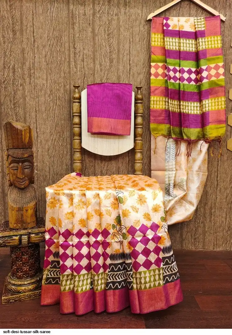 PREMIUM SOFT DESI TUSSAR SILK SAREE WITH CLASSY FLORAL PAN PRINTED BODY AND CONTRAST ZARI WOVEN BORDER , PALLU AND CONTRAST BLOUSE PIECE