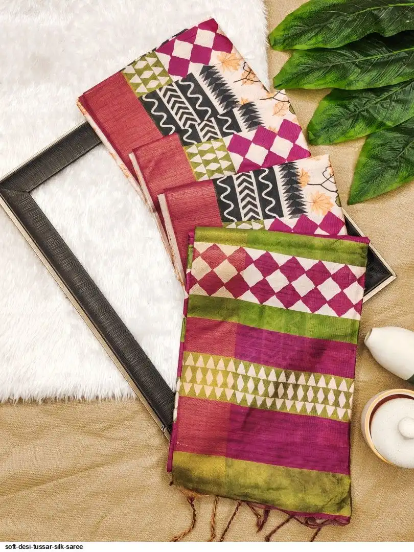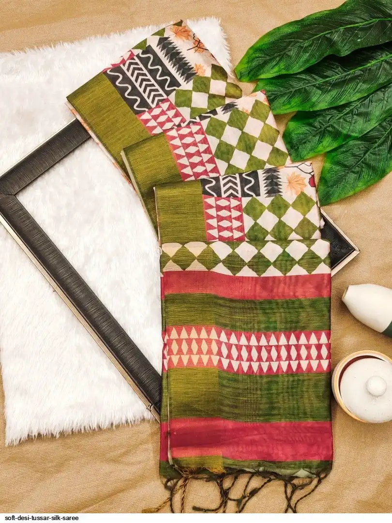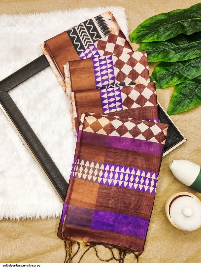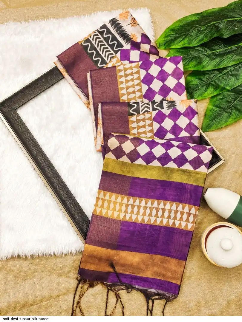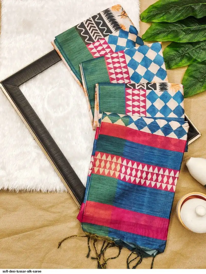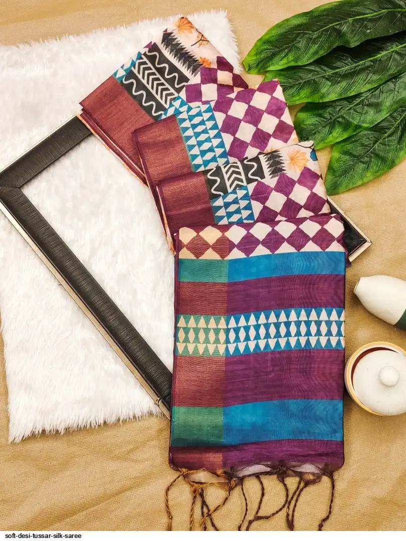 PREMIUM SOFT DESI TUSSAR SILK SAREE WITH CLASSY FLORAL PAN PRINTED BODY AND CONTRAST ZARI WOVEN BORDER , PALLU AND CONTRAST BLOUSE PIECE