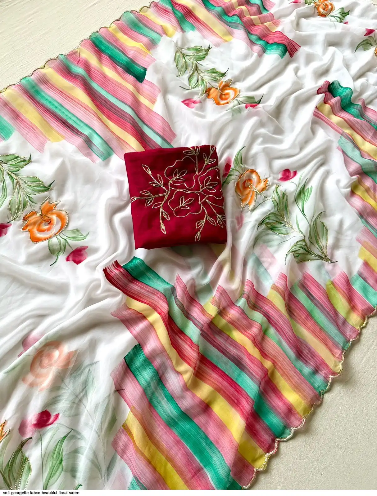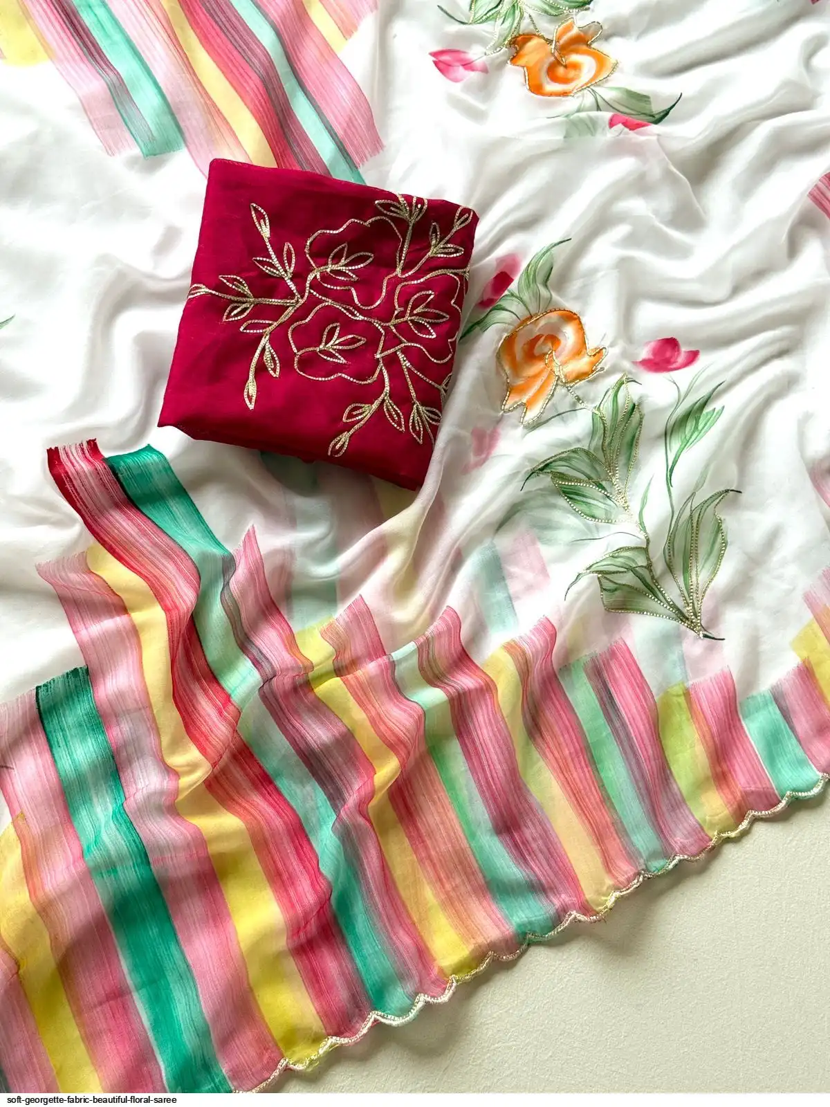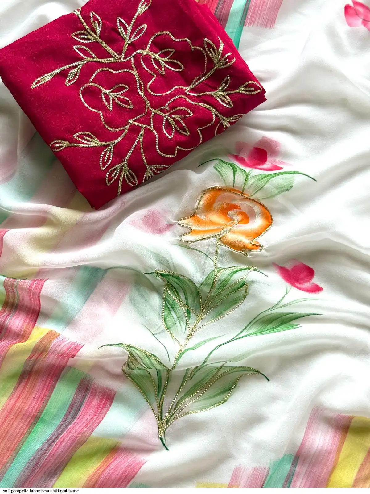 Fabric - Soft Georgette Fabric With Beautiful Floral Brush Print And Ribbon And HandWork In Body And Cutwork Border With Contrast Art Silk Blouse