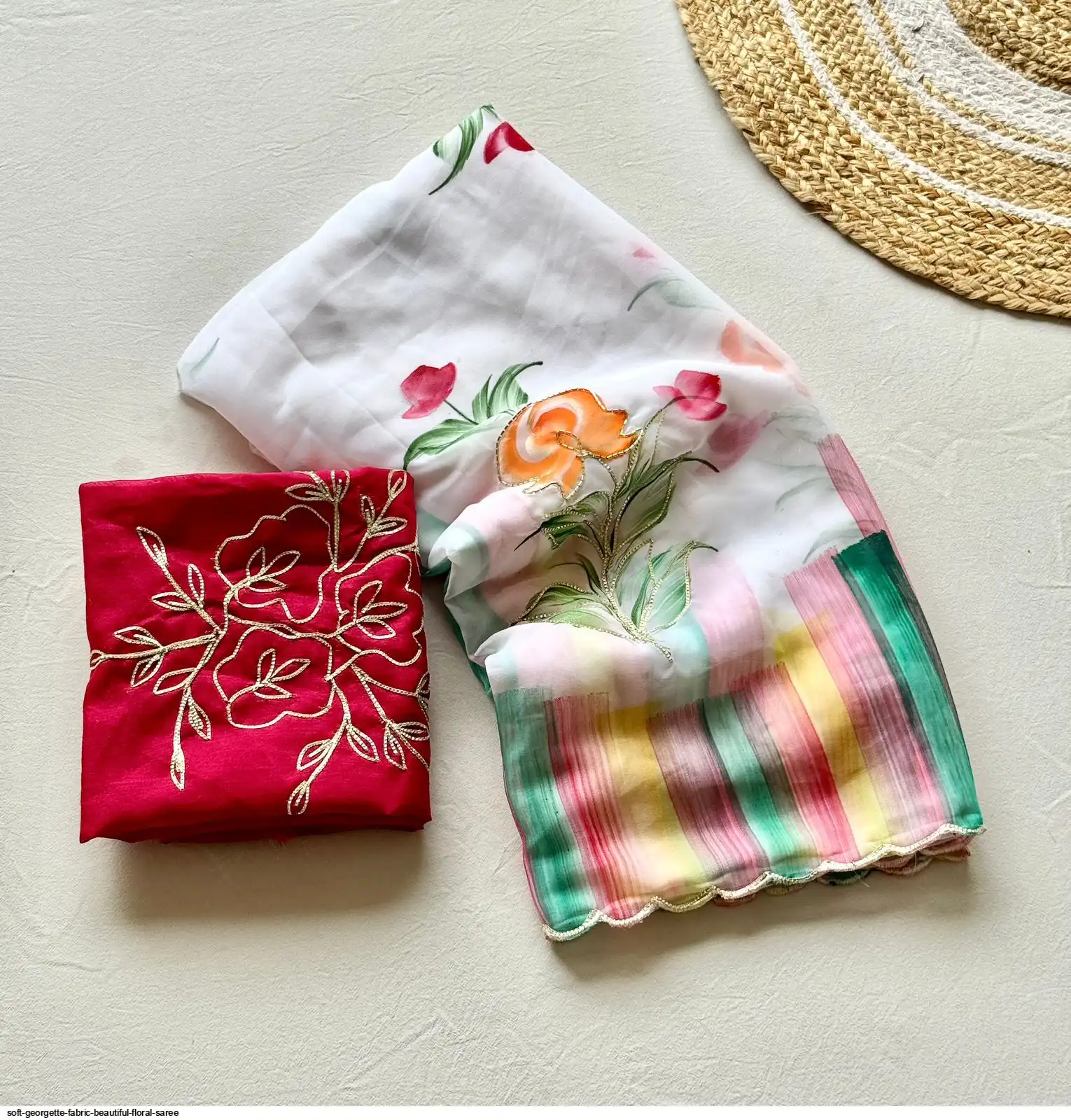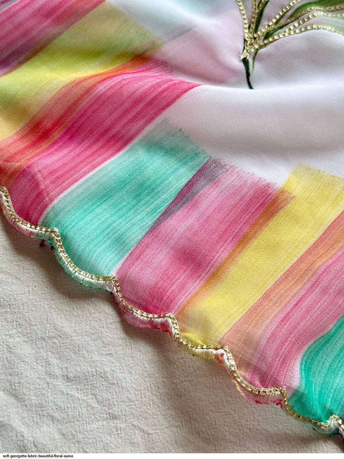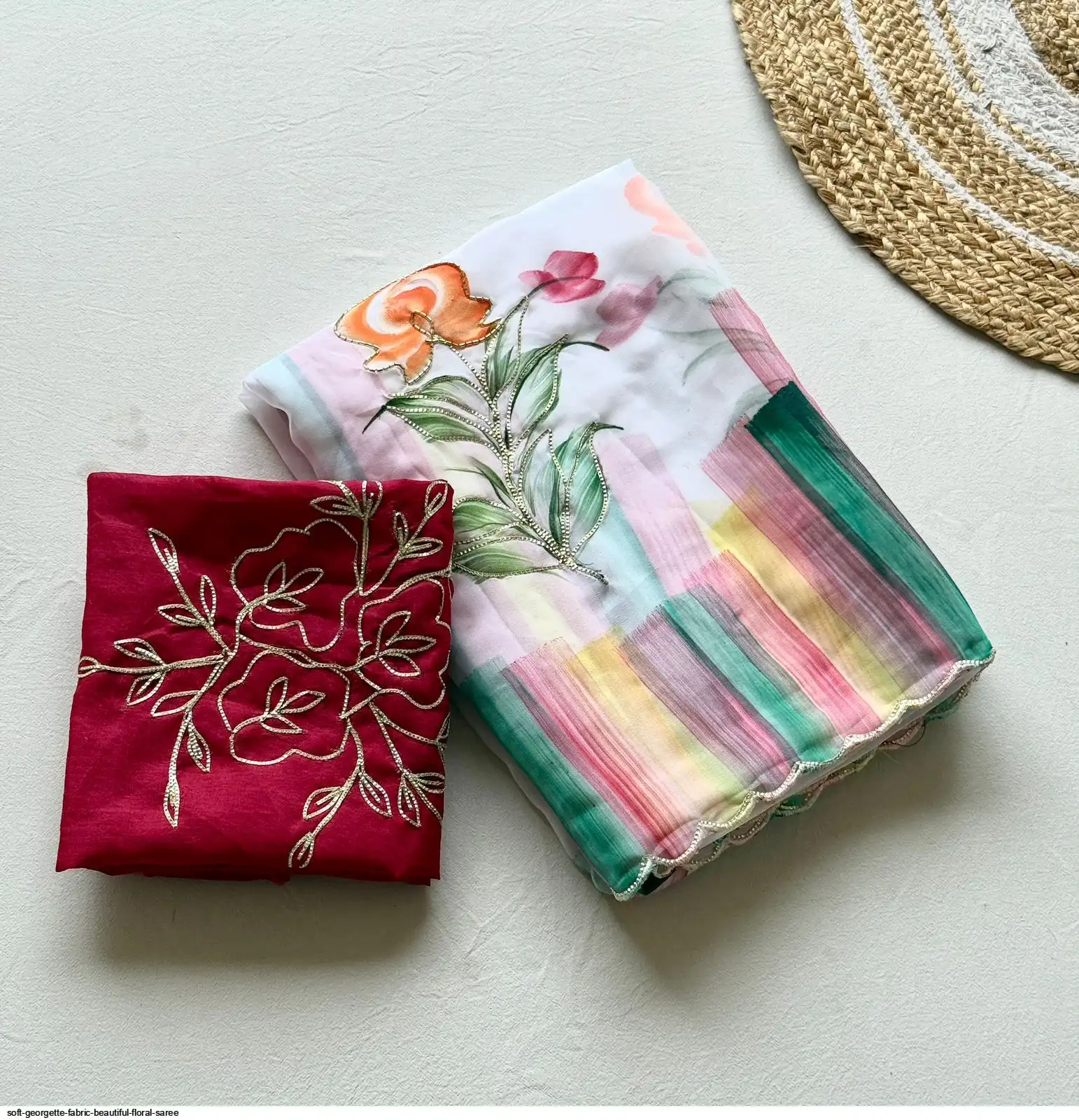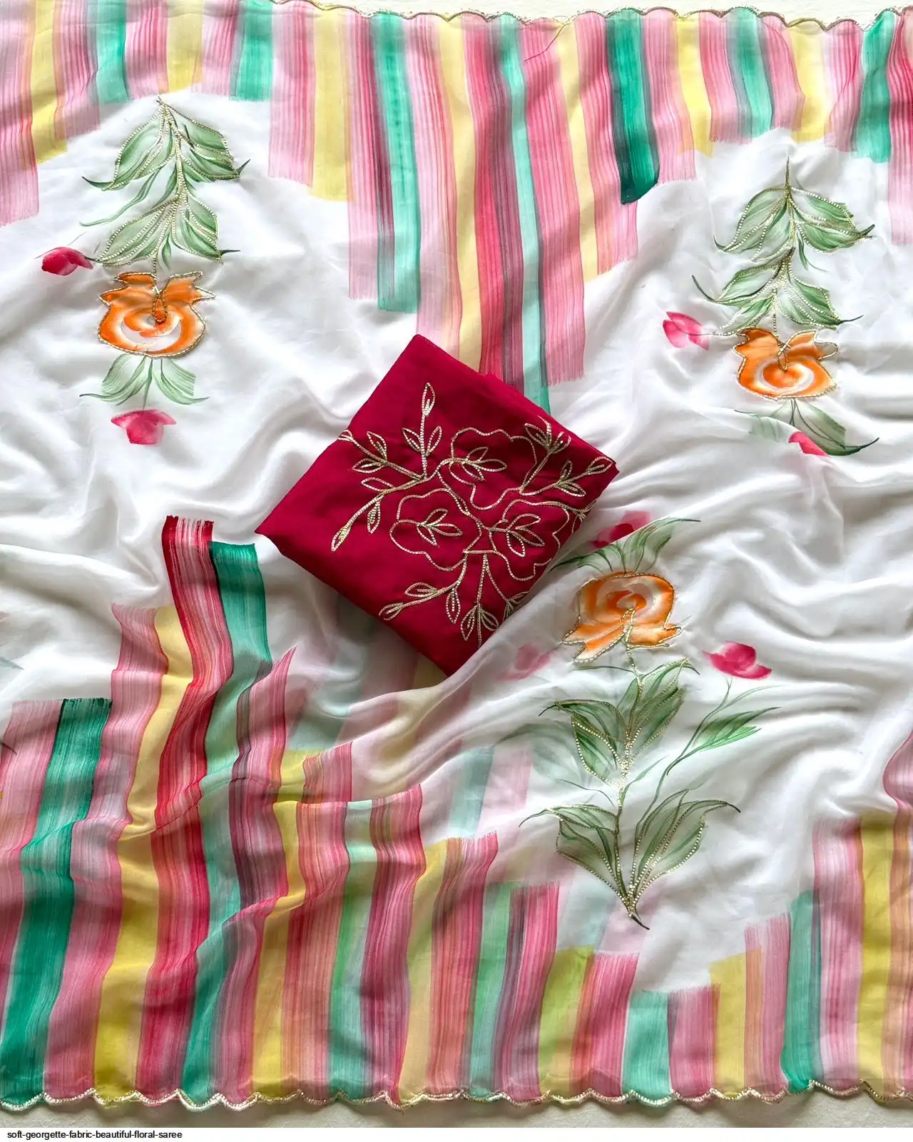 Fabric - Soft Georgette Fabric With Beautiful Floral Brush Print And Ribbon And HandWork In Body And Cutwork Border With Contrast Art Silk Blouse