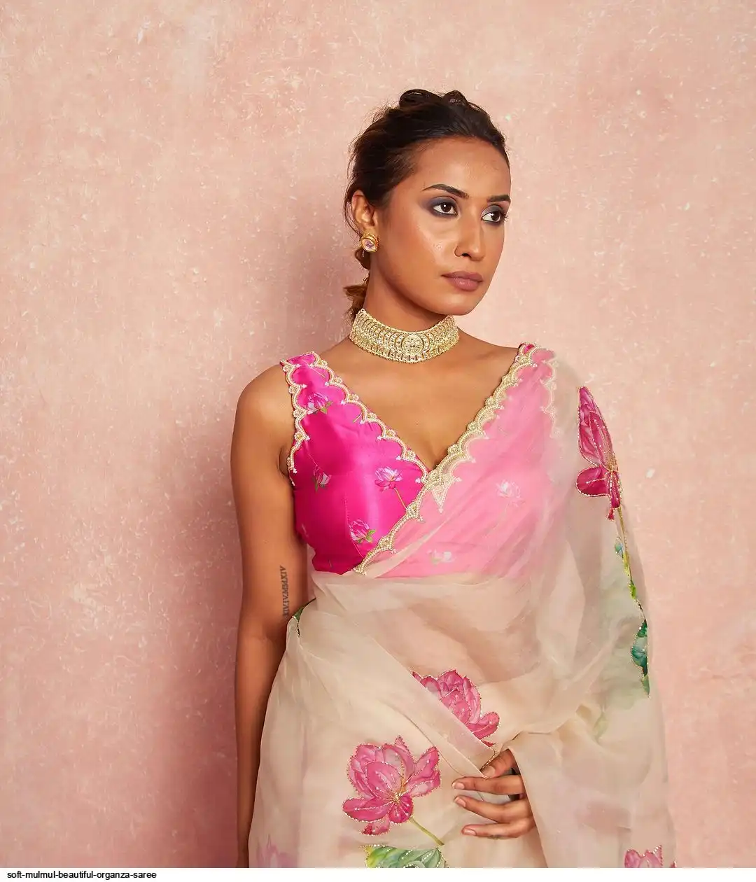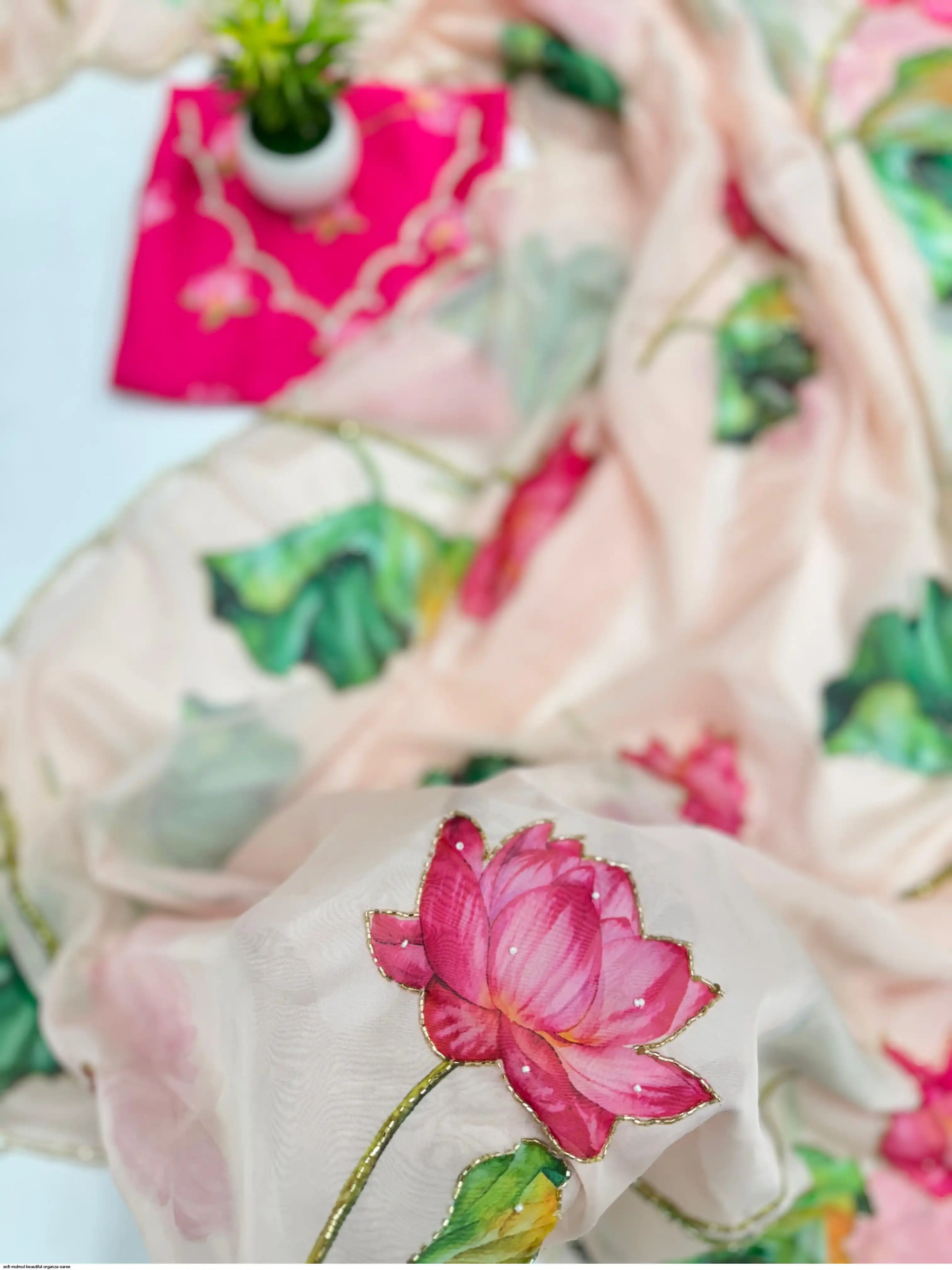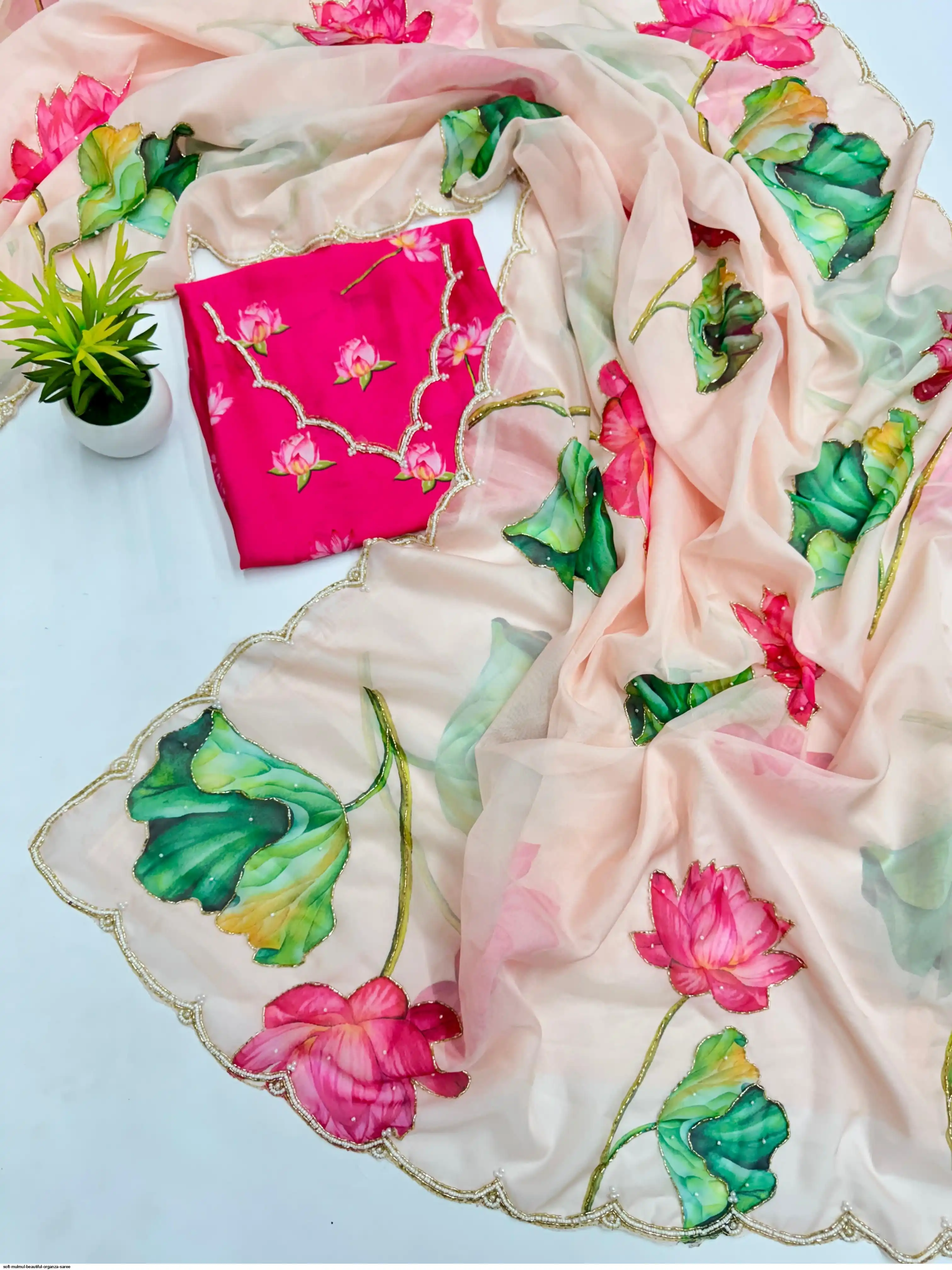 Soft mulmul organza saree with beautiful print cover with handcrafted work all over saree and silk blouse with handwork