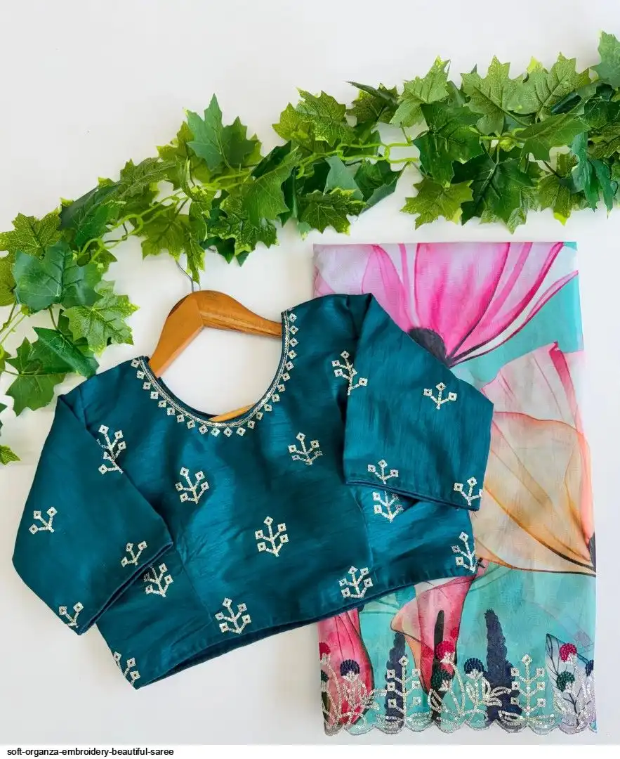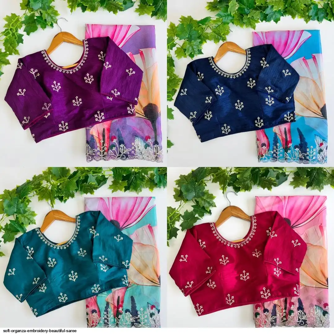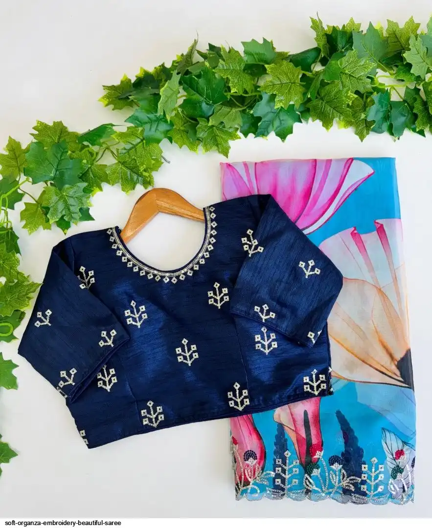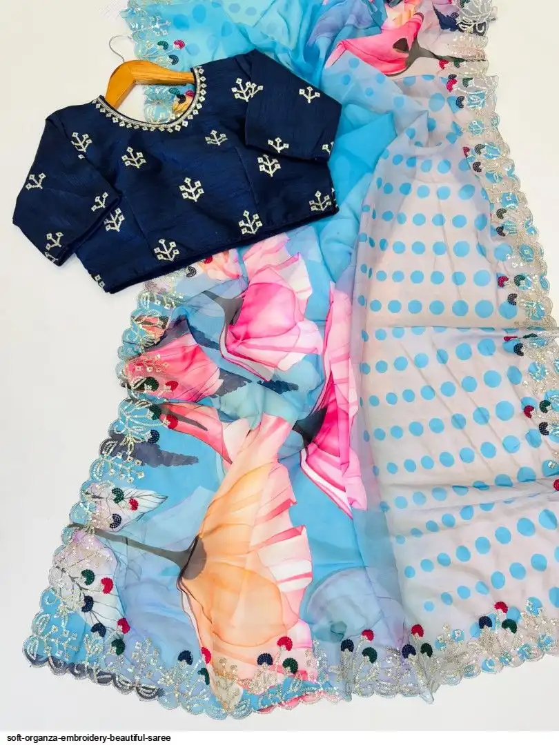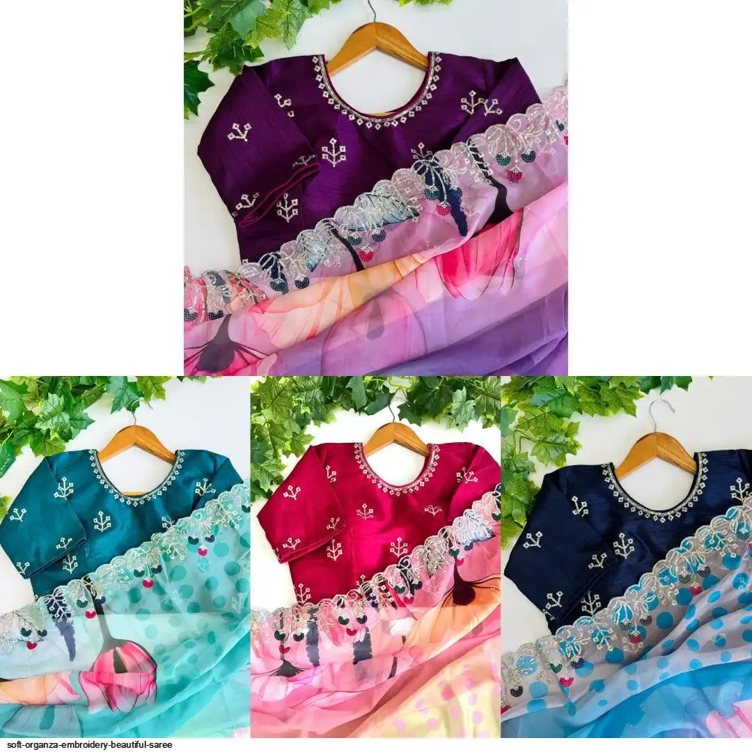 Soft organza saree with beautiful print cover with heavy embroidery and unstitch silk blouse