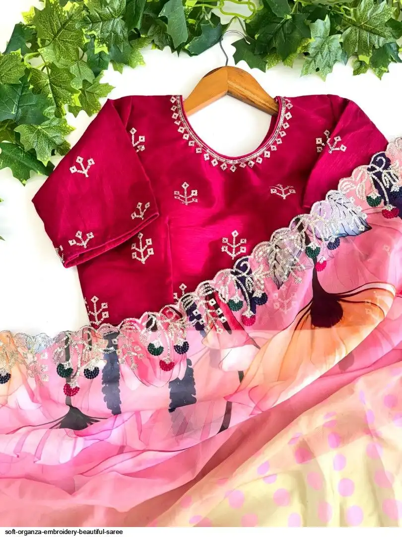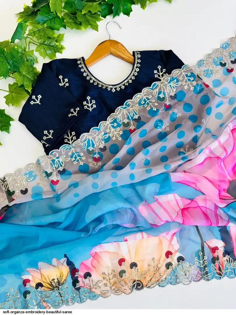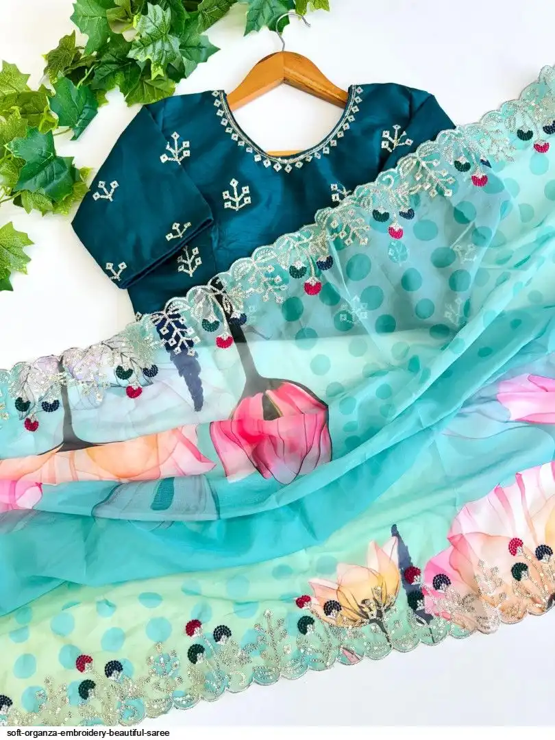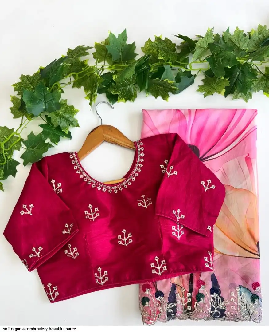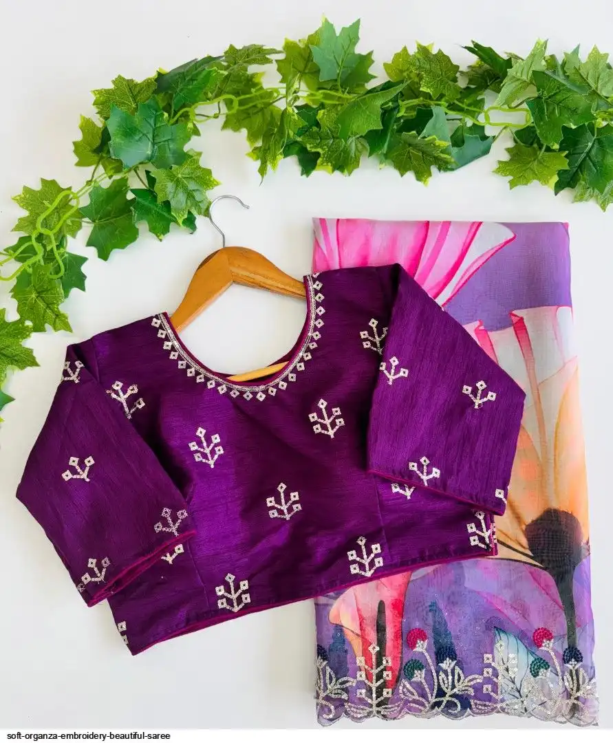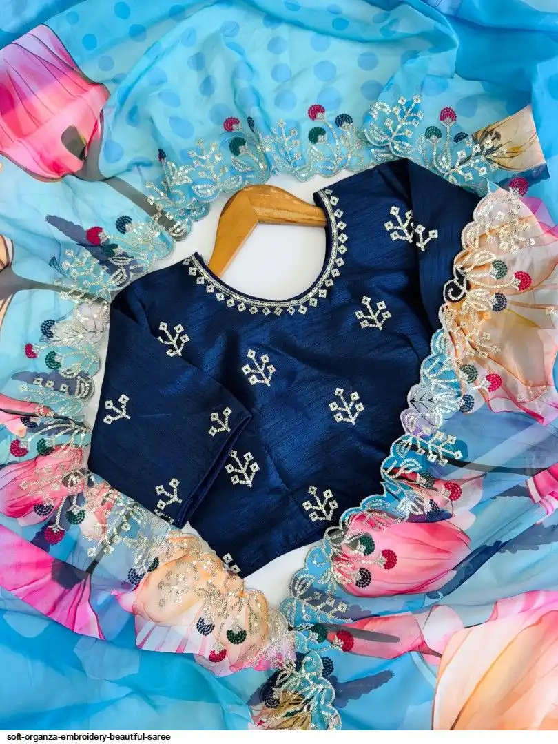 Soft organza saree with beautiful print cover with heavy embroidery and unstitch silk blouse