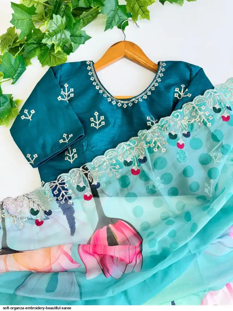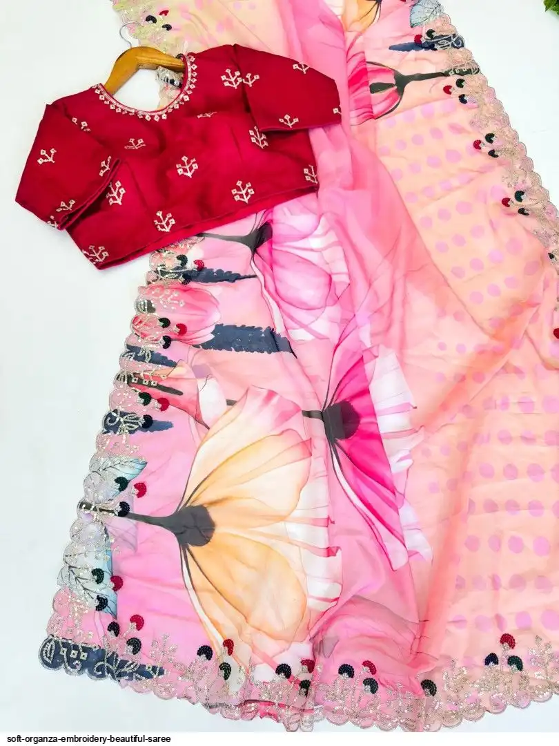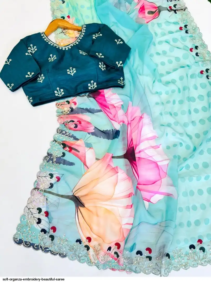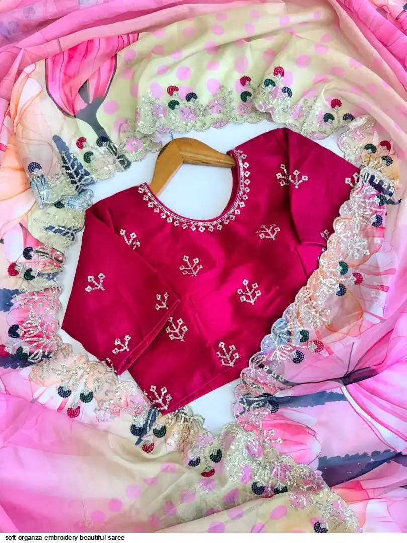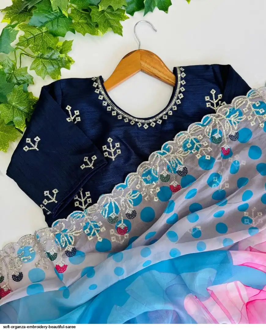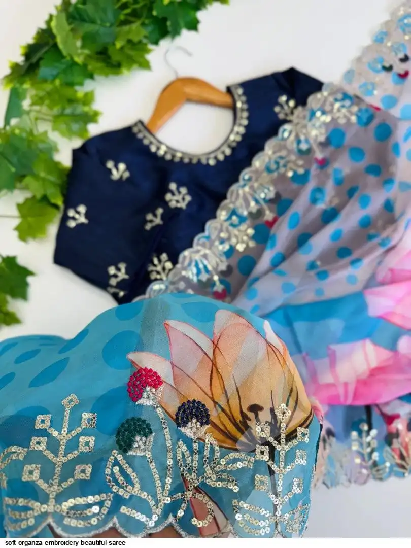 Soft organza saree with beautiful print cover with heavy embroidery and unstitch silk blouse