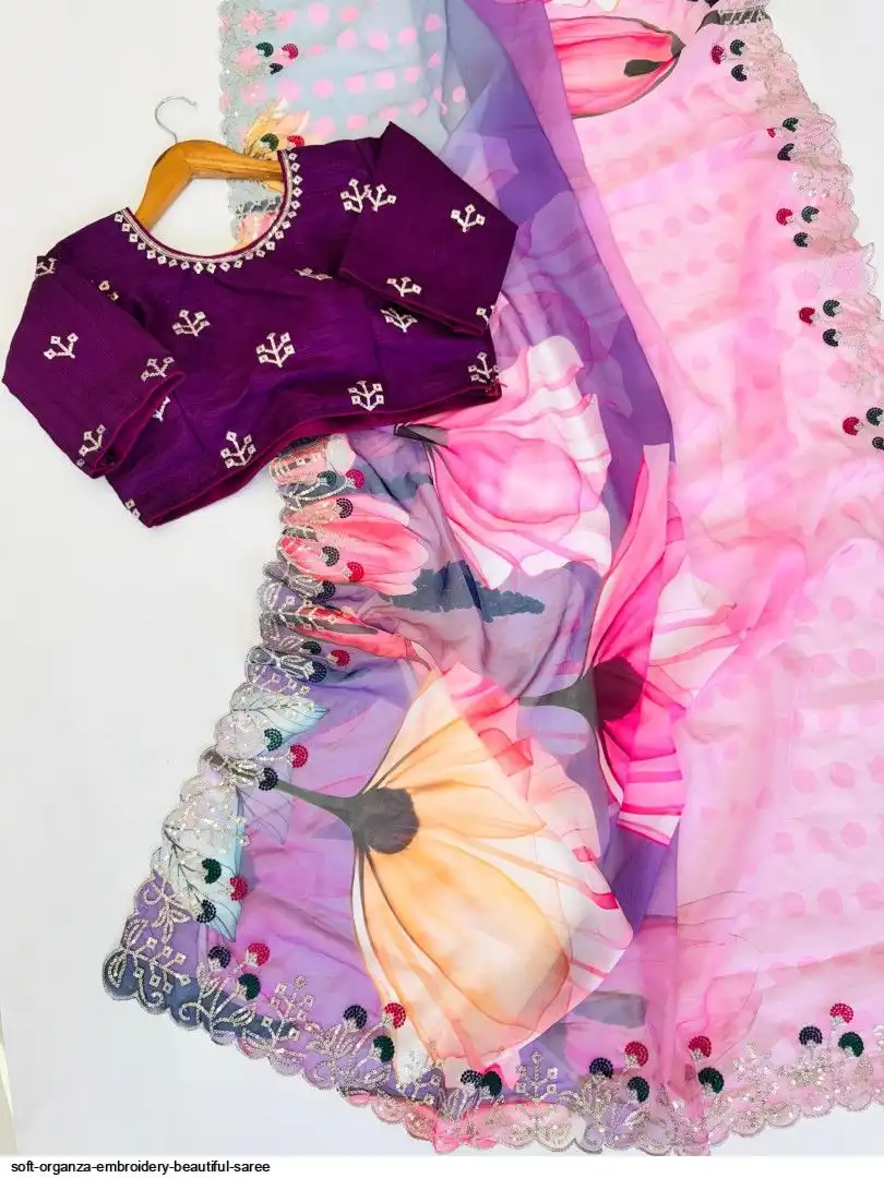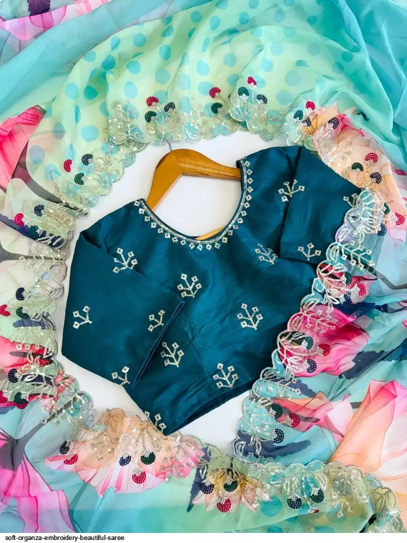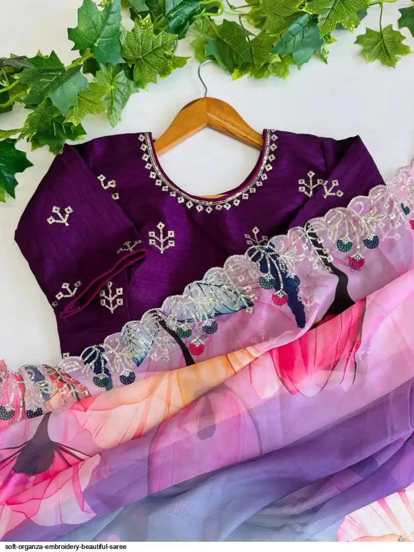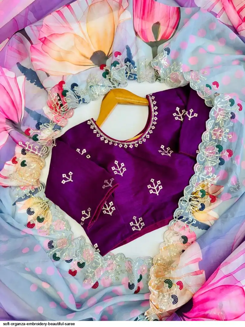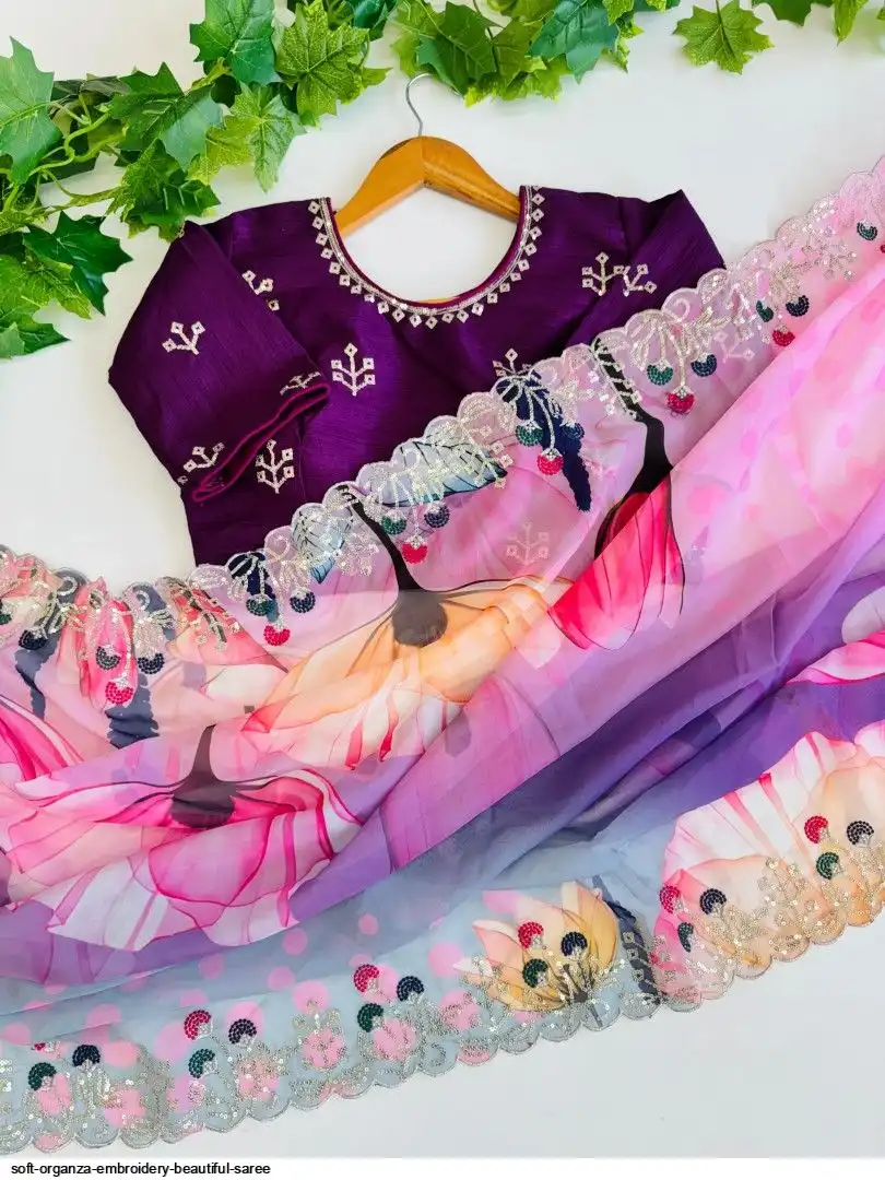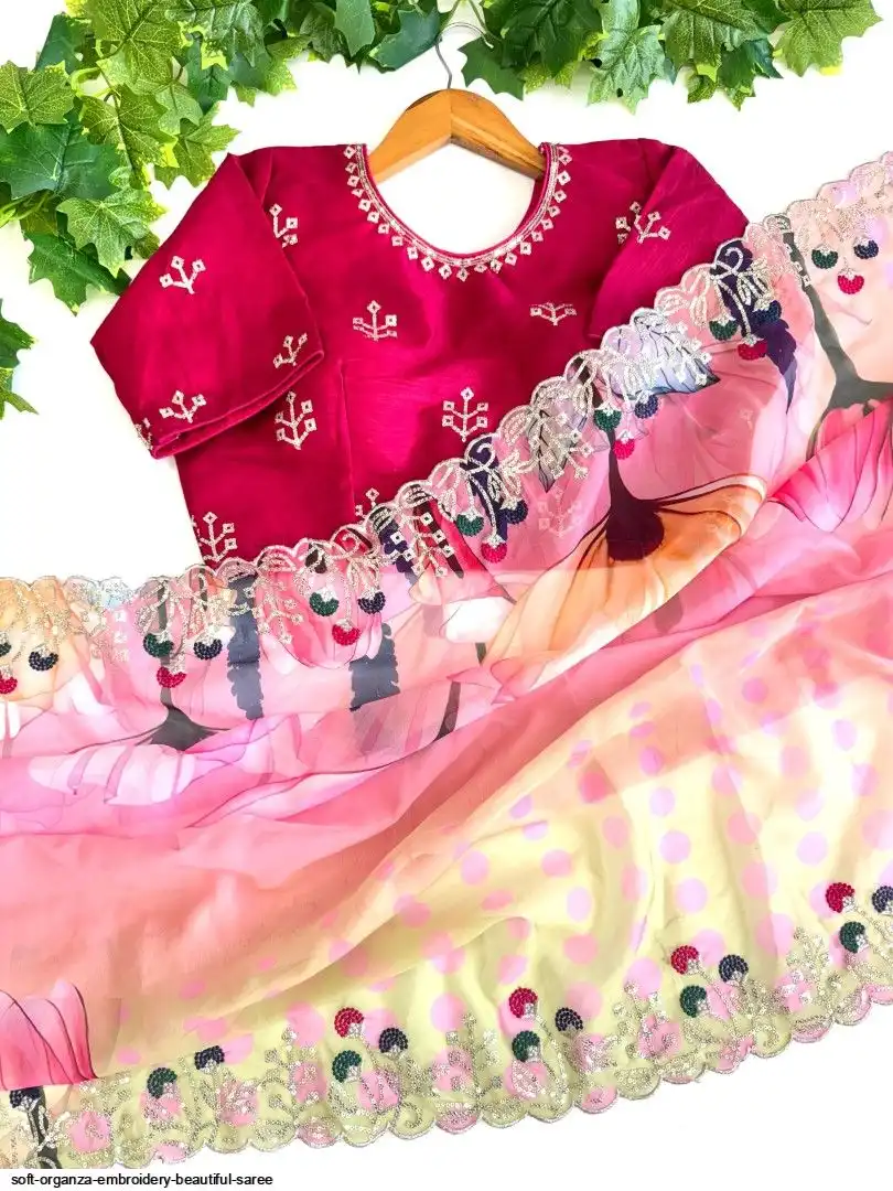Soft organza saree with beautiful print cover with heavy embroidery and unstitch silk blouse