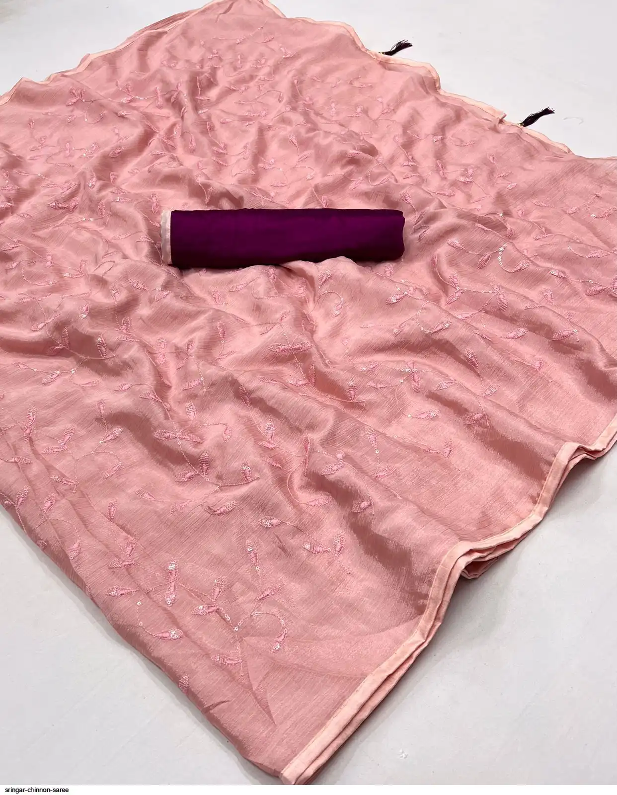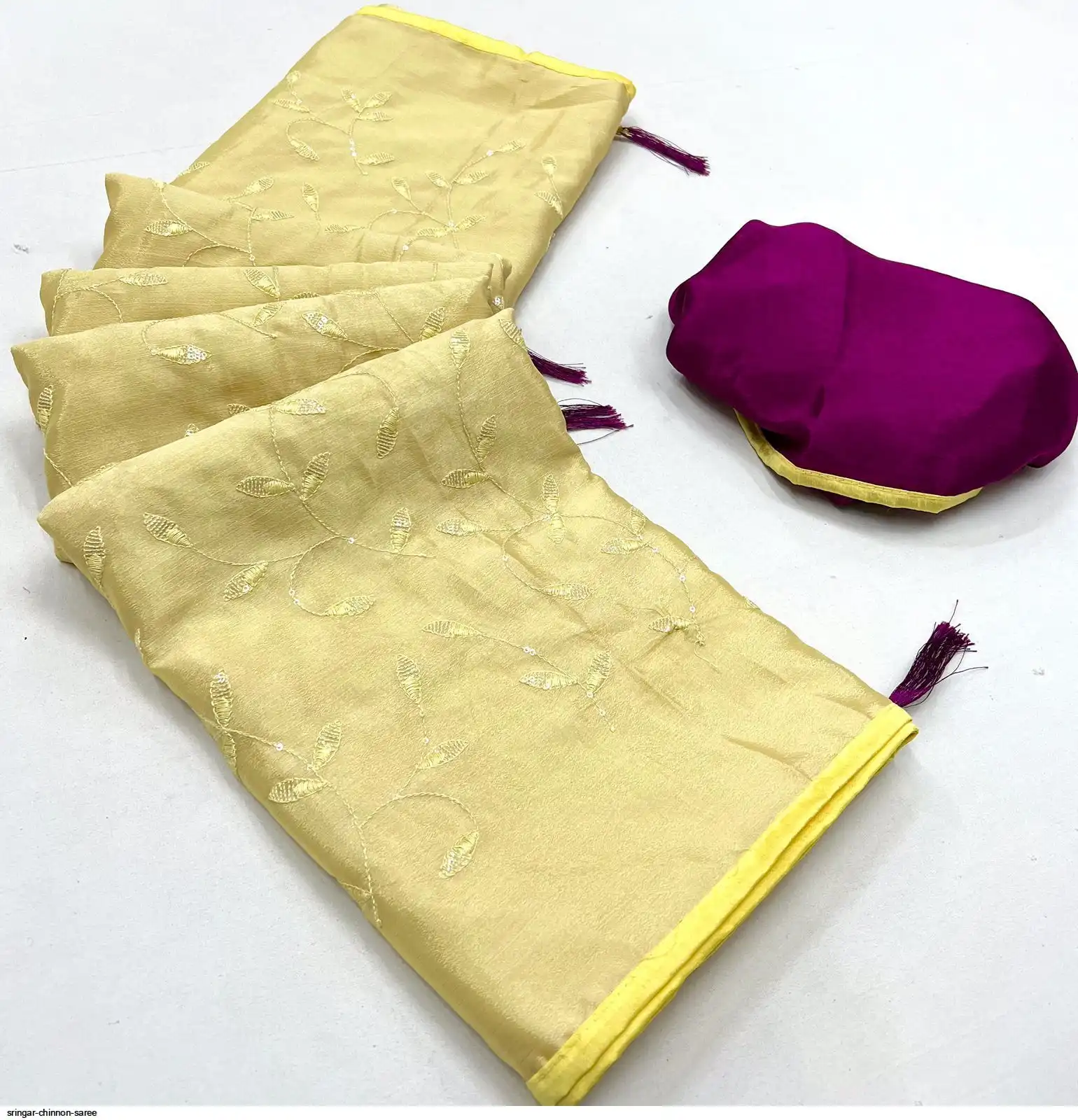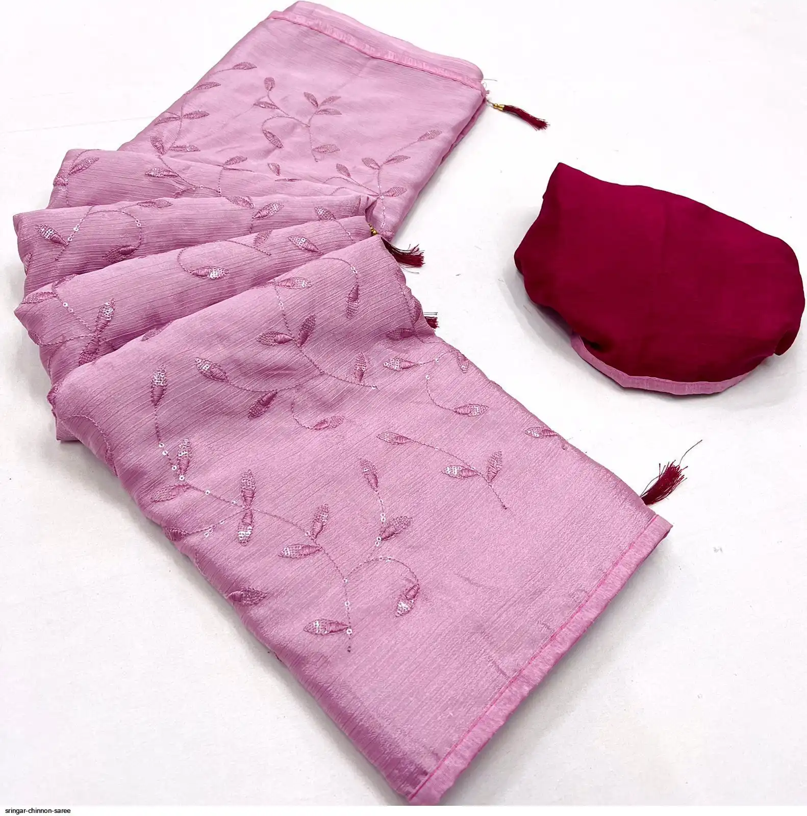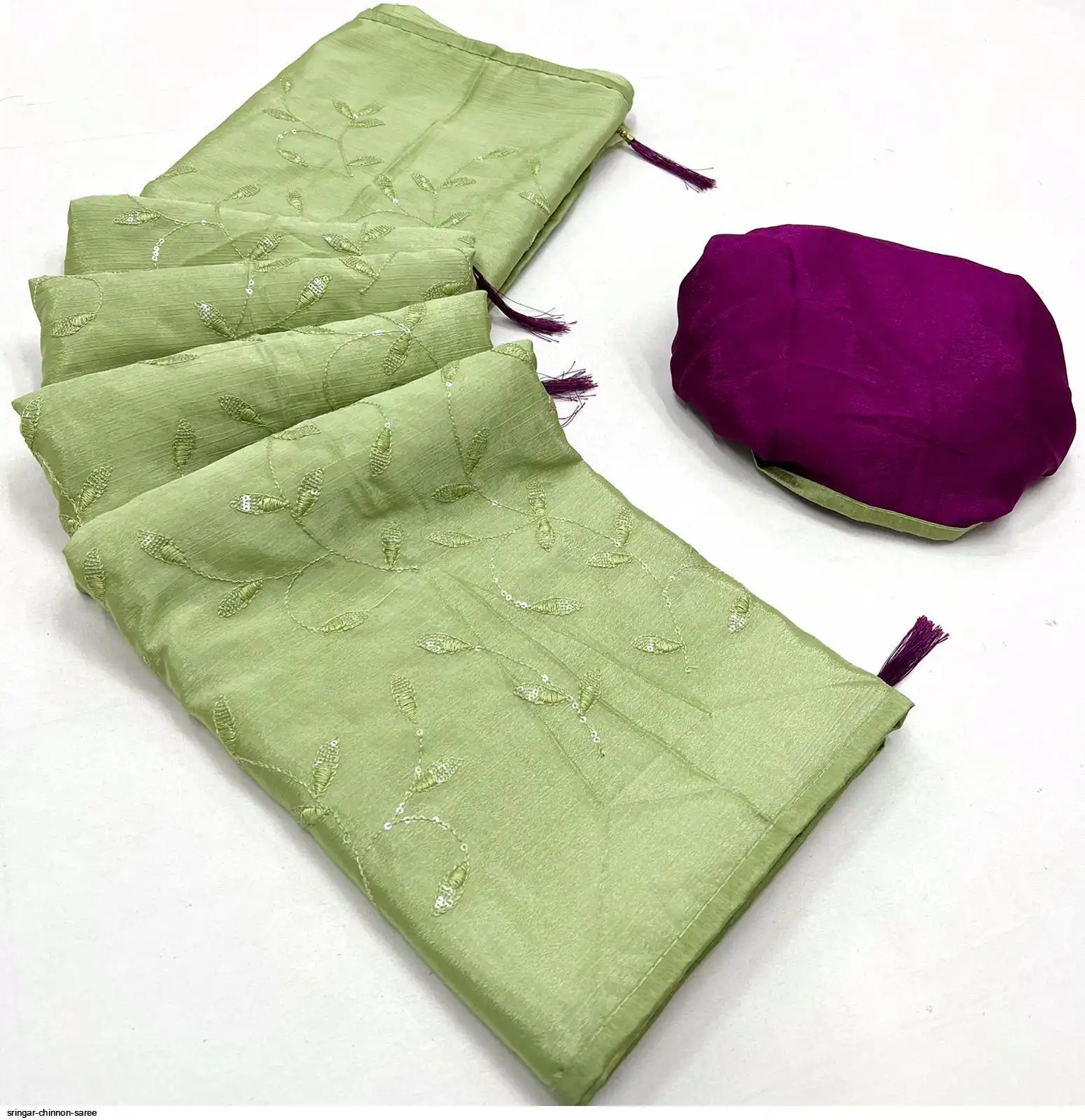 Fabric - Chinnon Fabric Full Body Sequence Embroidery Work And Small Less Piping With Contrast Shinon Blouse