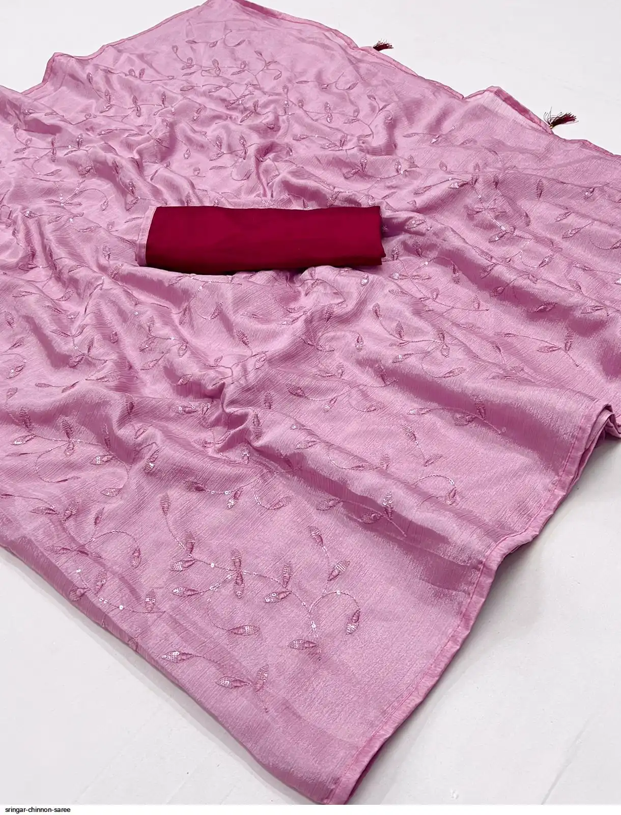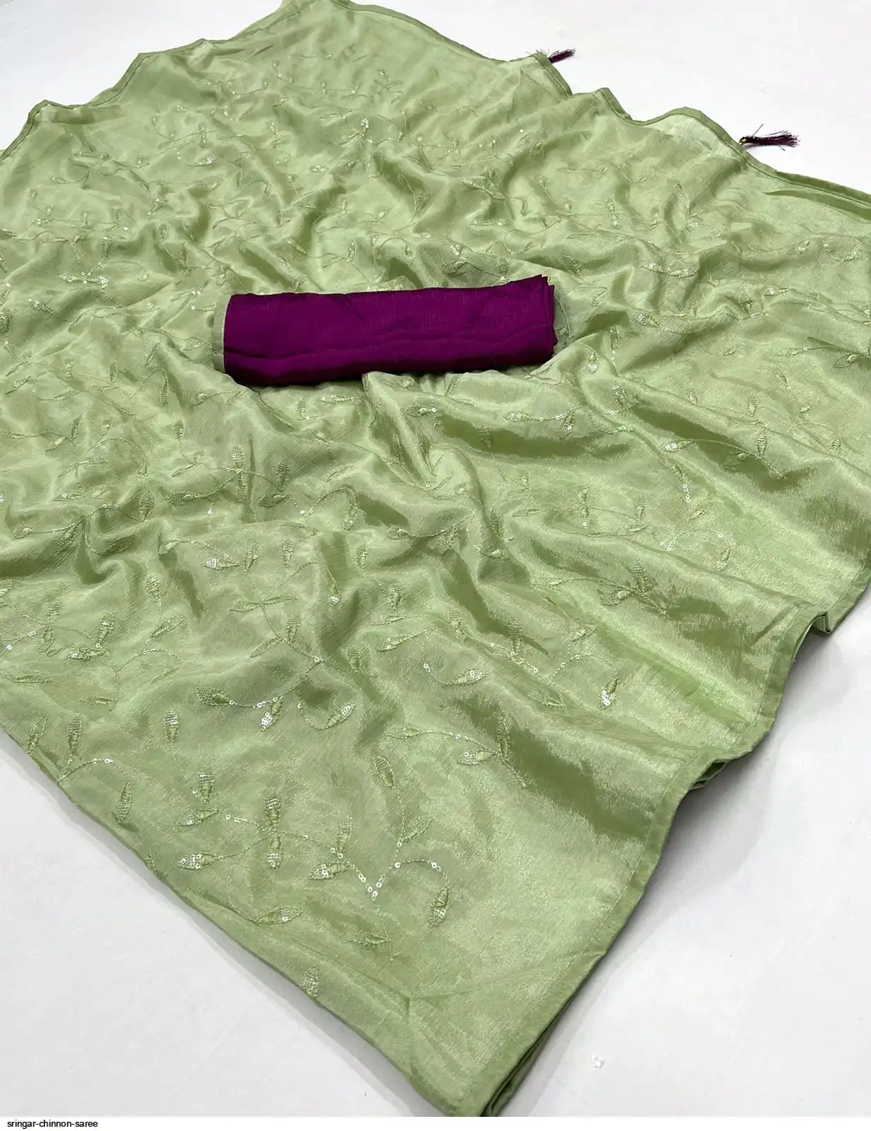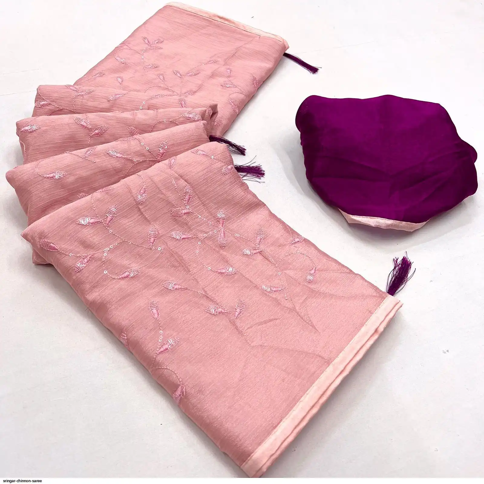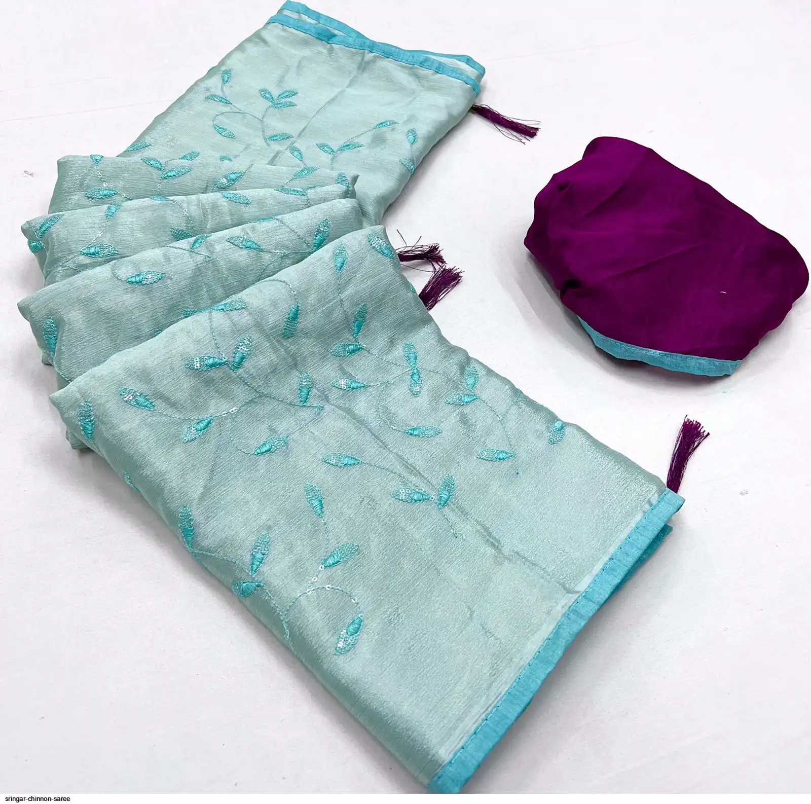 Fabric - Chinnon Fabric Full Body Sequence Embroidery Work And Small Less Piping With Contrast Shinon Blouse