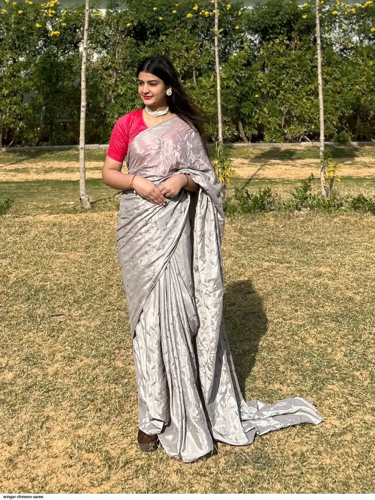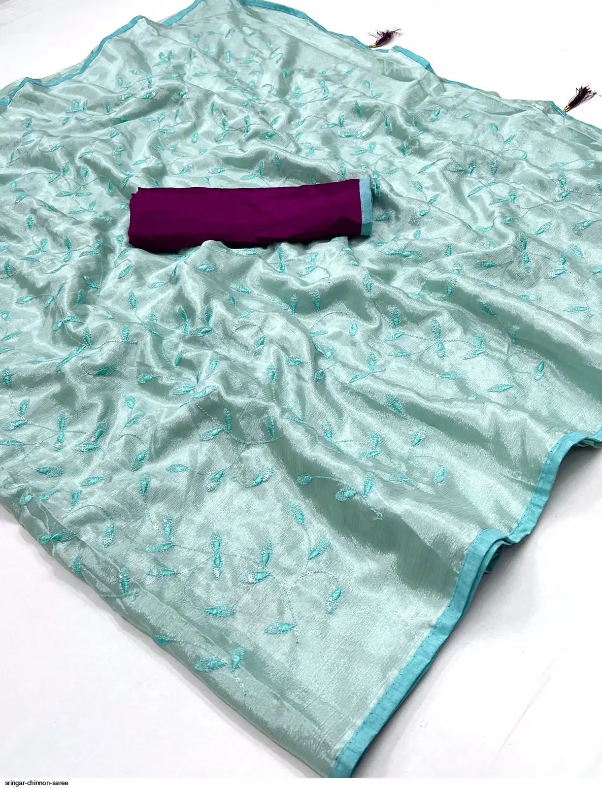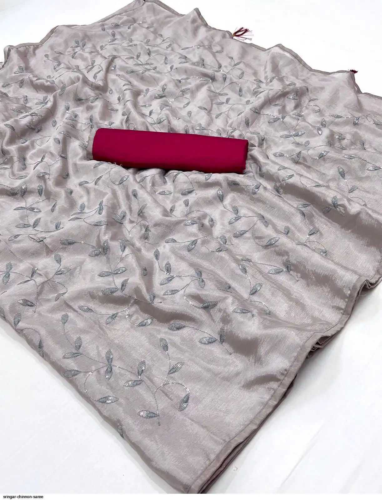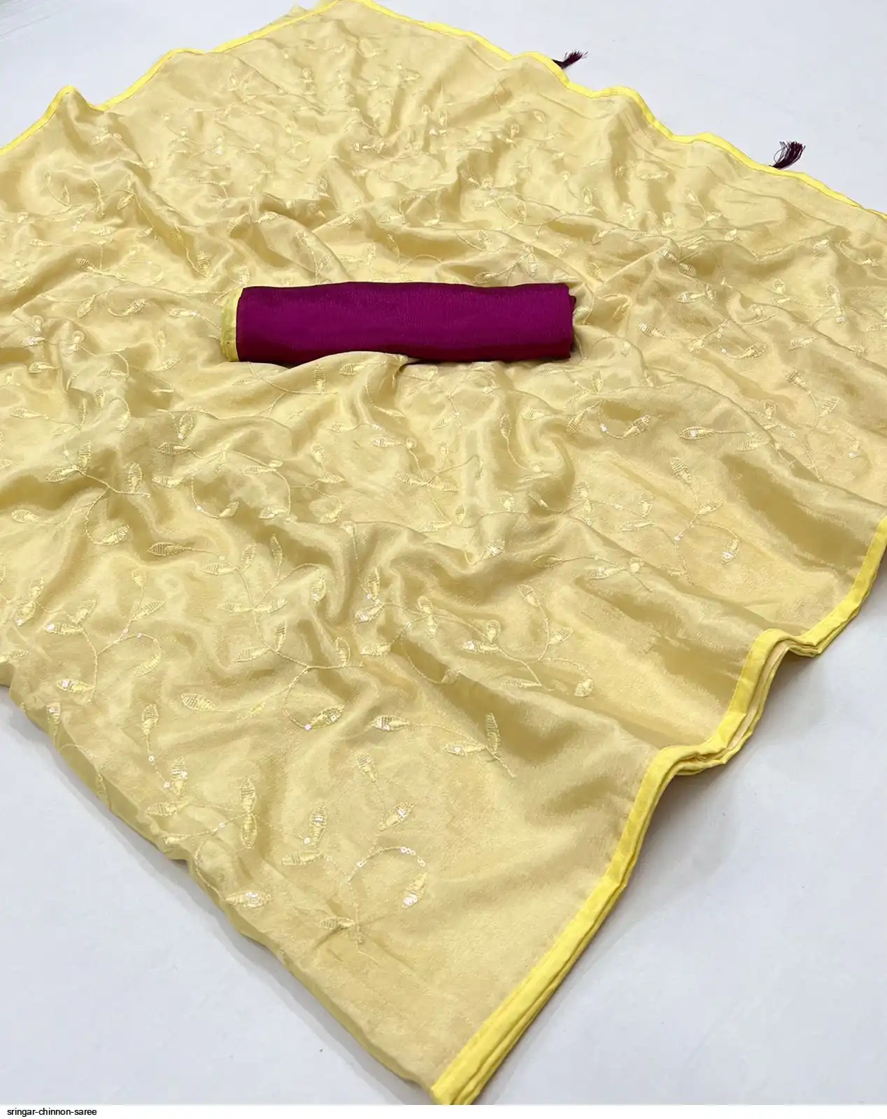 Fabric - Chinnon Fabric Full Body Sequence Embroidery Work And Small Less Piping With Contrast Shinon Blouse