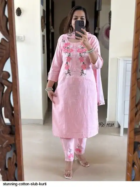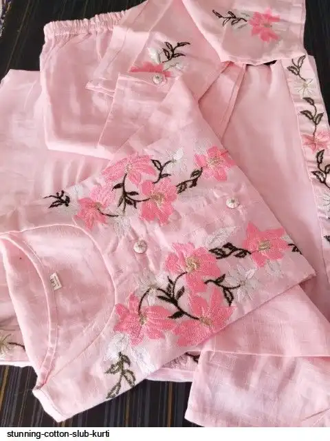 pure cotton slub kurta with heavy embroidery work on yoke paird and cotton slub pant with embroidery work