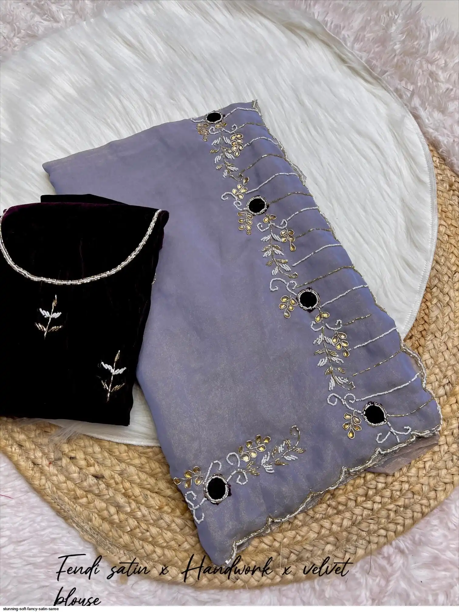 beautiful soft 2tone fancy satin saree with heavy premium c-pallu handwork + motiwork cutdana work & rich look khatli handwork border nd butti in whole saree