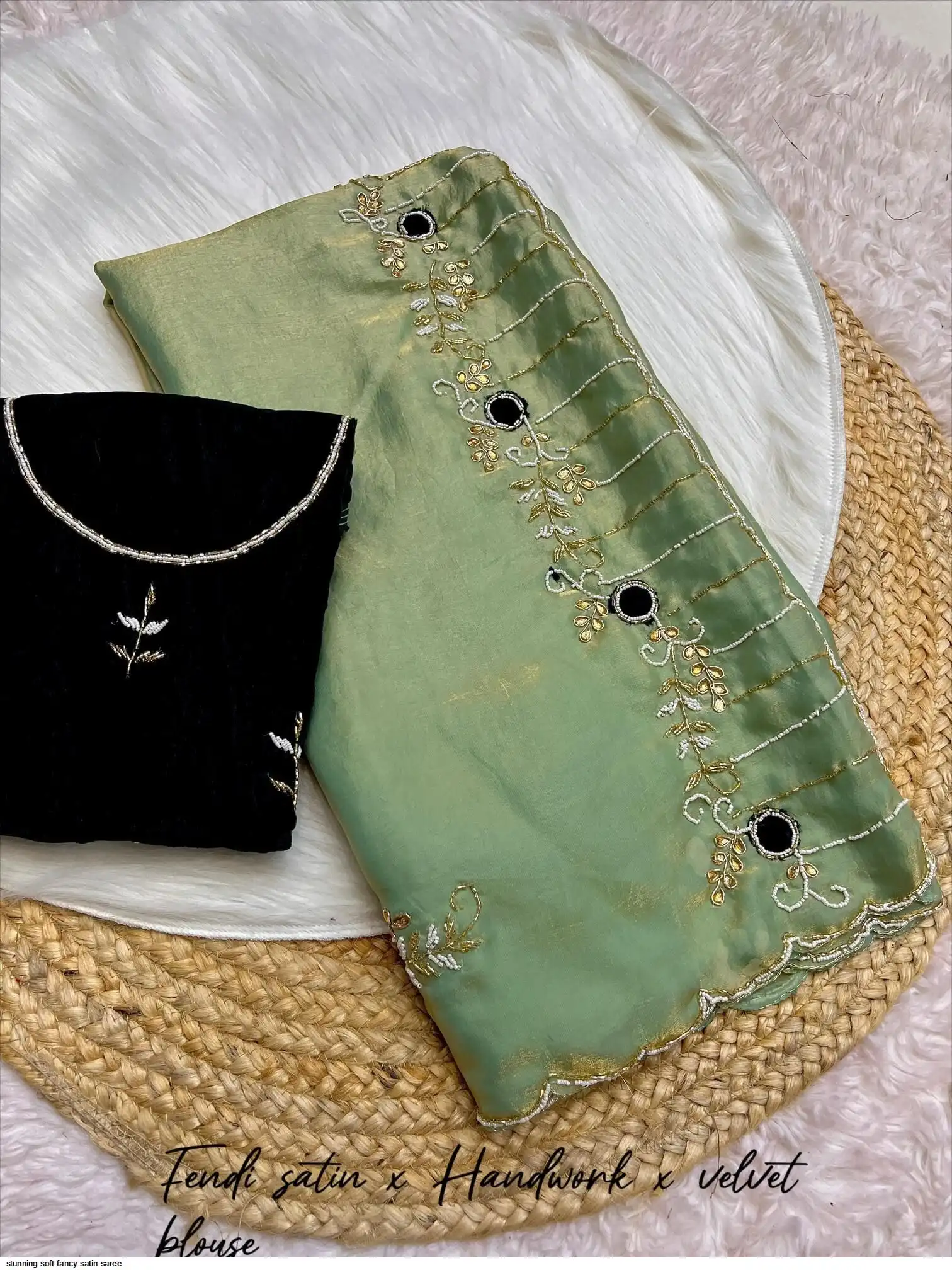 beautiful soft 2tone fancy satin saree with heavy premium c-pallu handwork + motiwork cutdana work & rich look khatli handwork border nd butti in whole saree