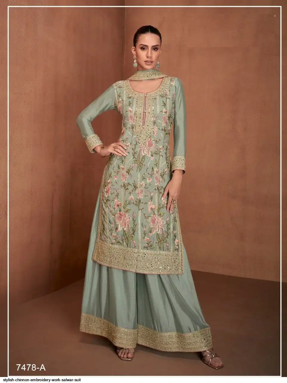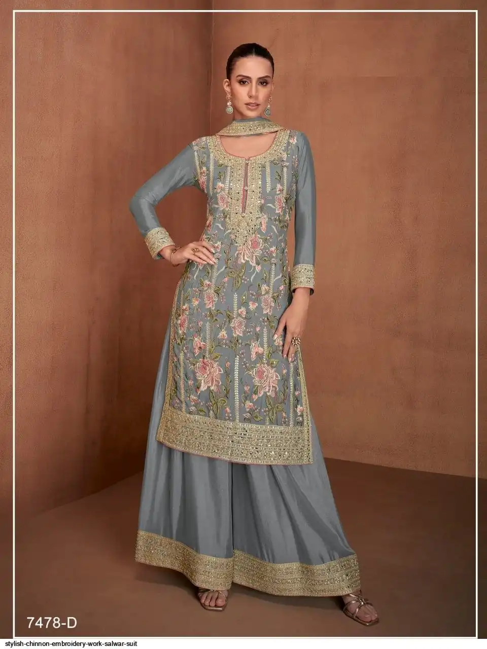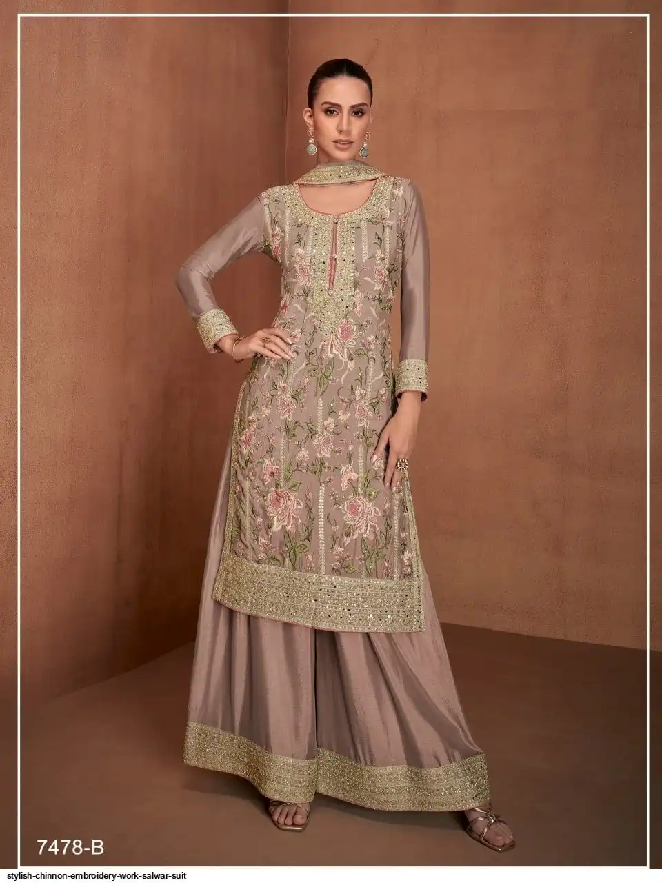 TOP :- Heavy Chinon with Embroidery Multi & 3mm Mat Squence work Sleeves :- Heavy Semi Chinon Silk