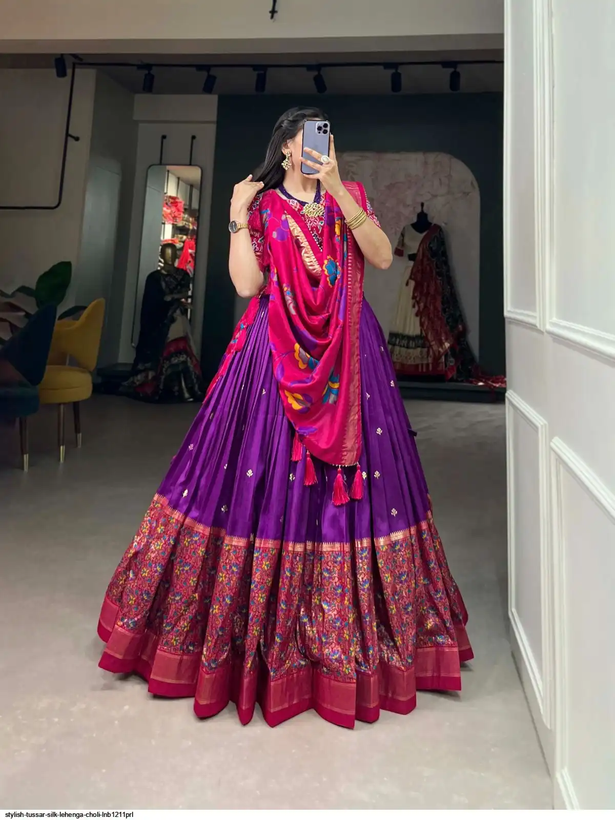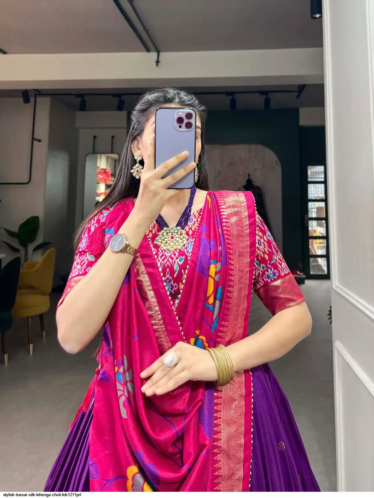 Drape yourself in the elegance of Tussar Silk Lehenga, where print tells a story of timeless beauty and sophistication .