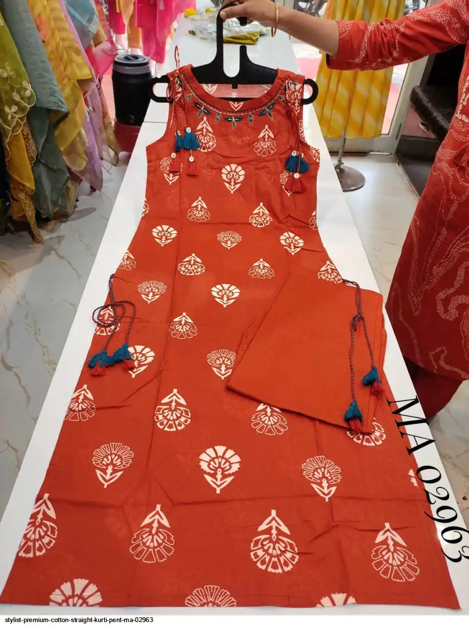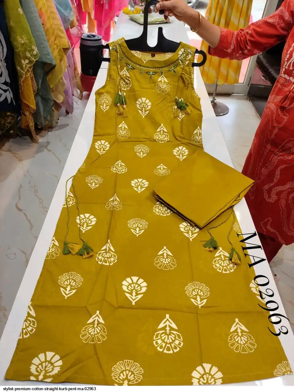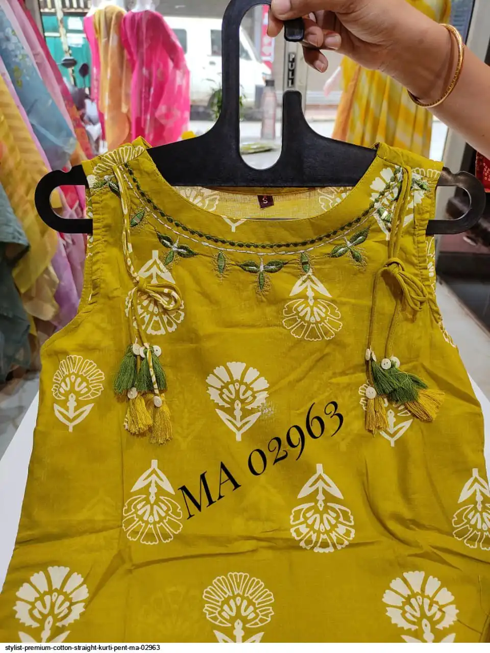 Top - premium cotton beautiful print sleeves less straight kurti with tassels