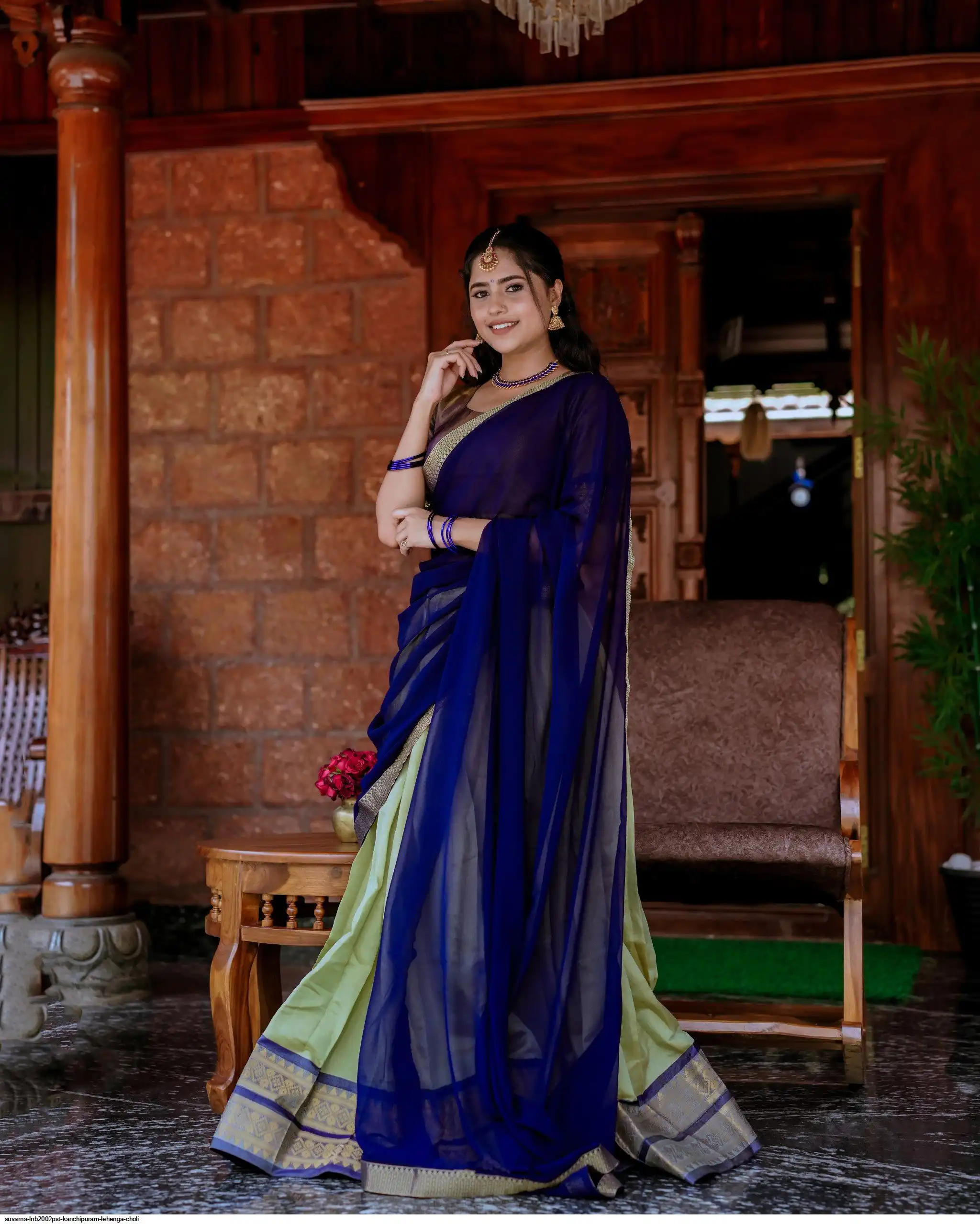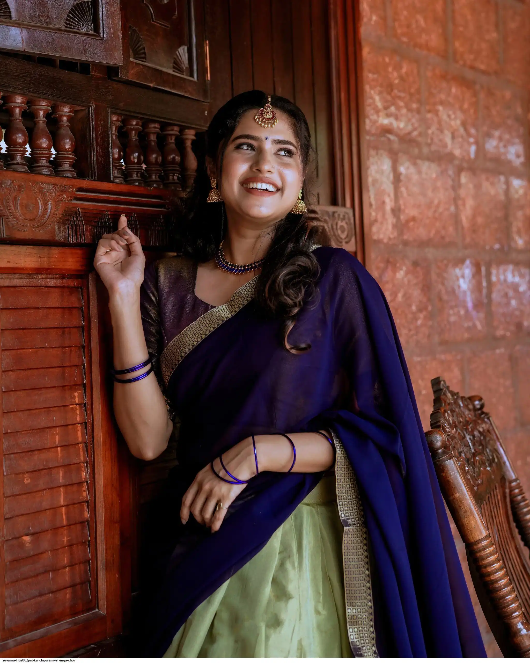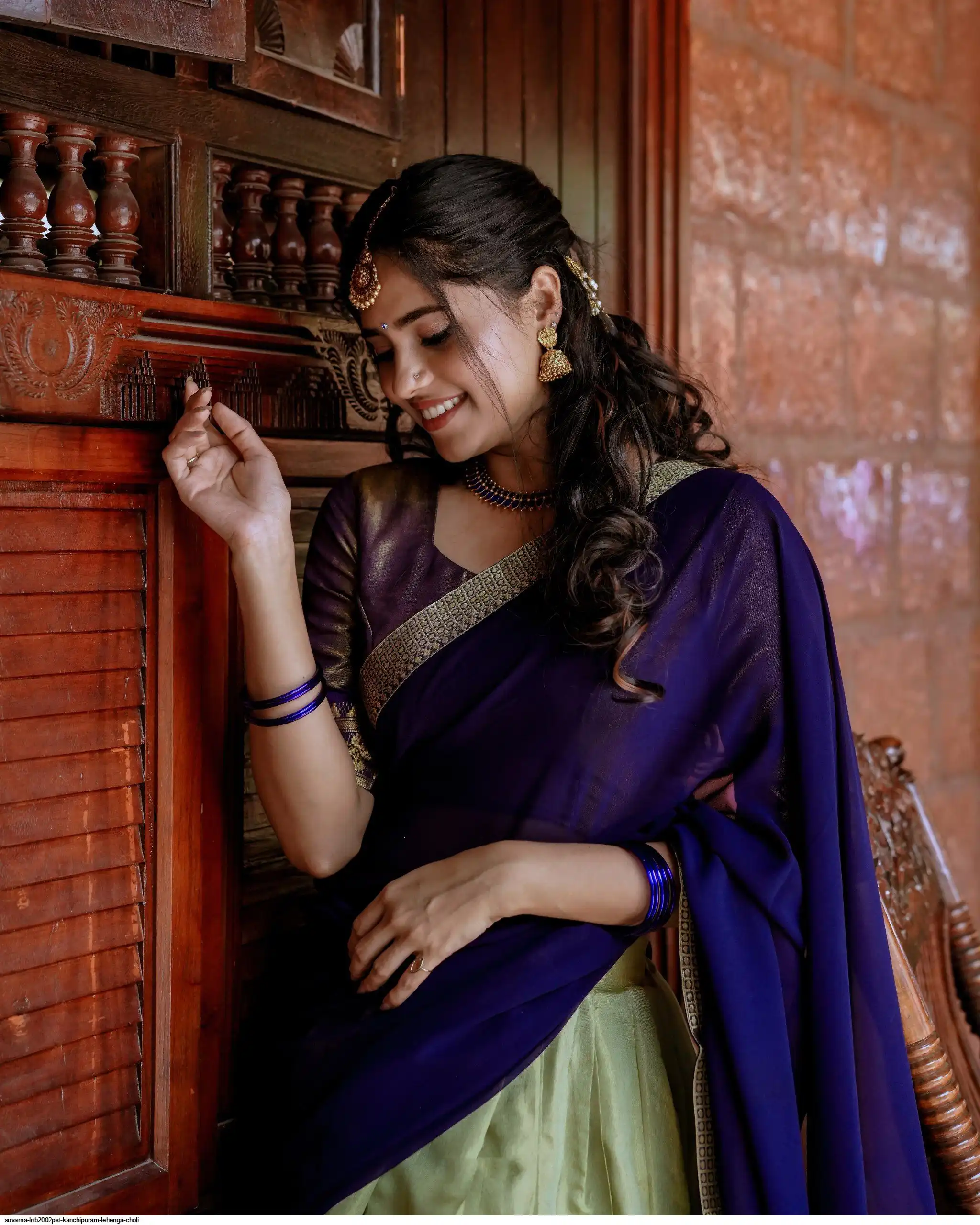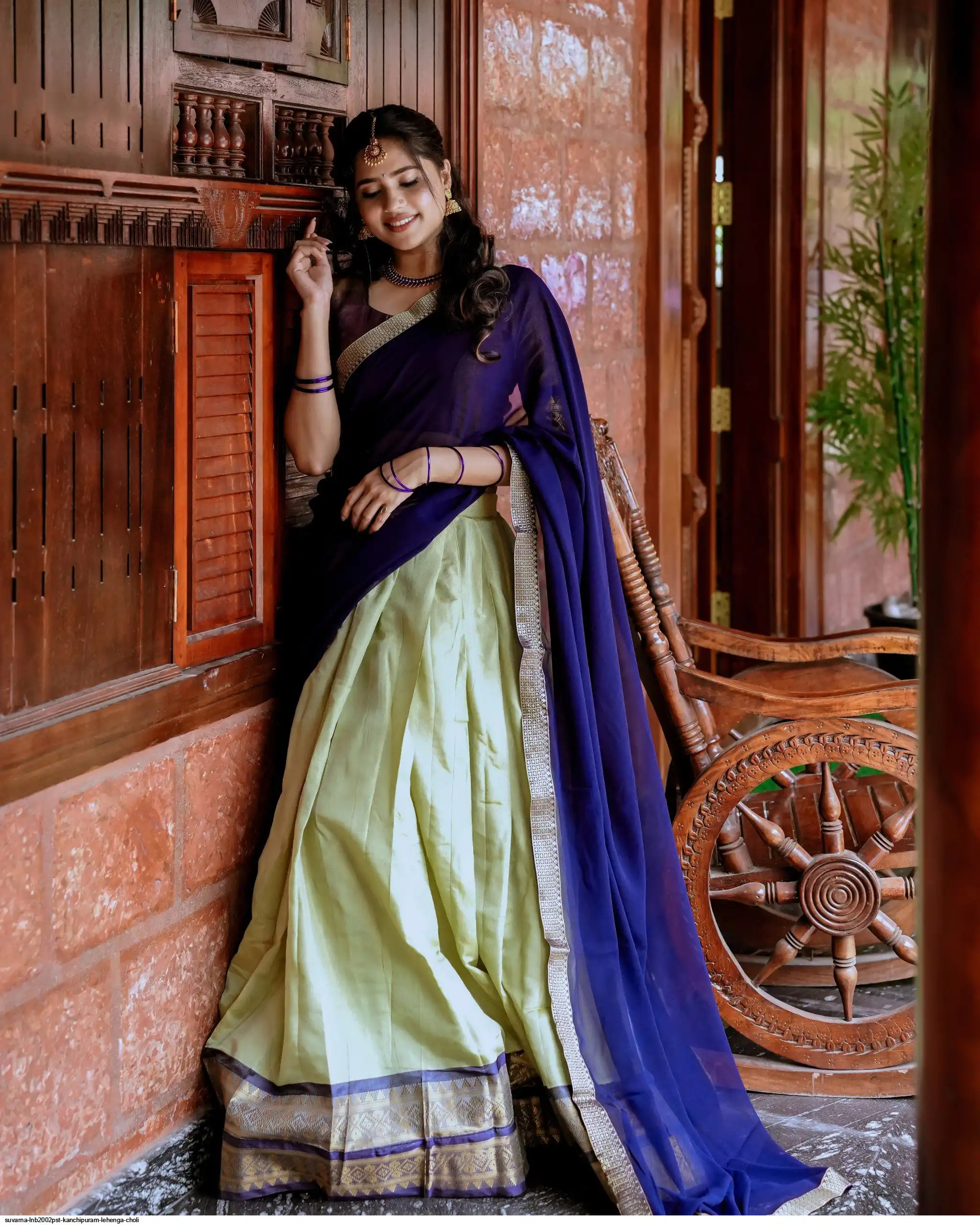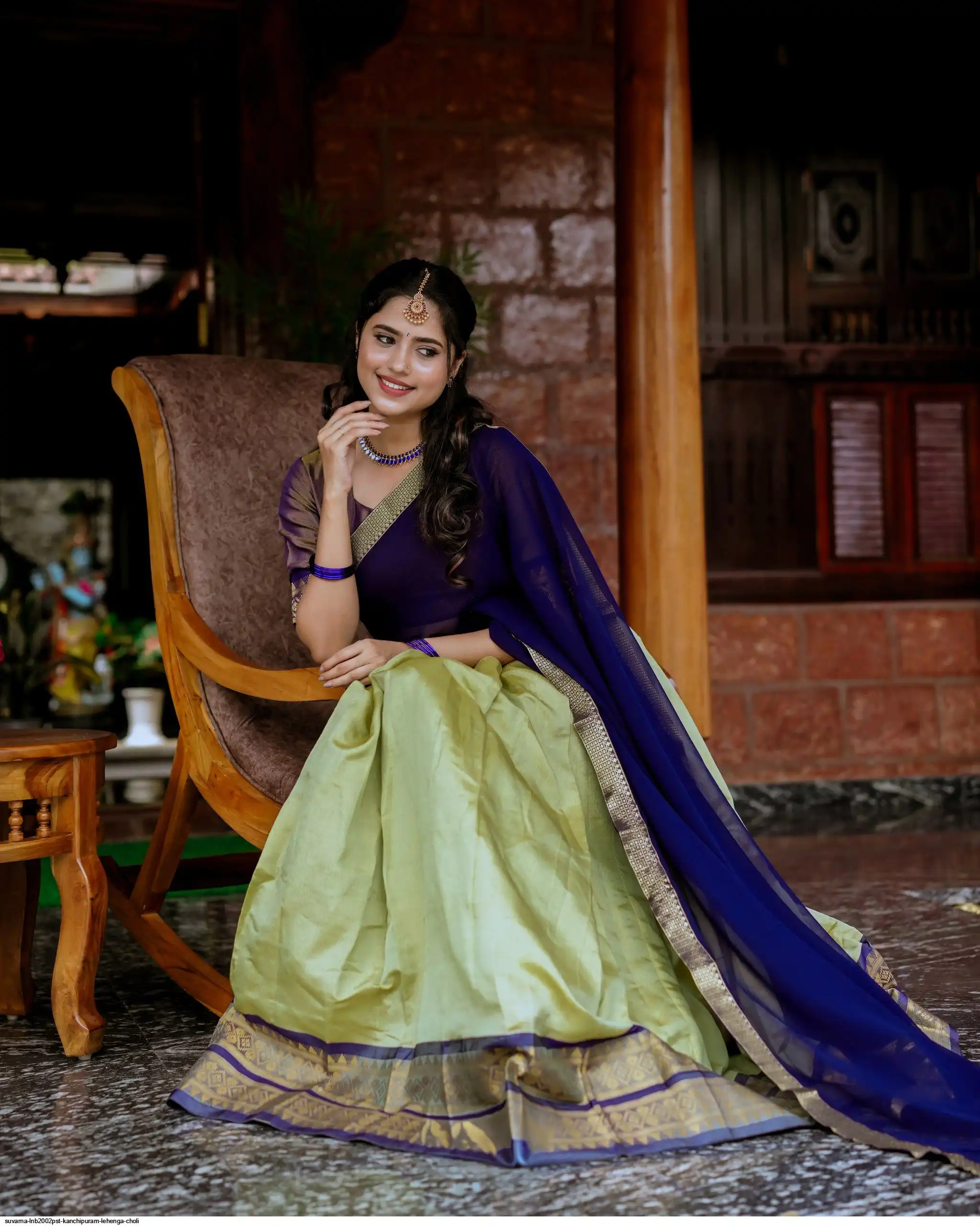 Heritage redefined in this Kanchipuram lehenga choli. Perfectly adorned with intricate zari weaving for a regal touch🪸