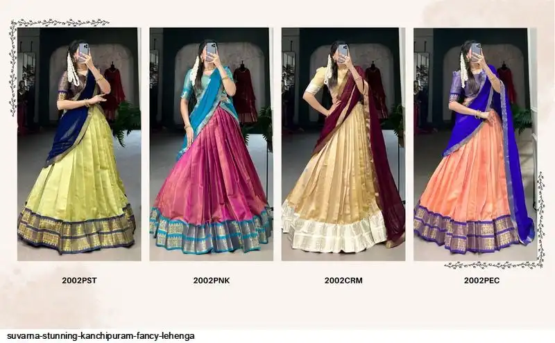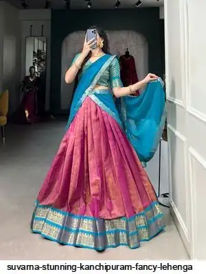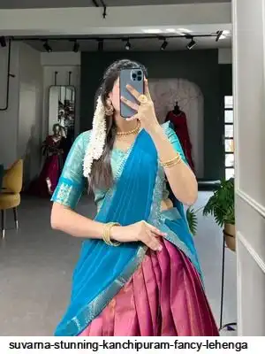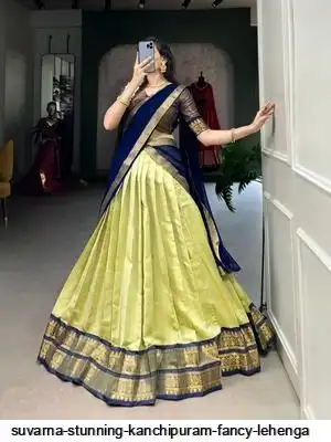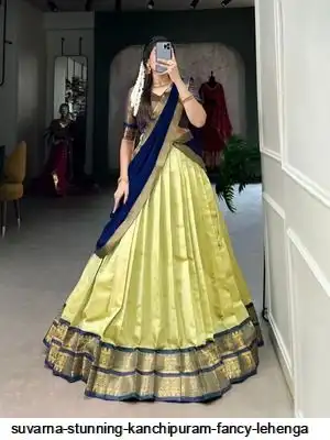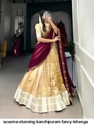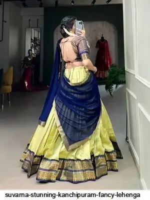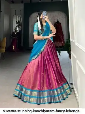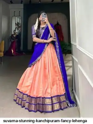 Kanchipuram lehenga choli. Perfectly adorned with intricate zari weaving for a regal touch