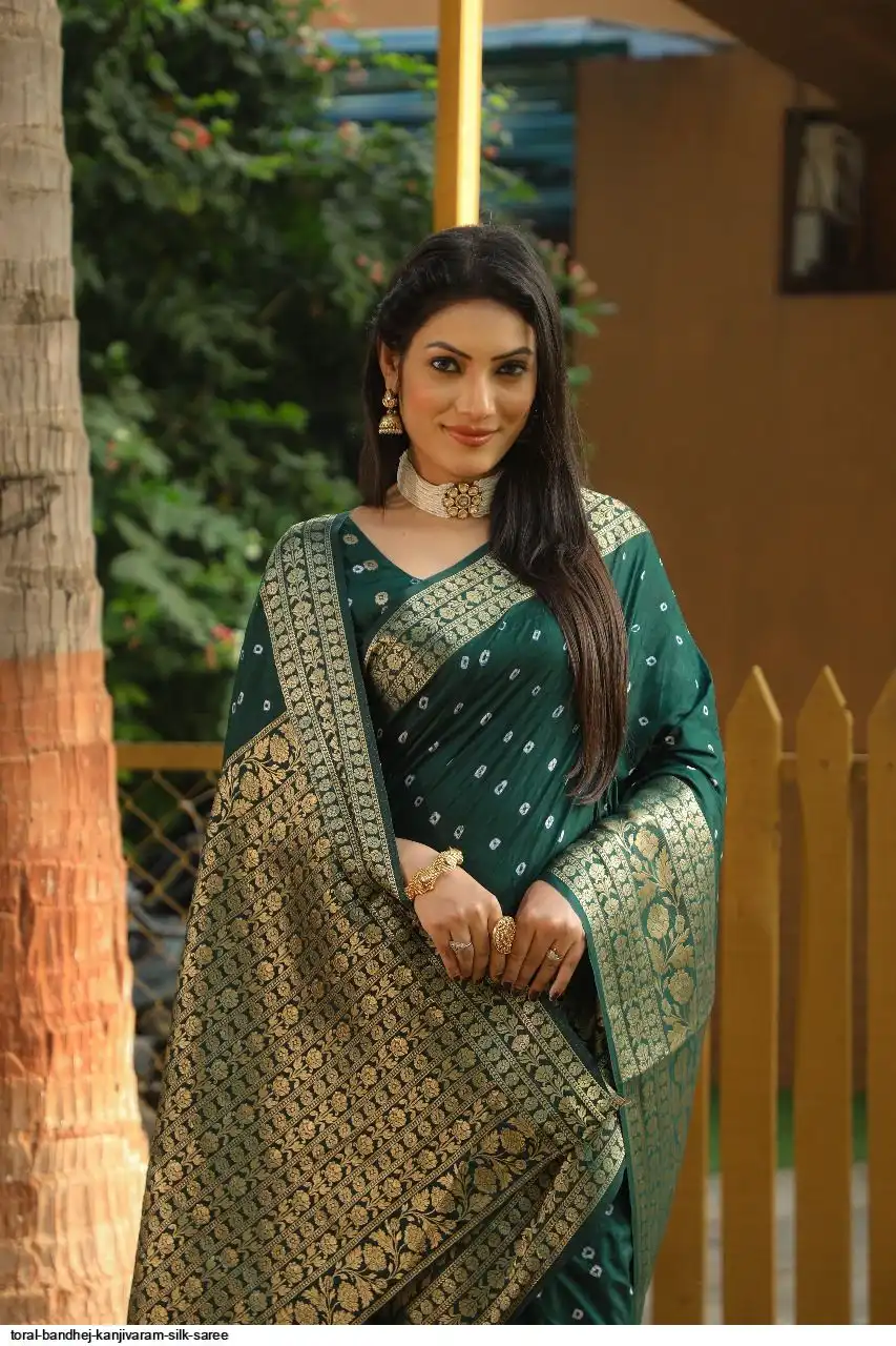 Pure Handmade Bandhej Kanjivaram silk saree made by original Bandhej with Kanjivaram Border with Zari Weaving Rich Pallu saree with beautiful Bandhej design and having a weaving Rich Pallu.