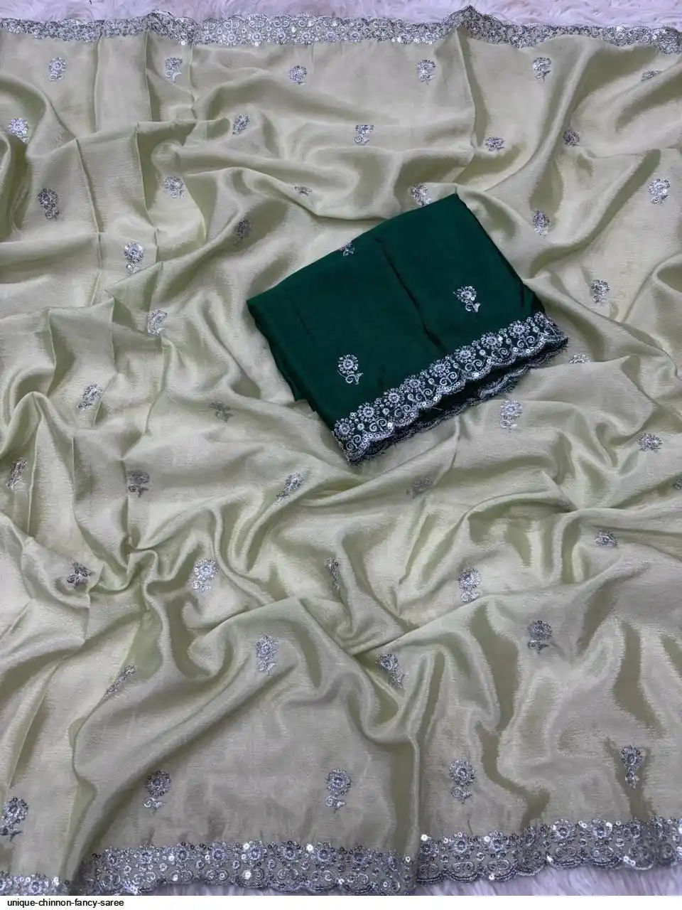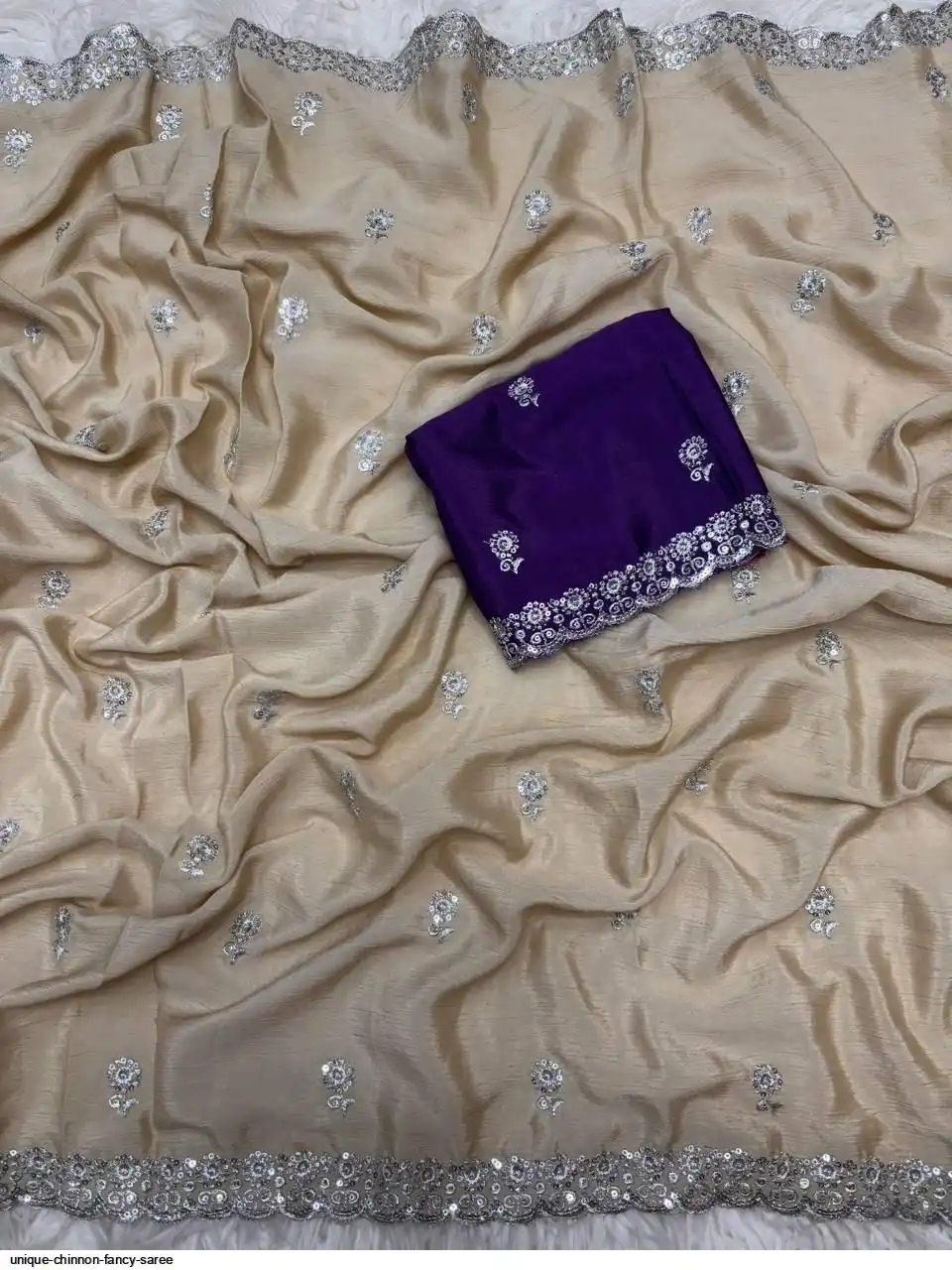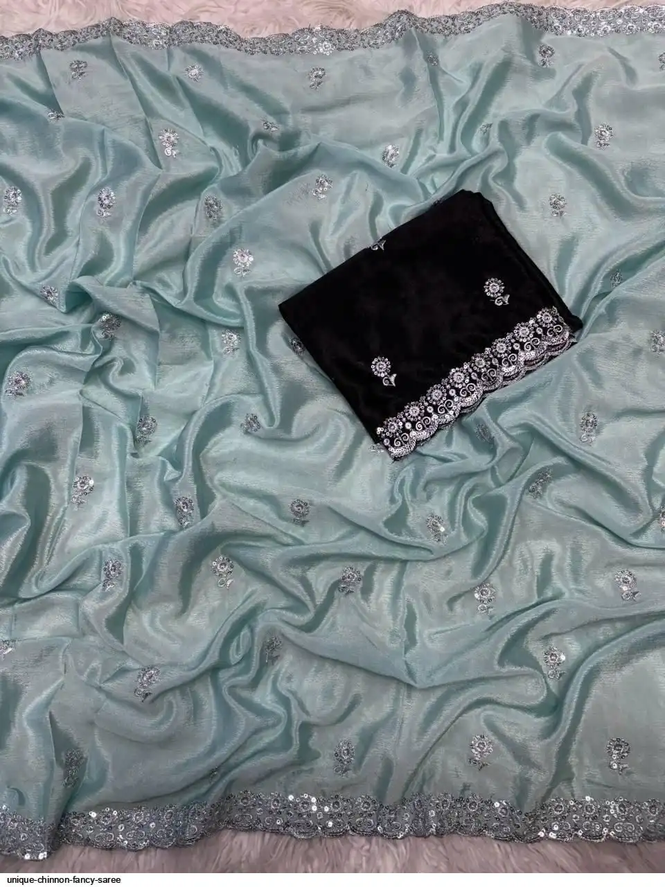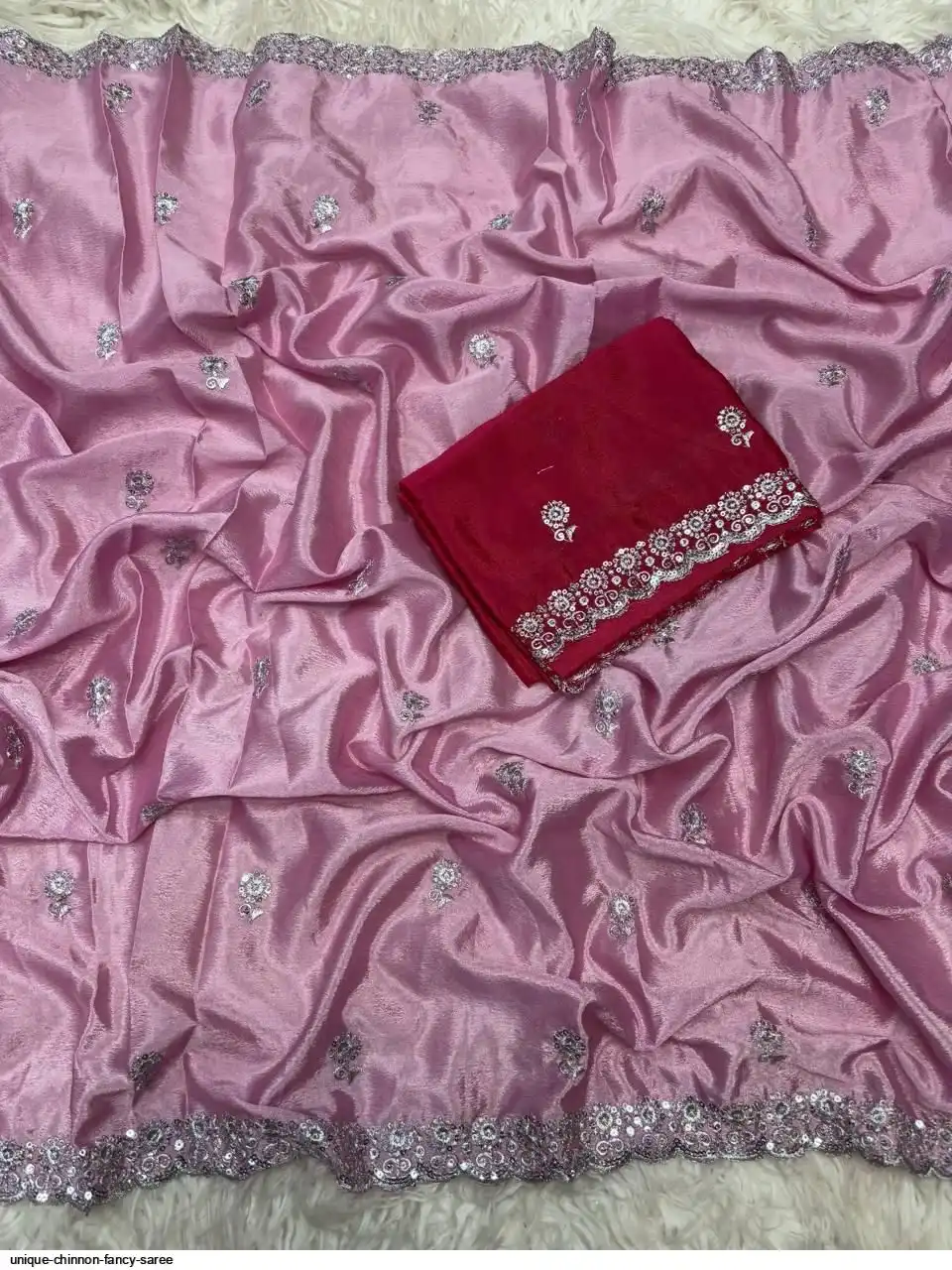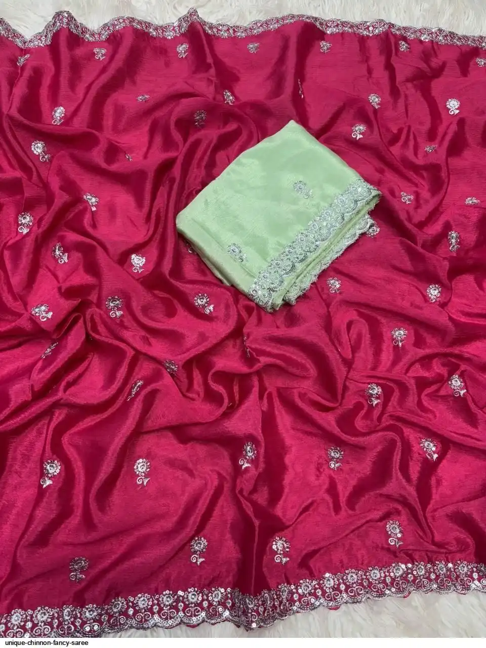 Pure Chinnon with pure silver zari embroidered worked with contrast color worked blouse