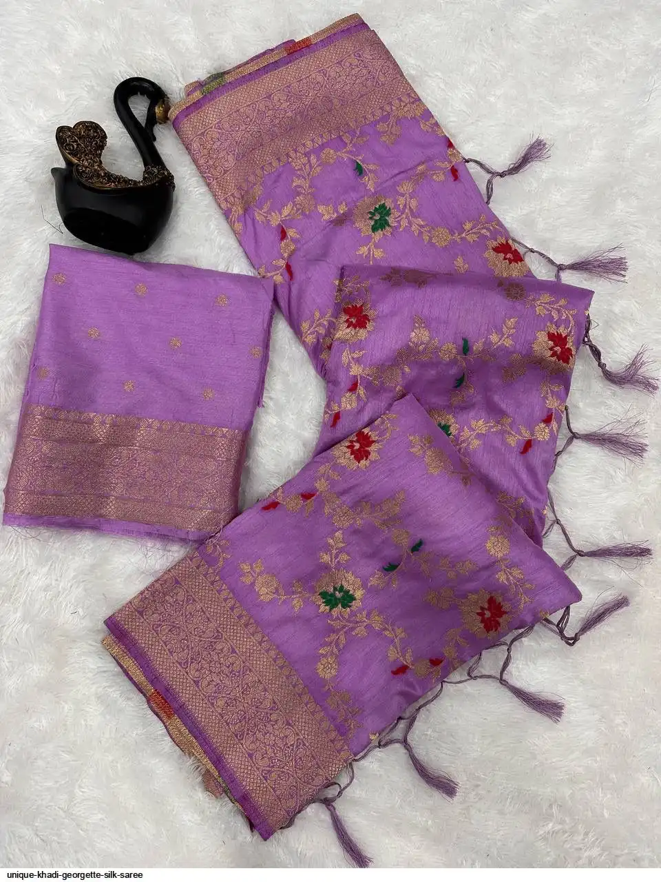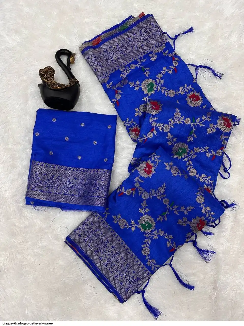 The beautiful gold zari weaving on soft, smooth,flowing pure Banarasi Khadi Georgette Silk sarees that is apt for the festival and wedding seasons