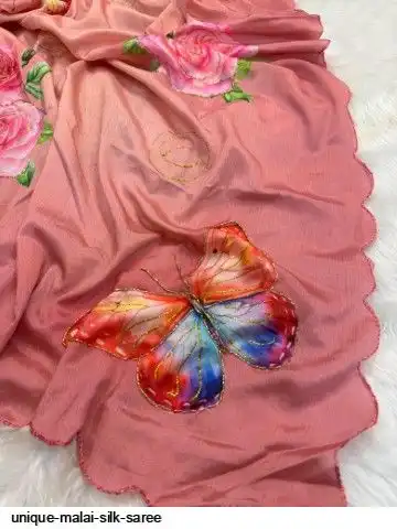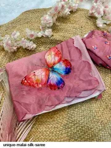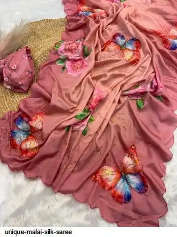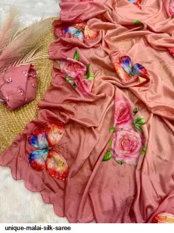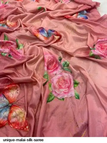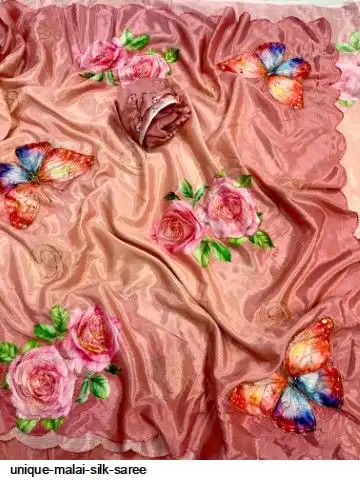 Pure malai silk saree with beautiful digital prints butterfly & flower with handwork & zari foil print work in all over sarees & outing thread border in all over saree ,paired with malai silk fabric with handwork