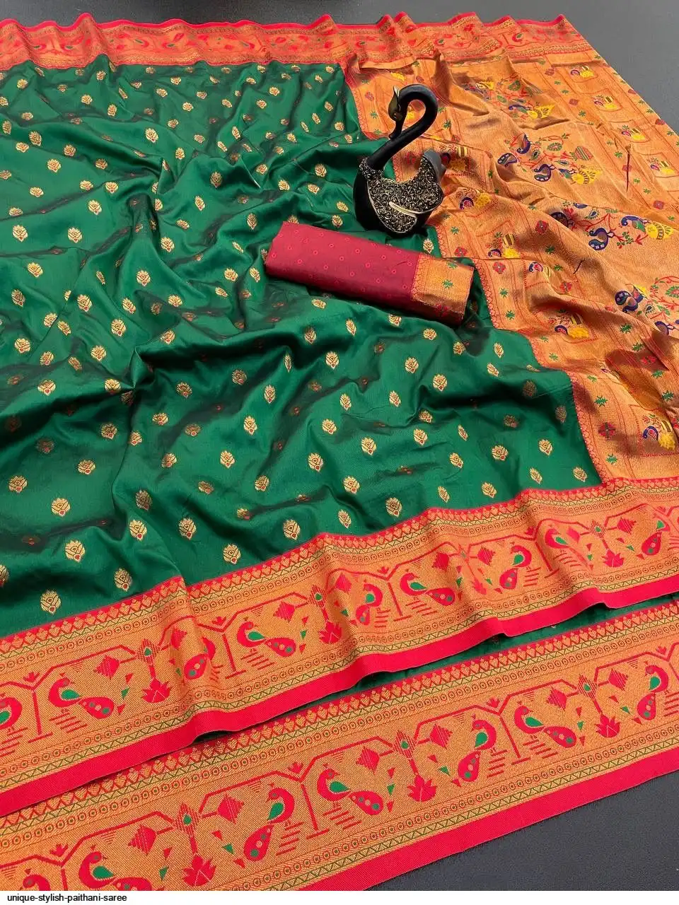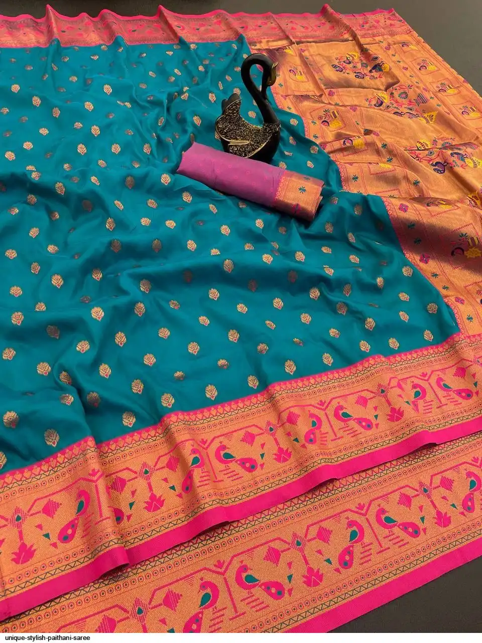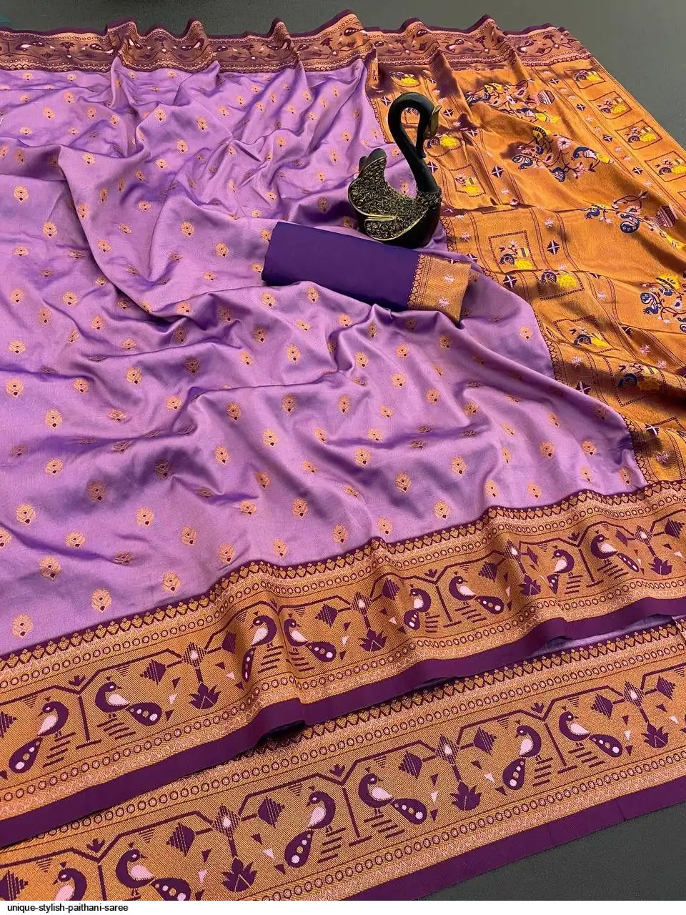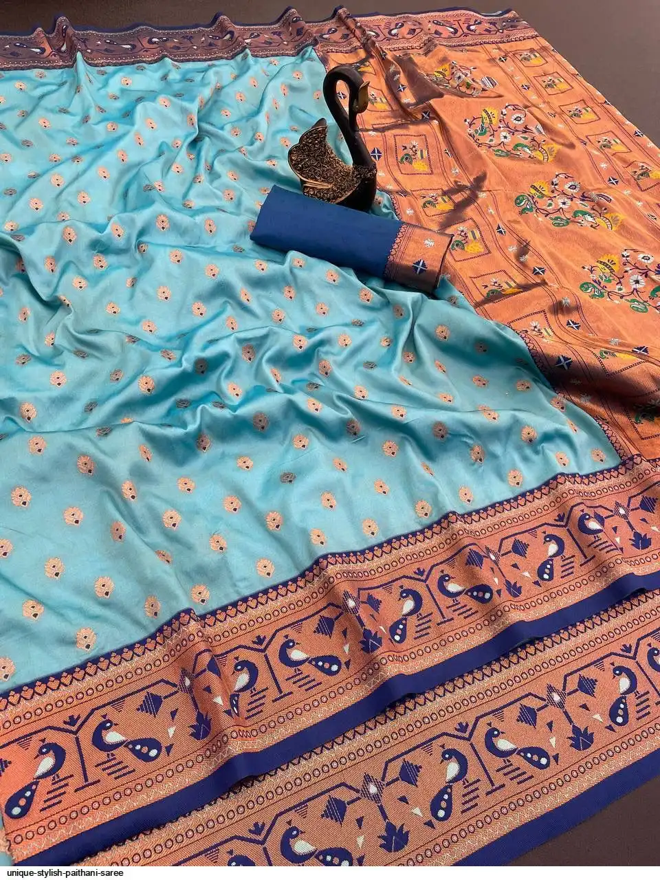 Paithani Saree with copper zari meenakari motifs all over the body having contrast rich woven meenakari Fancy Paithani Pallu, unique meenakari border and paired with Contrast brocade Blouse same as shown.