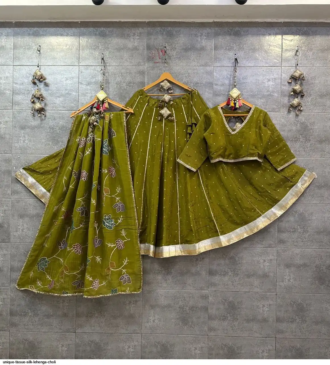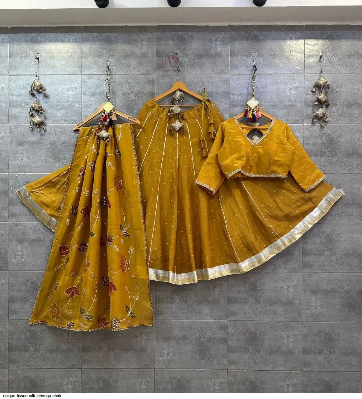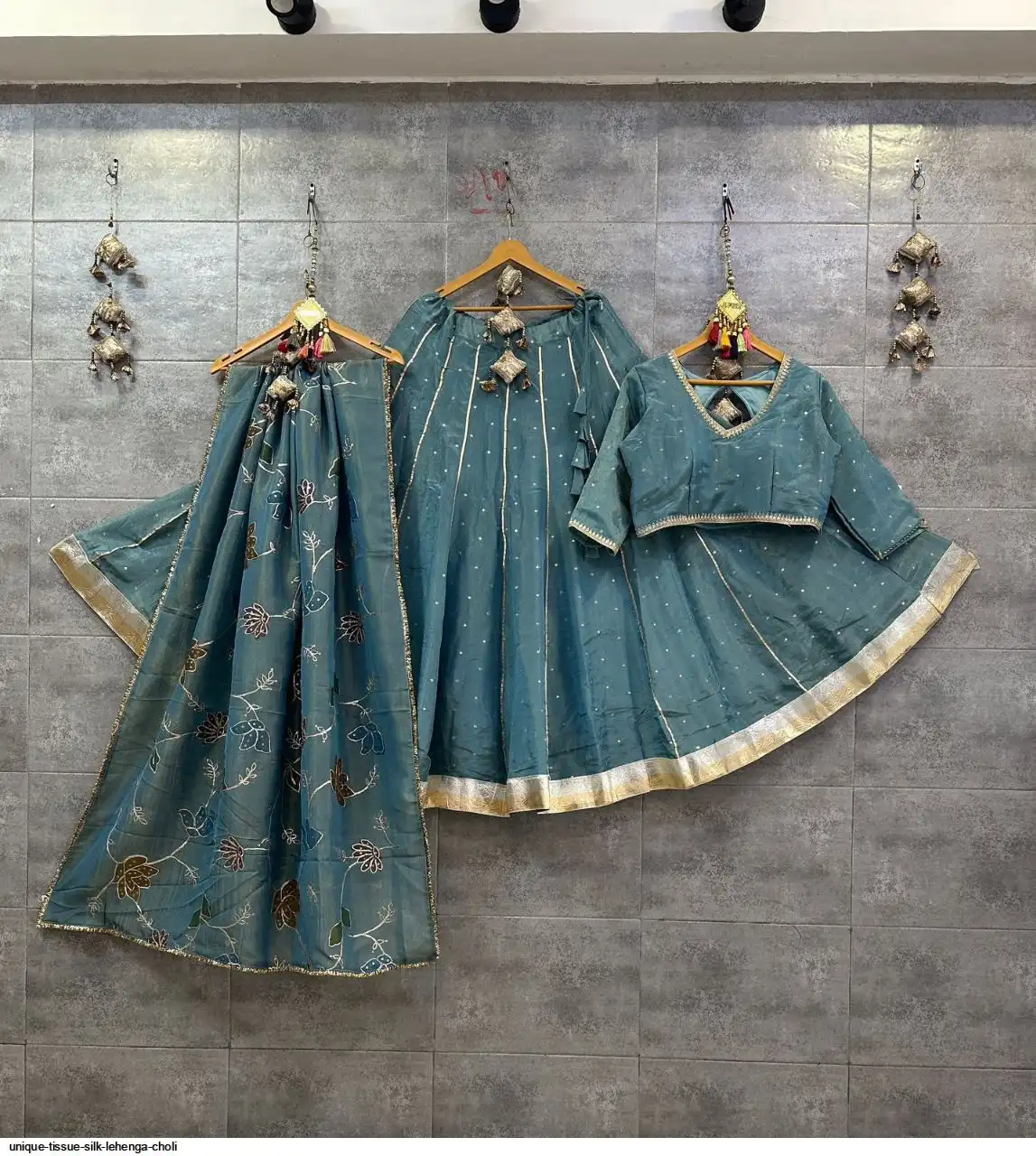 Tissue silk 3 mm butti work chaniya choli with heavy brush print duptt