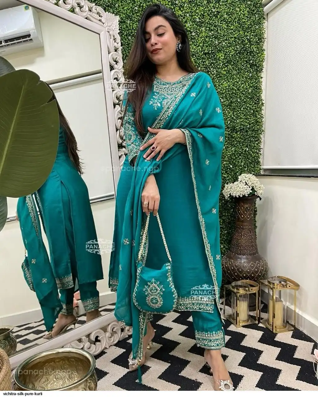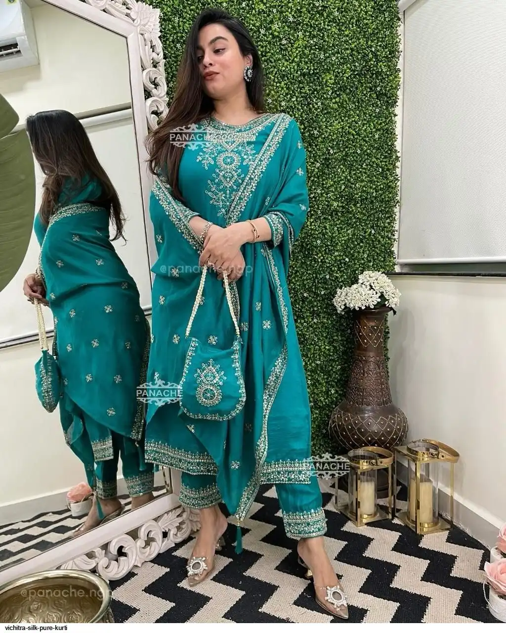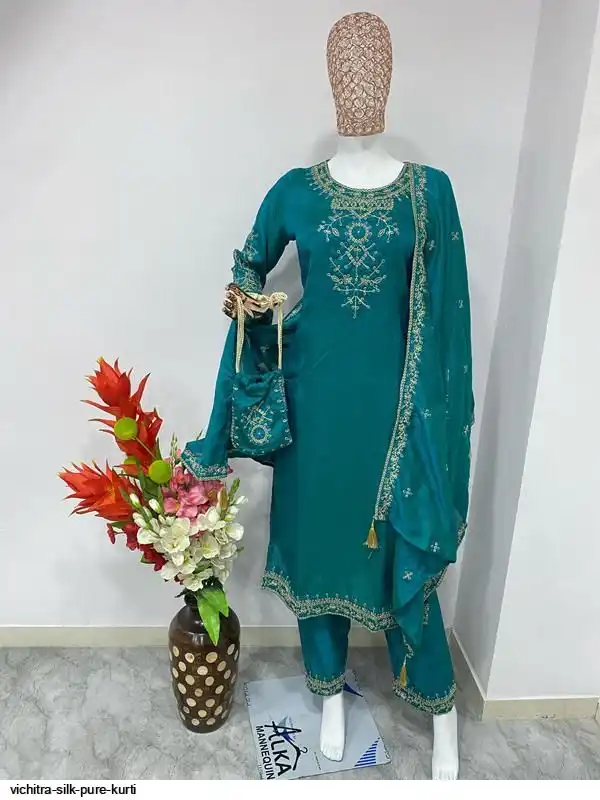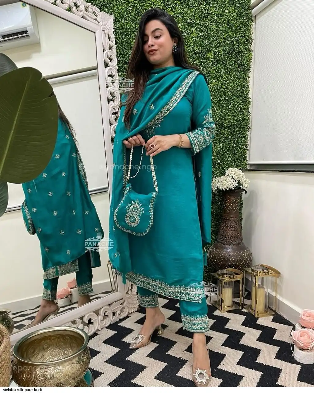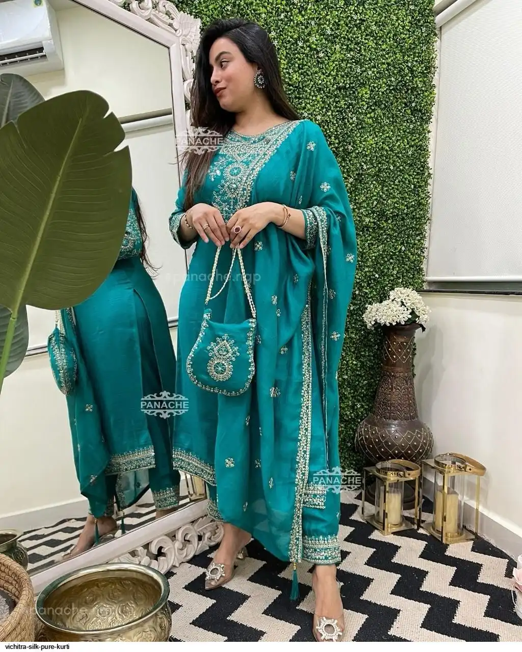 *Presenting Beautiful Heavy VICHITRA BLUMING Silk Fabric designer festive wear kurti pant and duppta with Coding work with lining