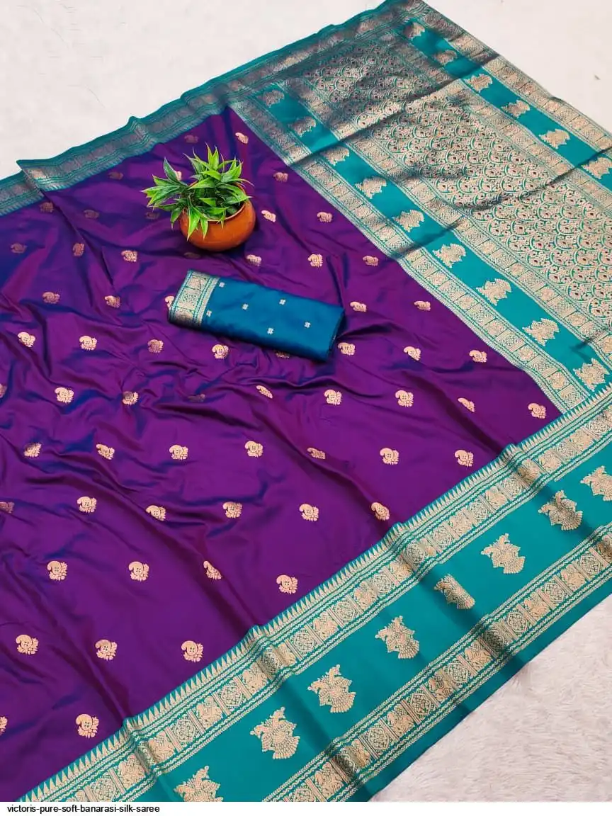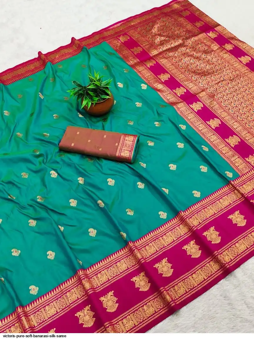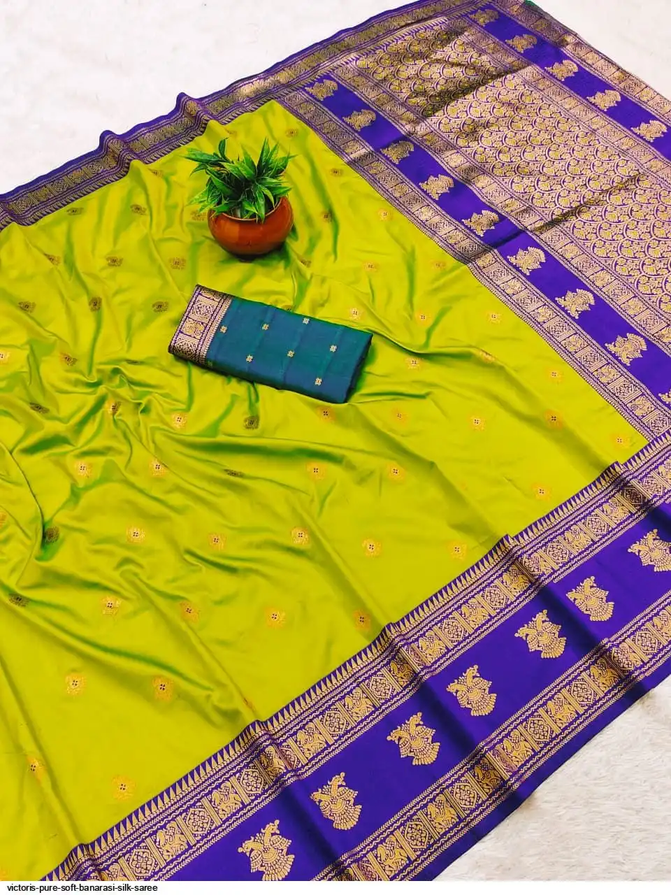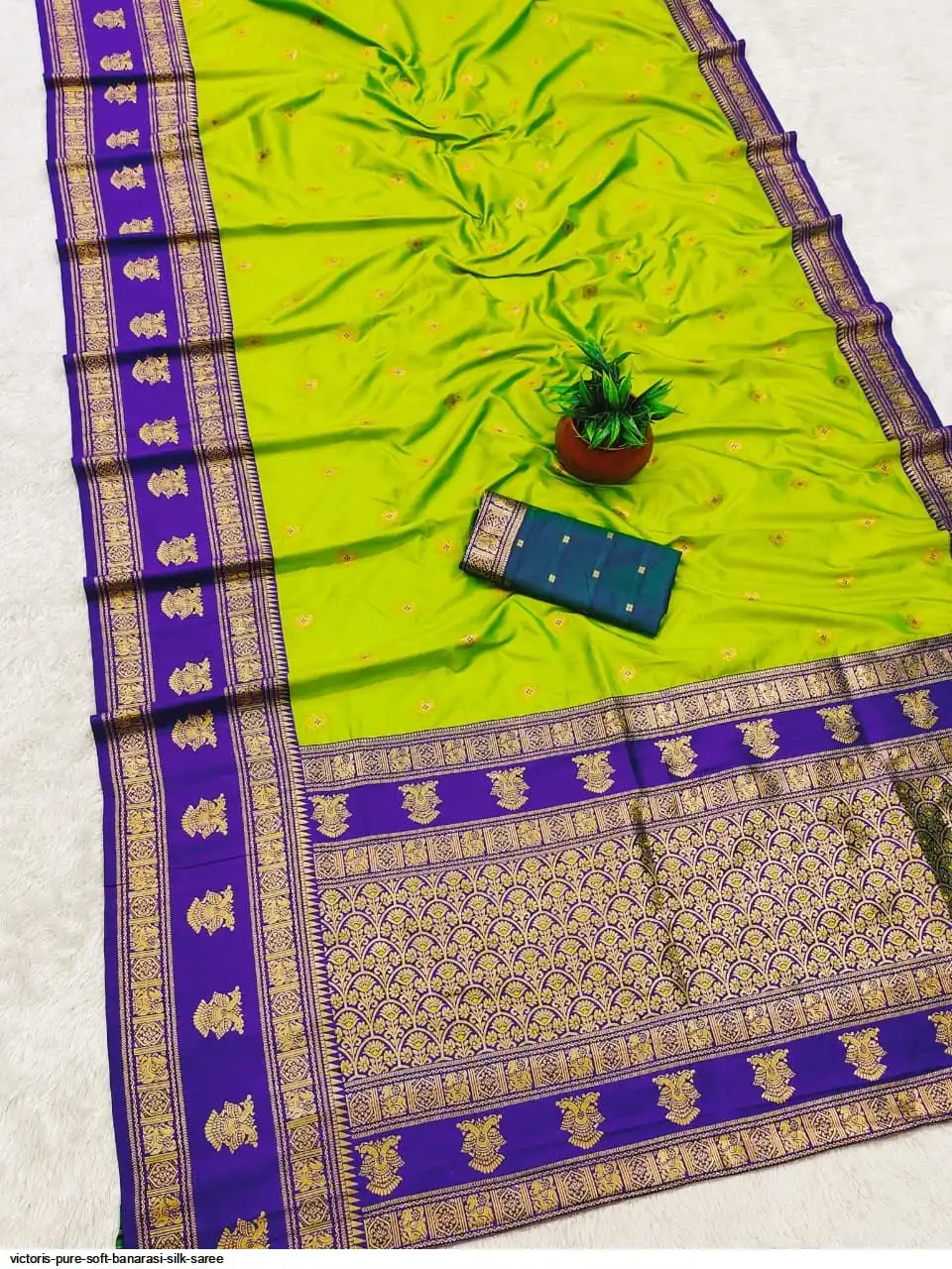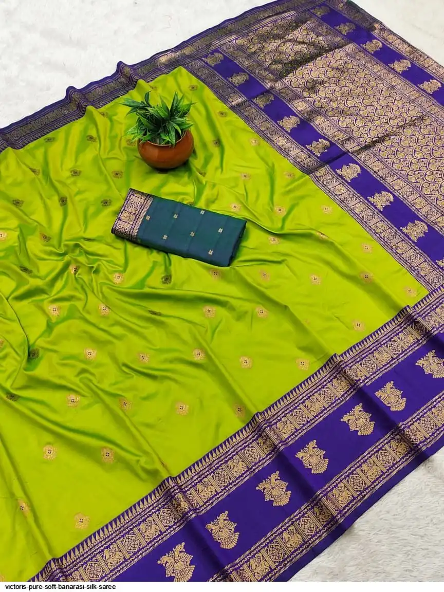 FABRIC :- Pure Soft Banarasi Silk Saree With Beautiful Weaving Border With All Over Beautiful Design With Gold Zari And Silver Zari Weaving Design And Rich Weaved Pallu And Blouse