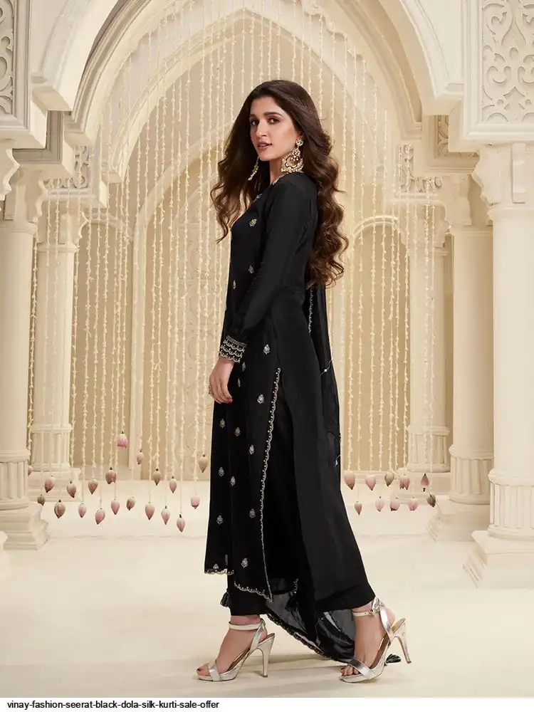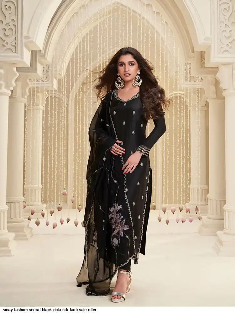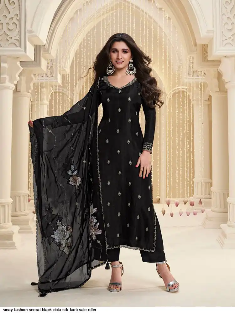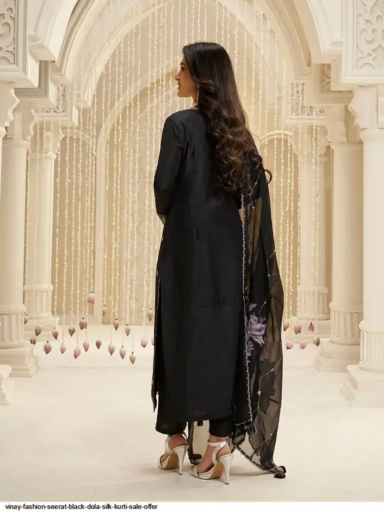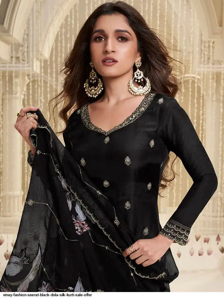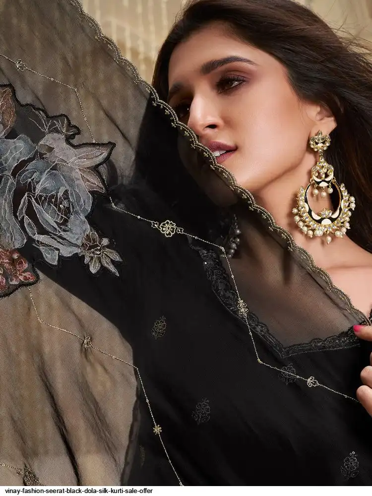 Black Dola Silk Kurta with Cutwork Neckline and Embroidered work buttis with Scalloped Daman. Paired with Straight Pants and Organza Fabric Digital Printed Applique work Dupatta with four sided cutwork border and thread embroidery