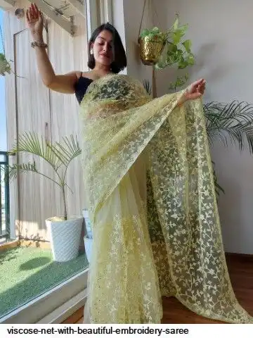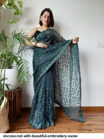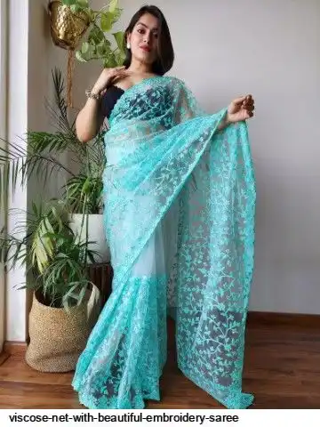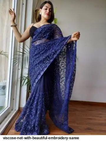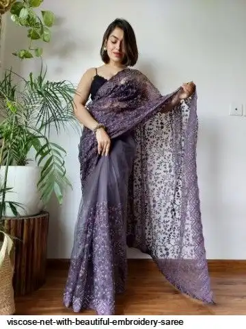 Viscose net saree with beautiful embroidery work all over cover woth diamond and plain silk blouse