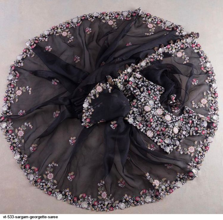 SAREES FABRIC.:-Faux Georgette fabric with Multicolour thread work and sequins work .All over sarees Multicolour butta work and arc cutting border
