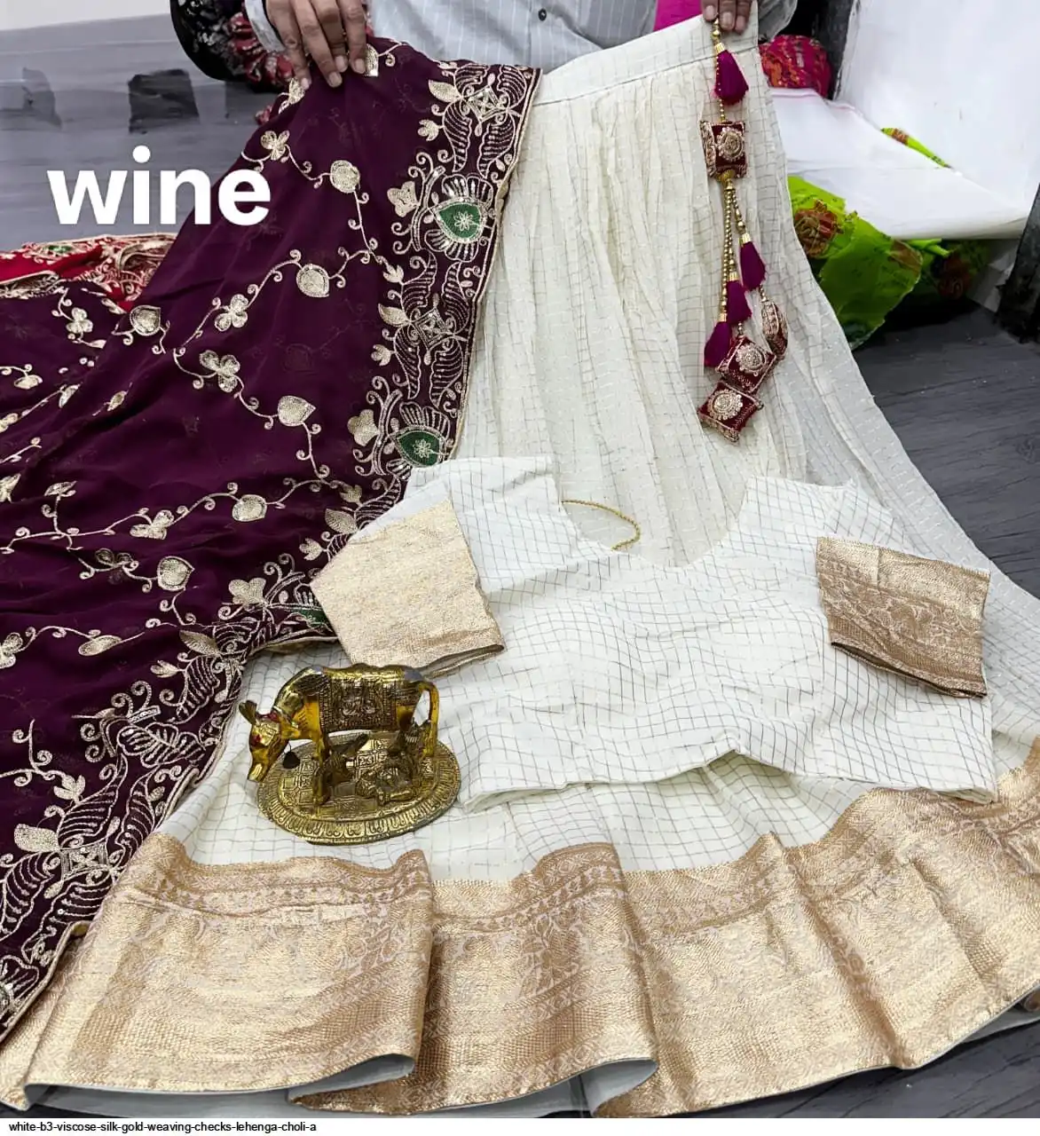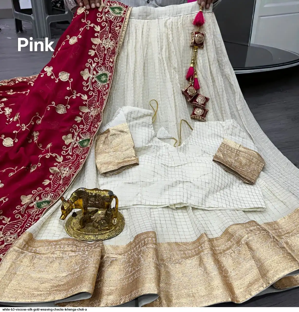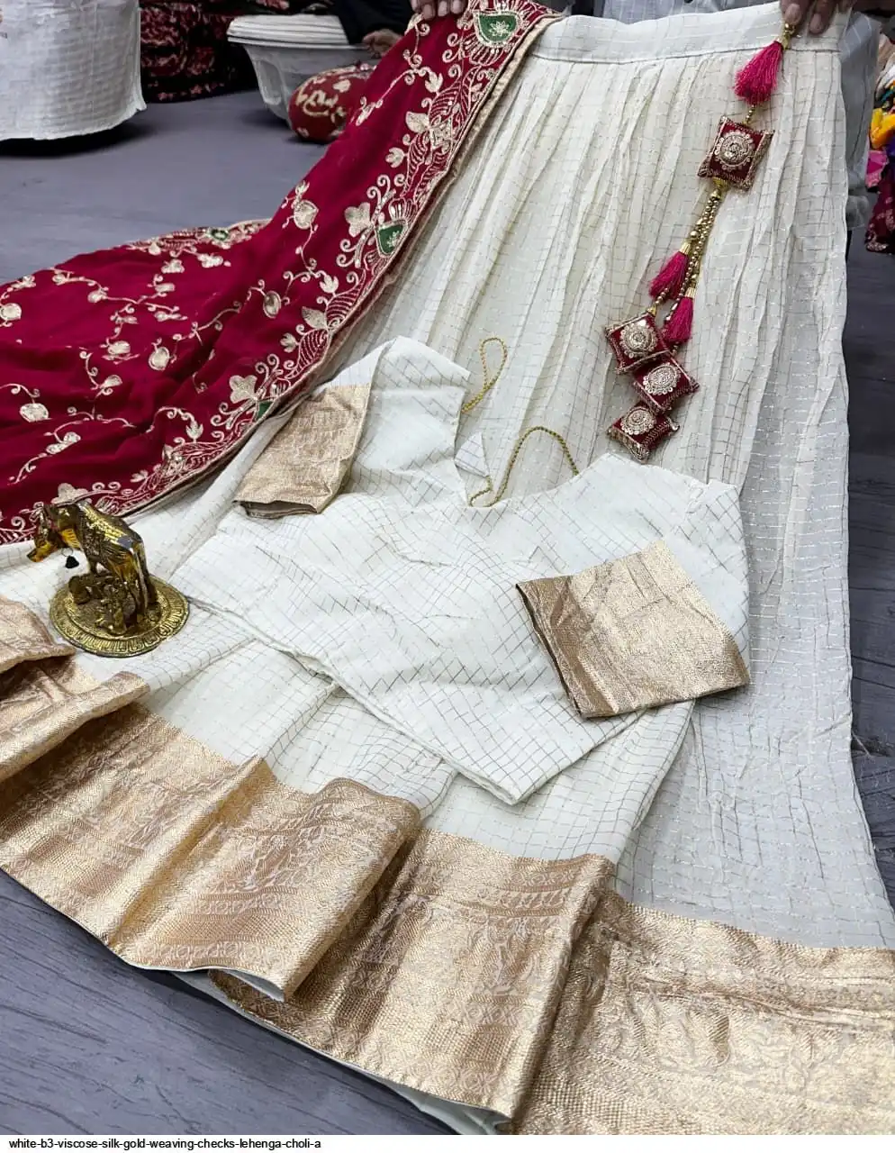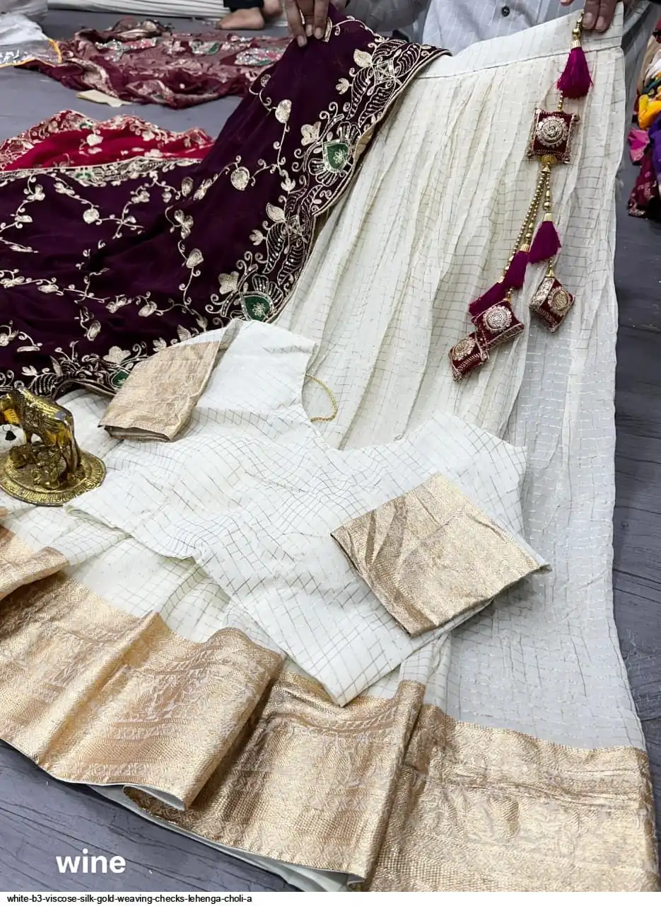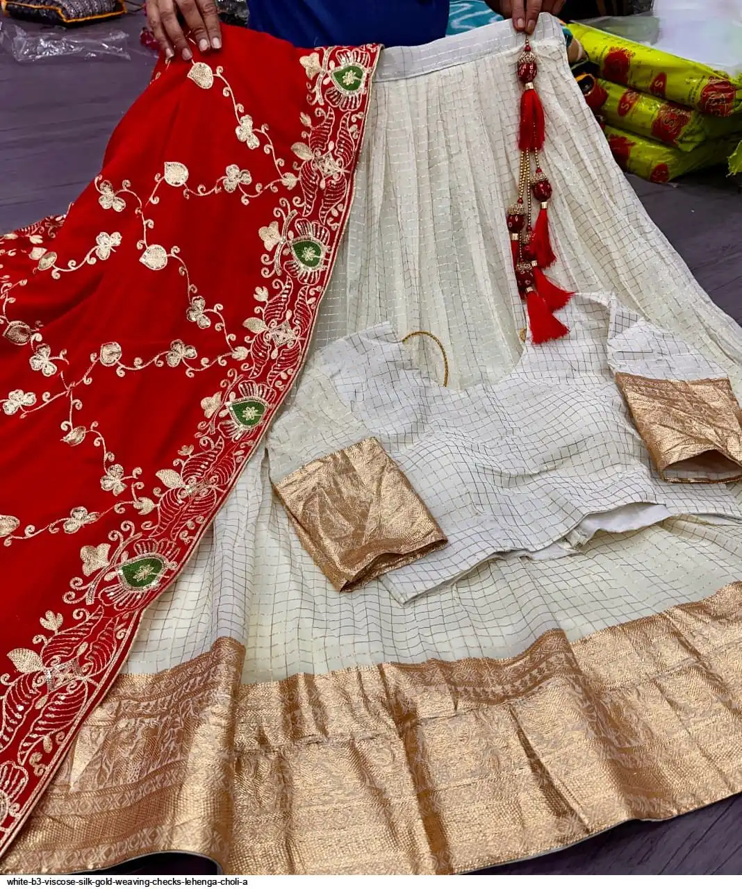 Viscose silk with designer lehenga with golden Daaman patta weaving and waist and allover Gold weaving chex