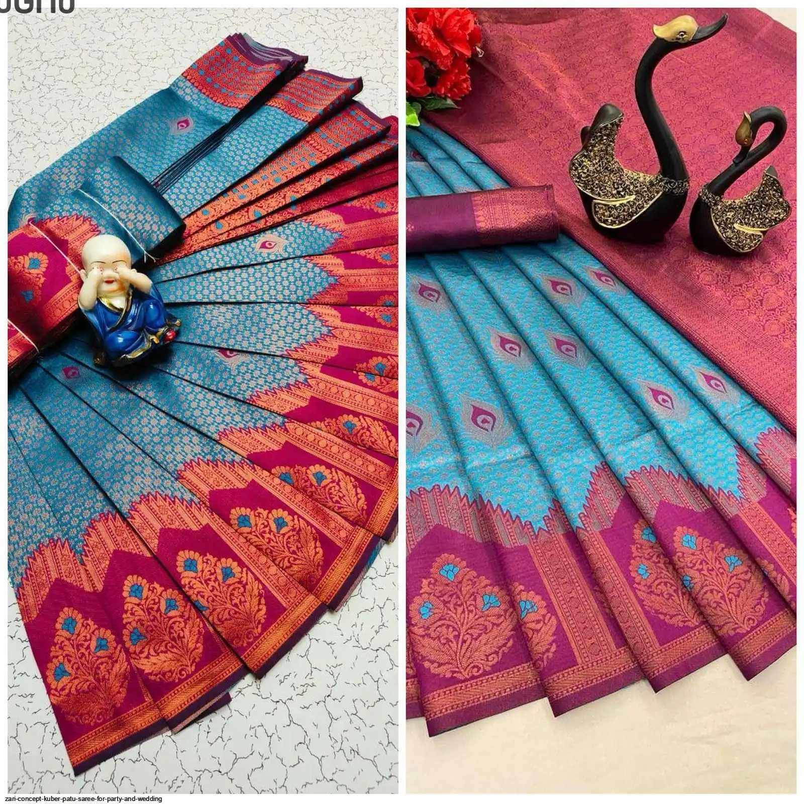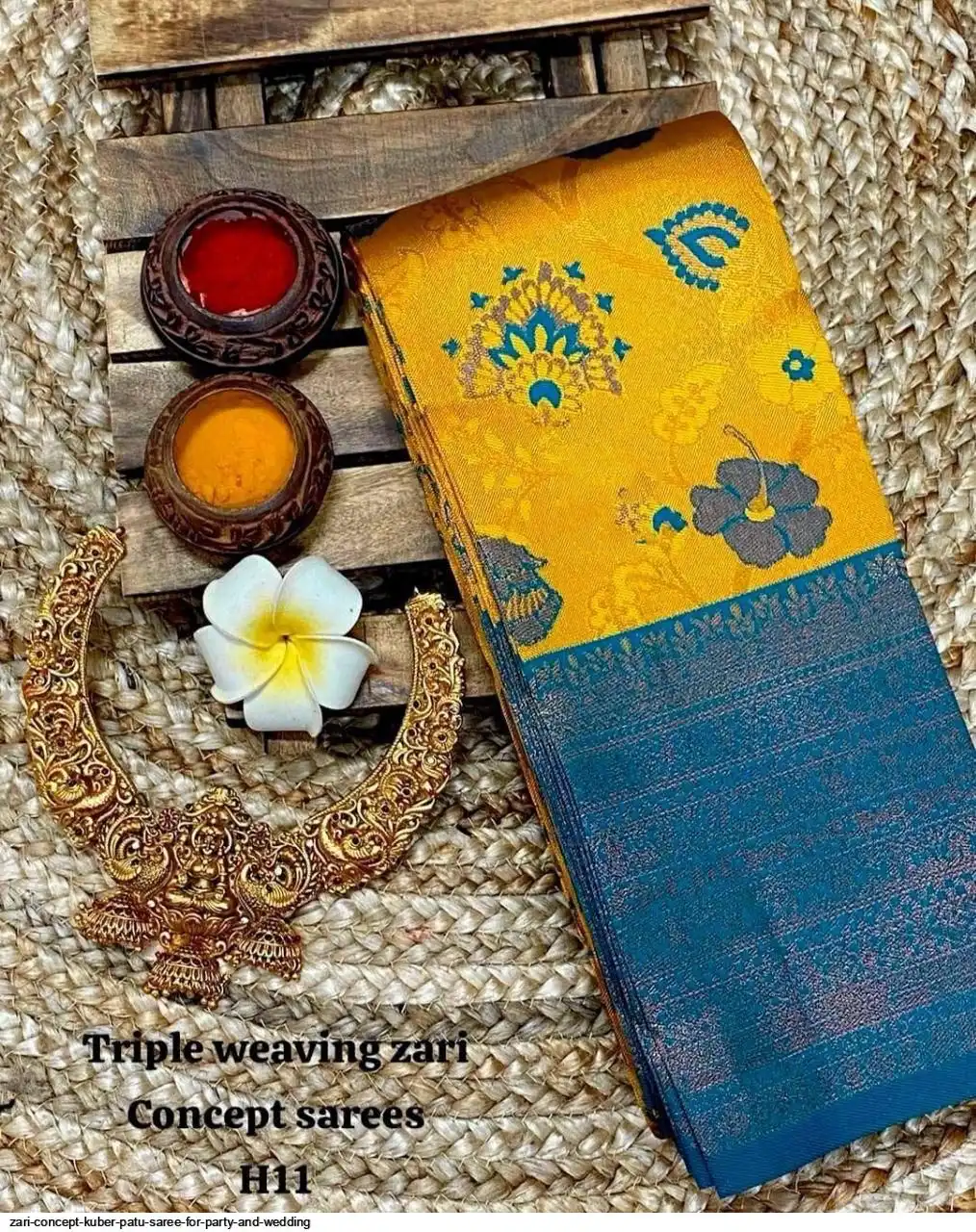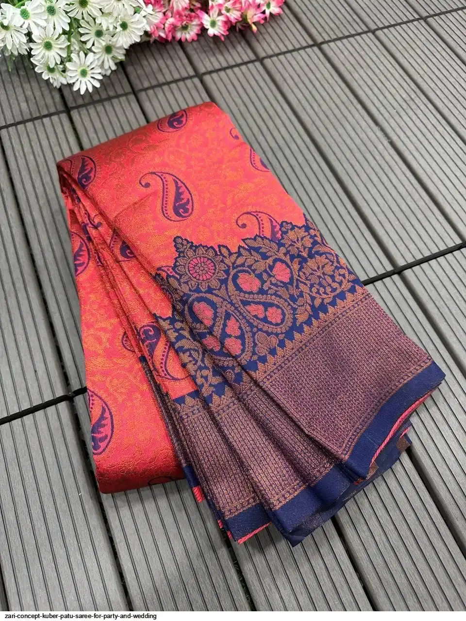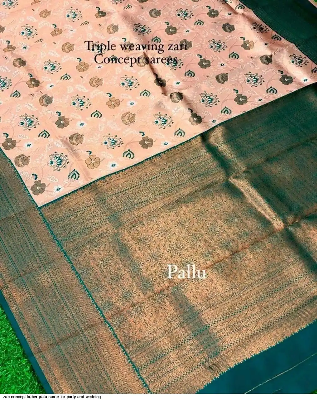 Most Stunning Triple Weaving Zari Concept Kuber patu Sarees . This concept Sarees is best for Party and wedding Occasion. This Kuber patu Kanchi Sarees is made of Pure Copper Zari and Self Design with contrast Colour Meena makes Sarees Adorable