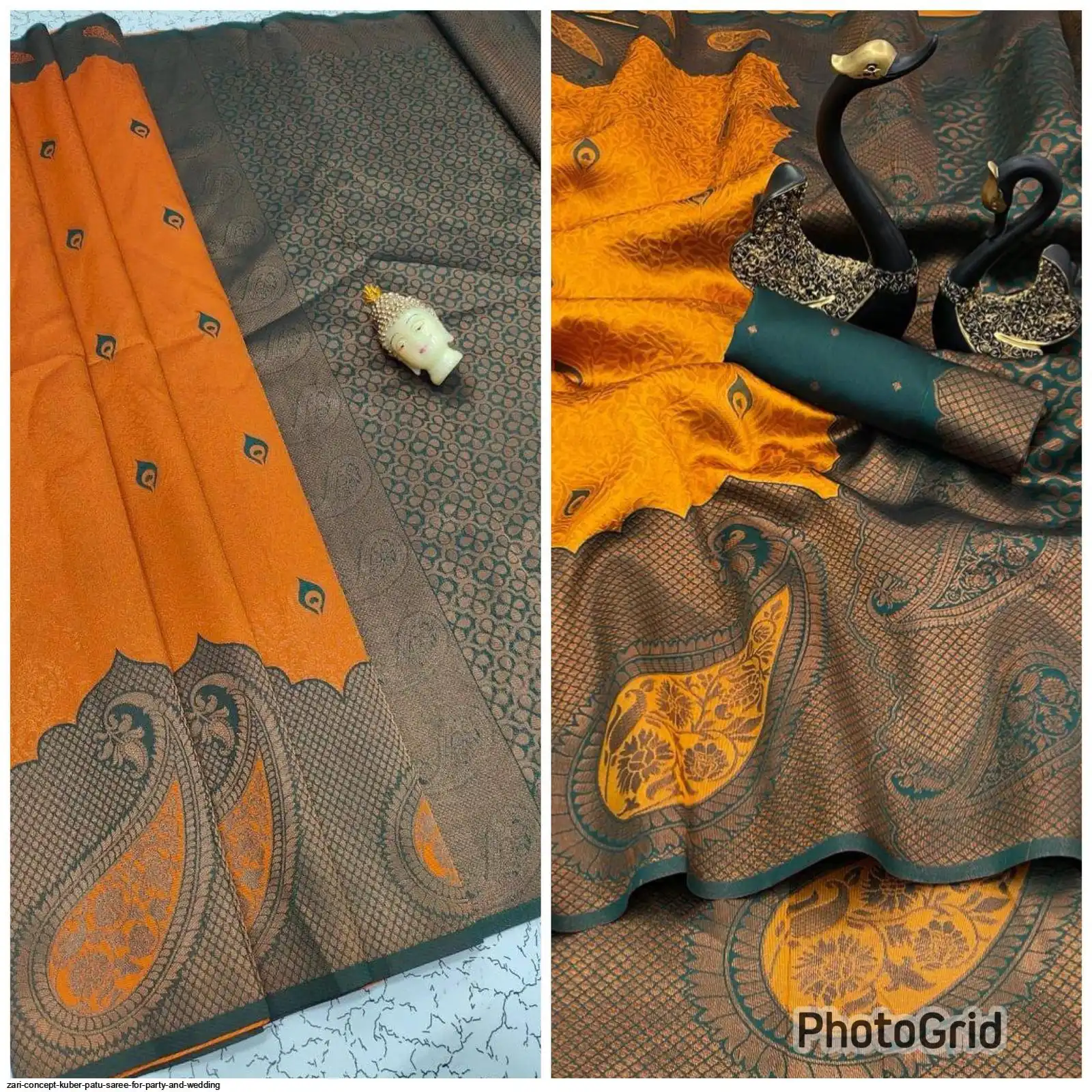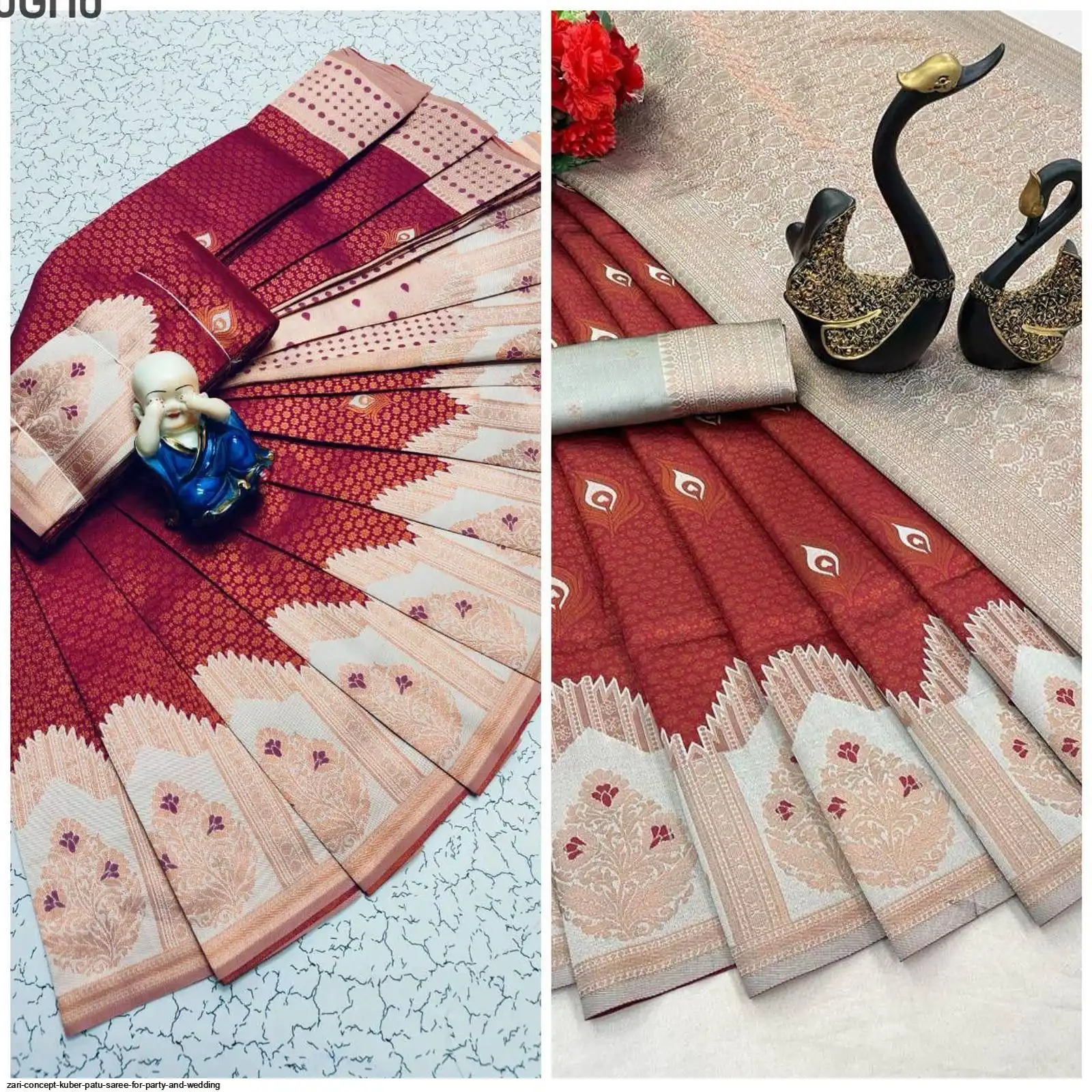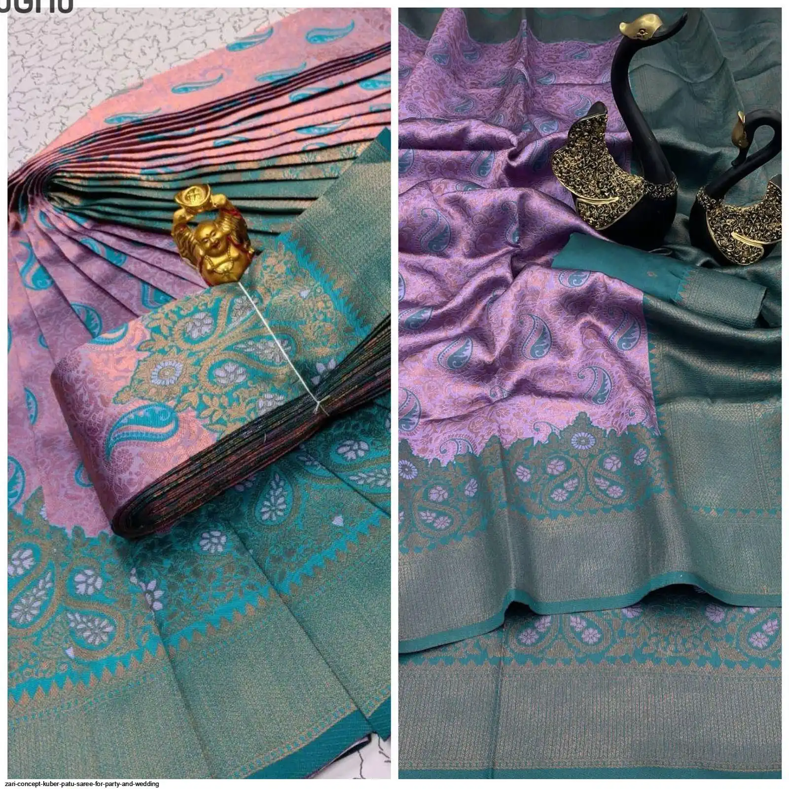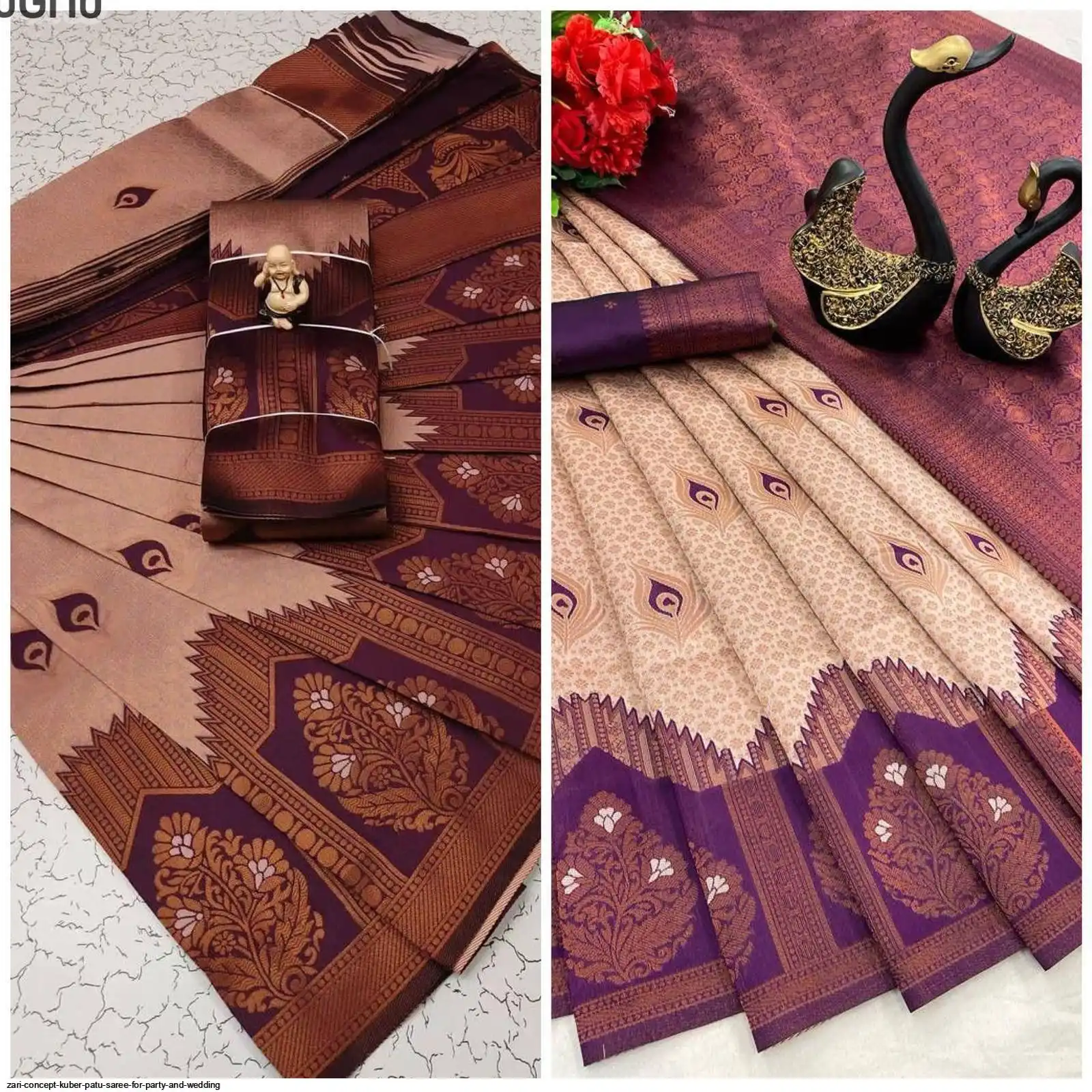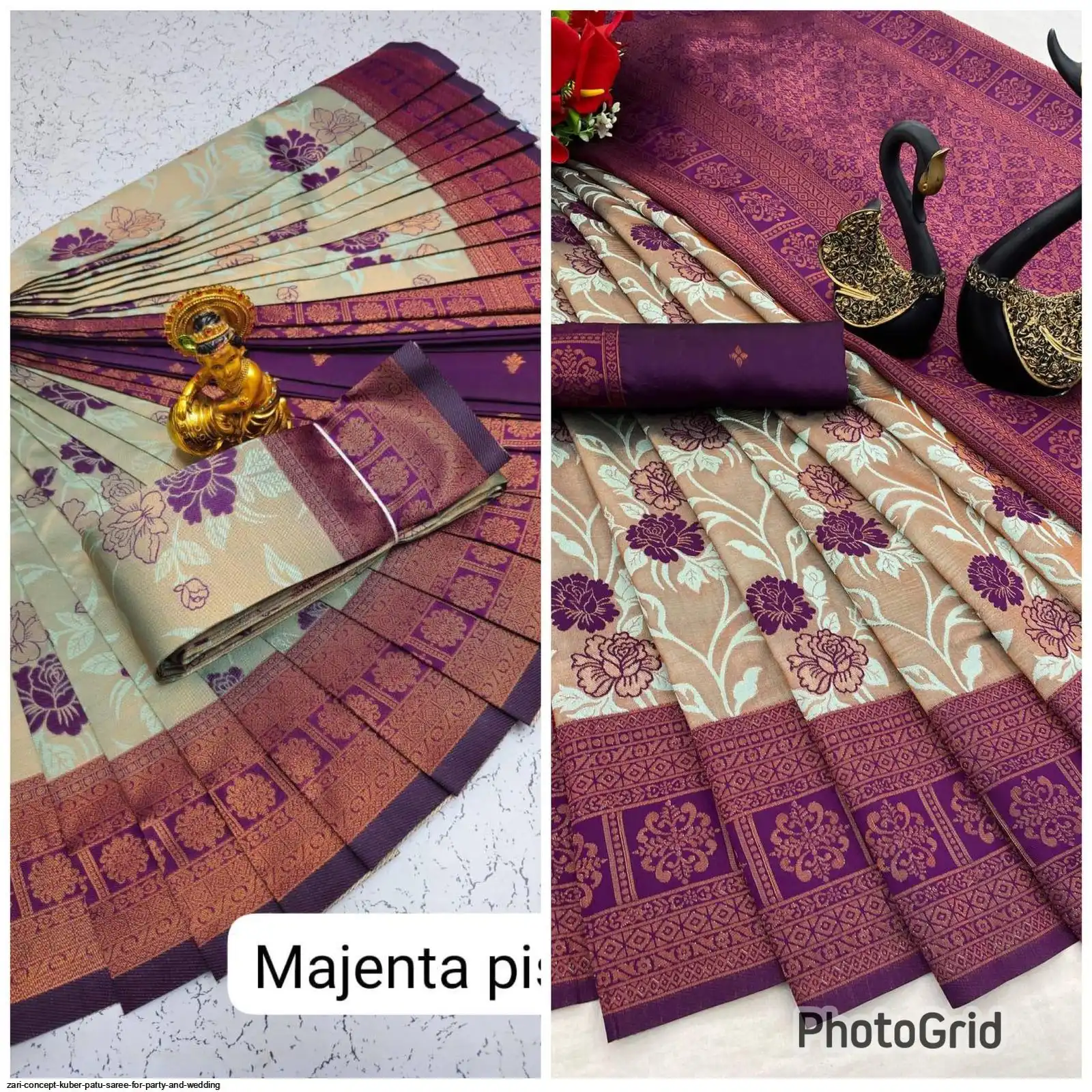 Most Stunning Triple Weaving Zari Concept Kuber patu Sarees . This concept Sarees is best for Party and wedding Occasion. This Kuber patu Kanchi Sarees is made of Pure Copper Zari and Self Design with contrast Colour Meena makes Sarees Adorable