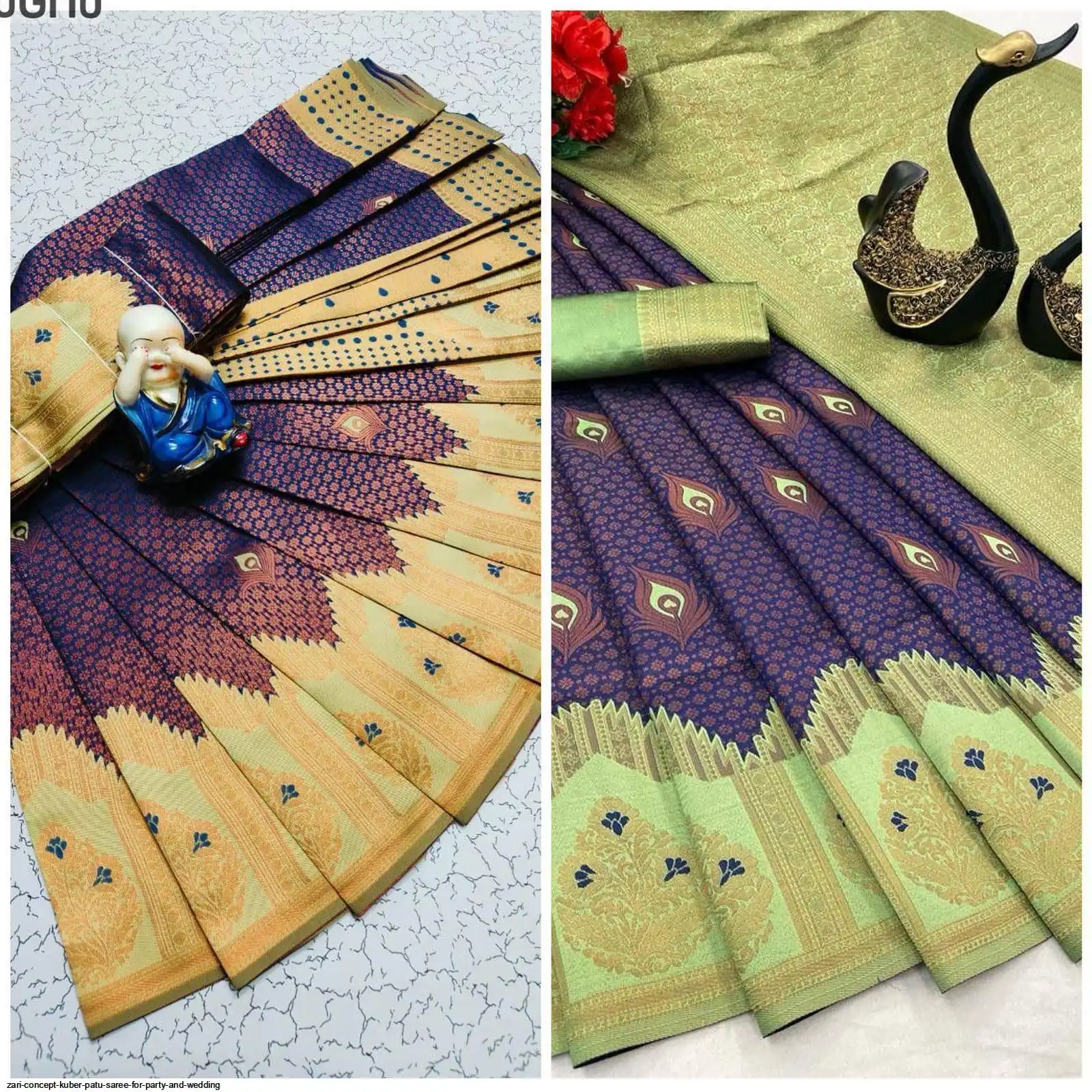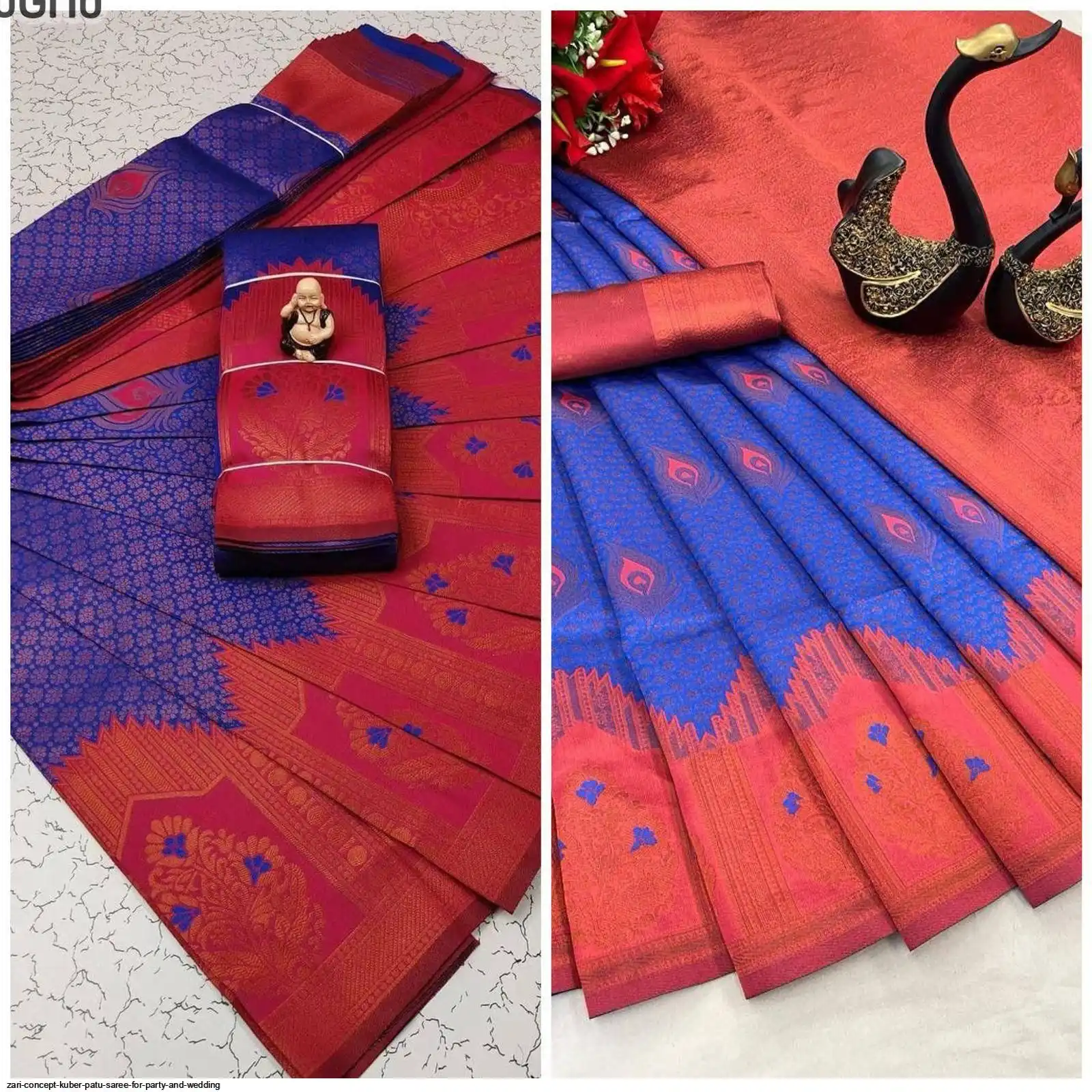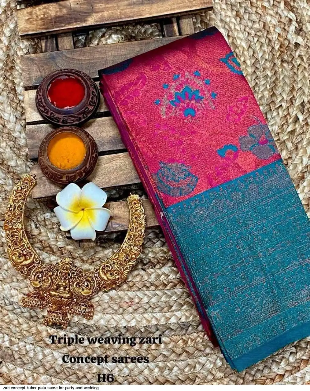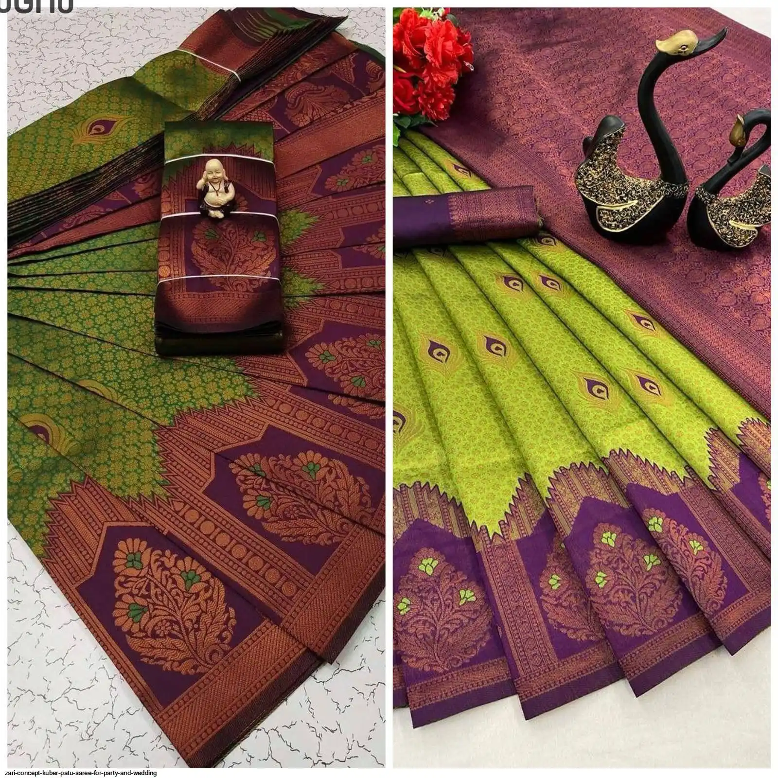 Most Stunning Triple Weaving Zari Concept Kuber patu Sarees . This concept Sarees is best for Party and wedding Occasion. This Kuber patu Kanchi Sarees is made of Pure Copper Zari and Self Design with contrast Colour Meena makes Sarees Adorable